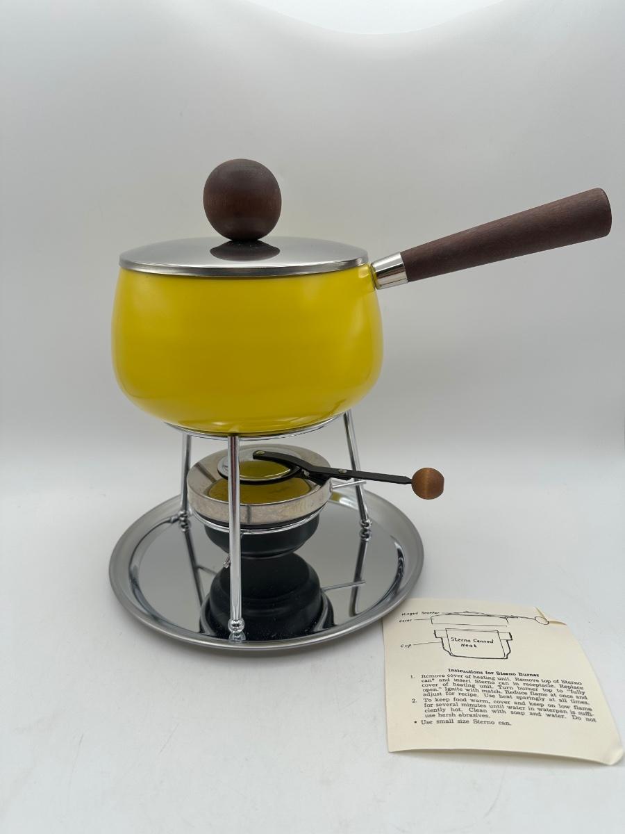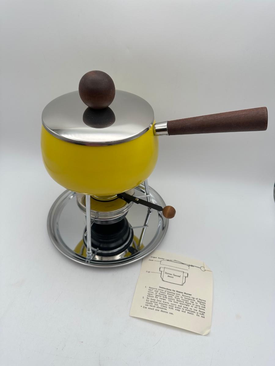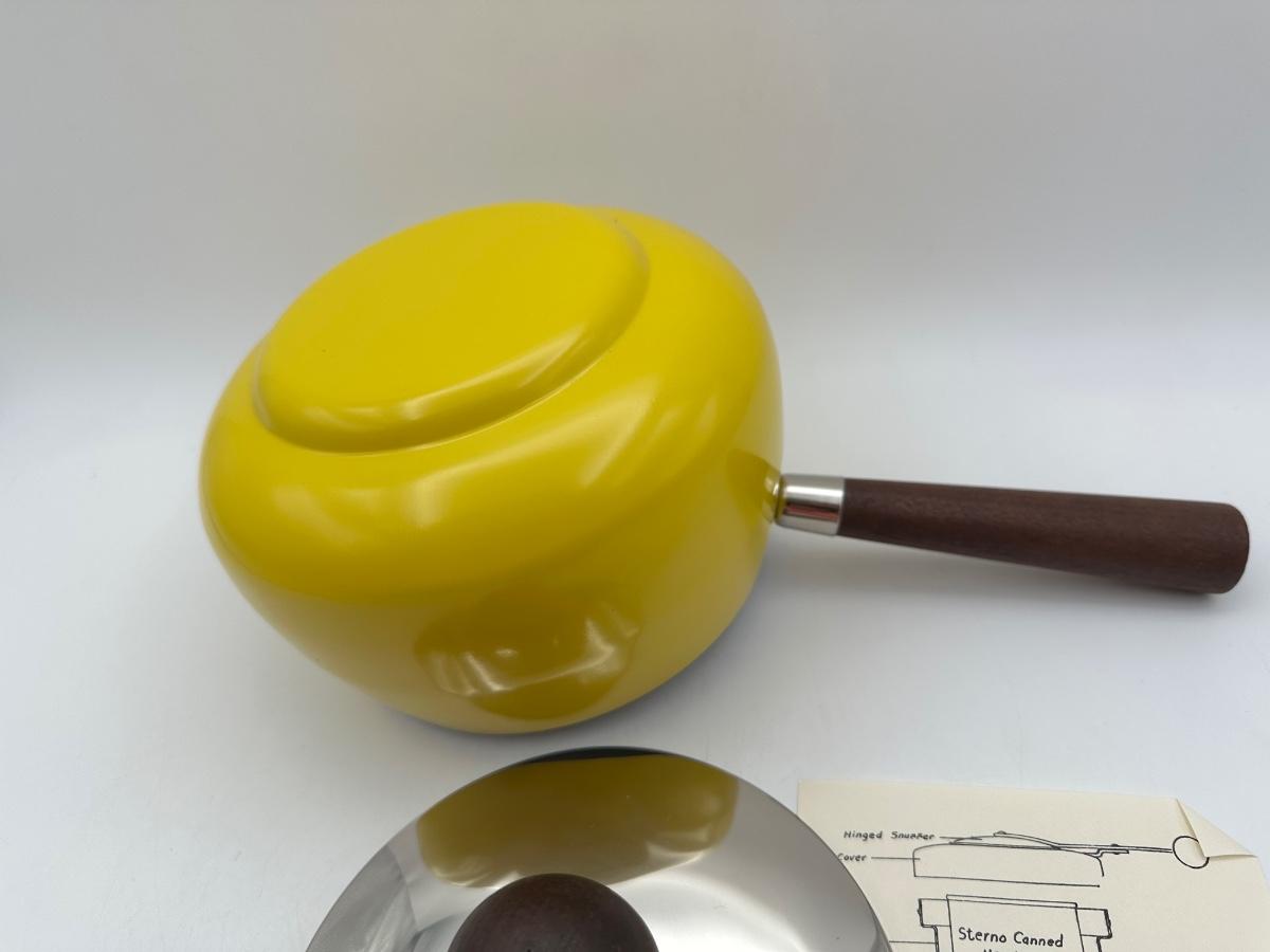 Pristine Vintage Fondue Pot in Canary Yellow, Wood Handles