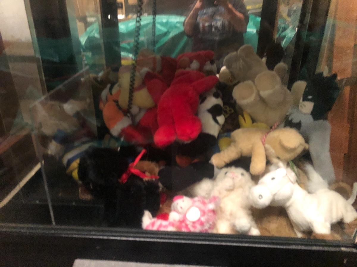 This is a huge vintage claw machine. Claw has a minor mechanical issue. This purchase comes with 8 bags of large and extra large stuffed animals