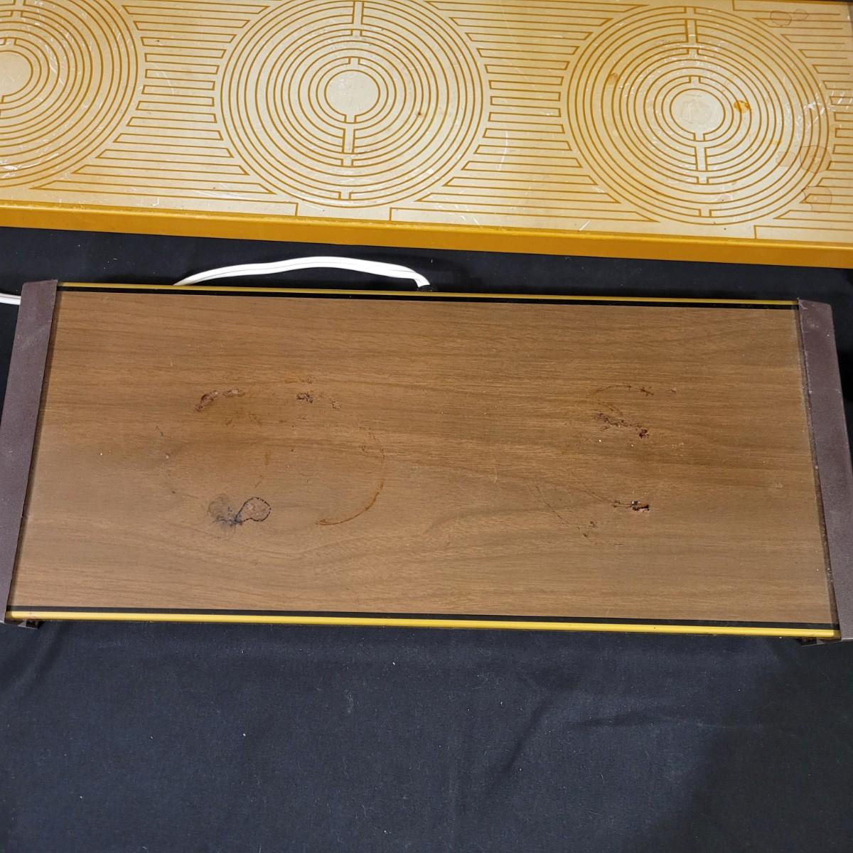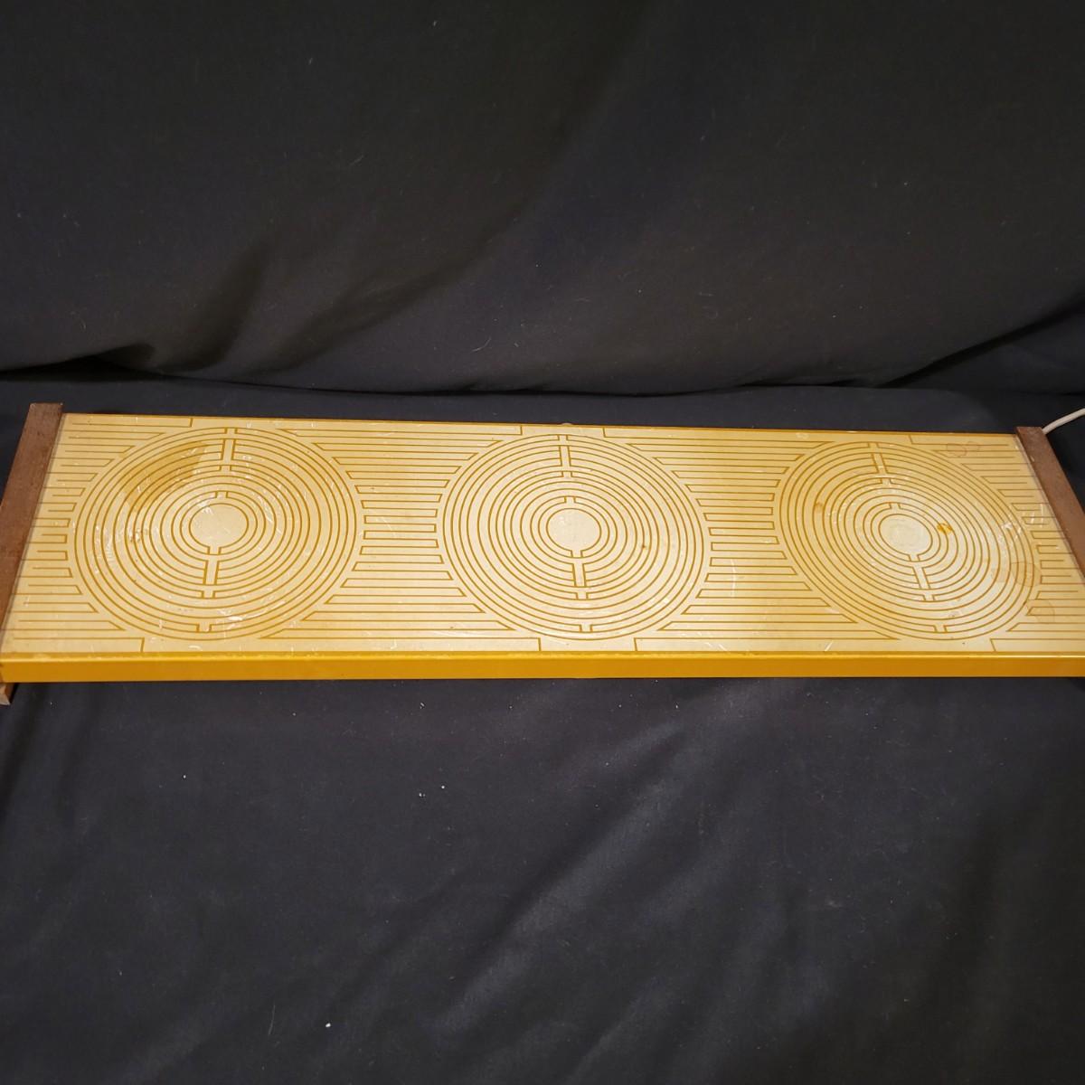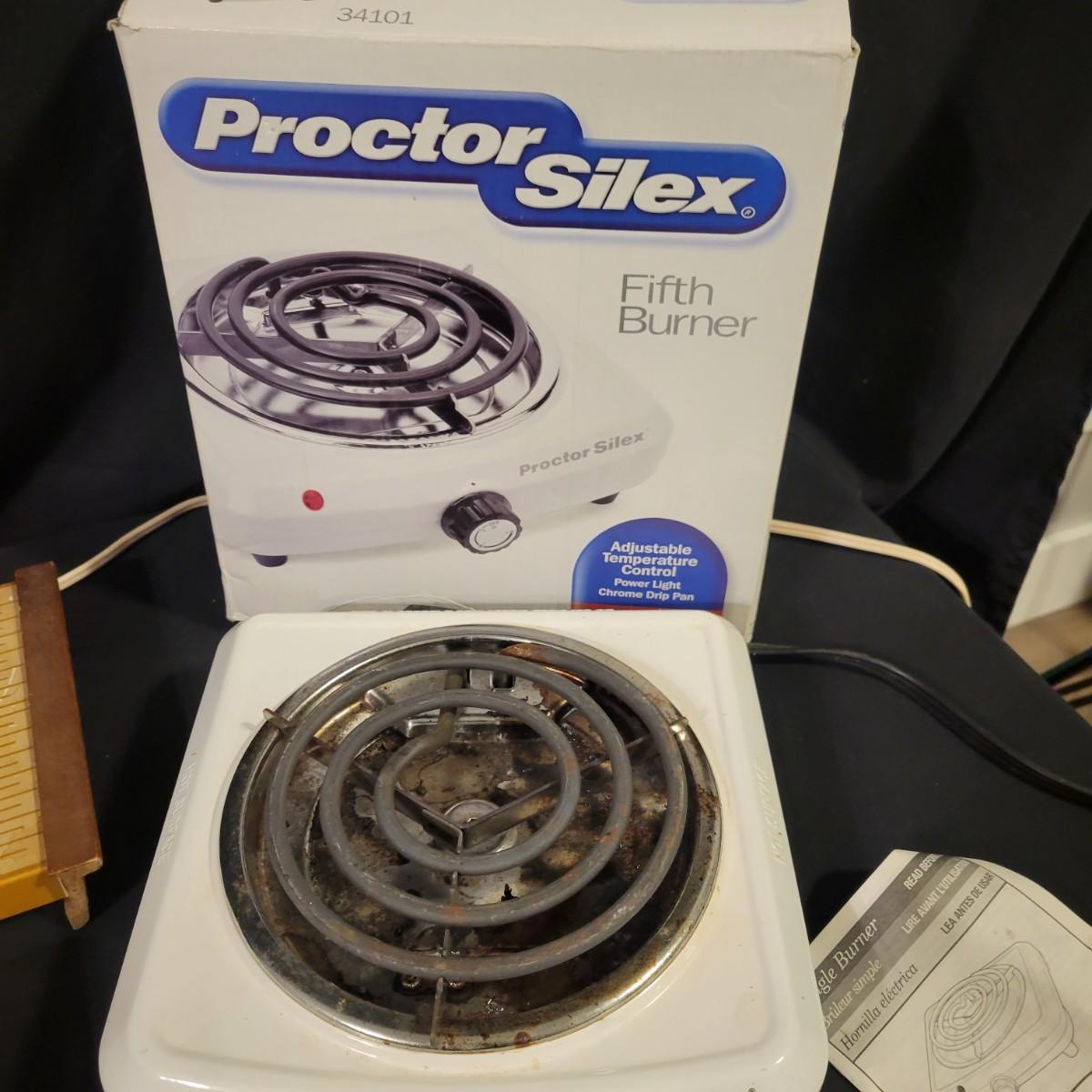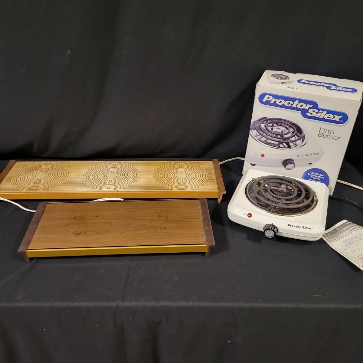 A Proctor Silex fifth burner and two vintage warming trays that all powered on when plugged in. The fifth burner has adjustable heat settings and its original packaging. Both warming trays carry a constant temp. The largest tray measures approximately 25.5" x 7.5" x 1.5"H. Shipping available
