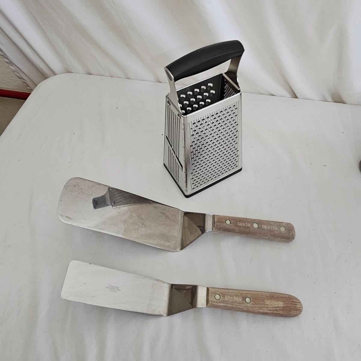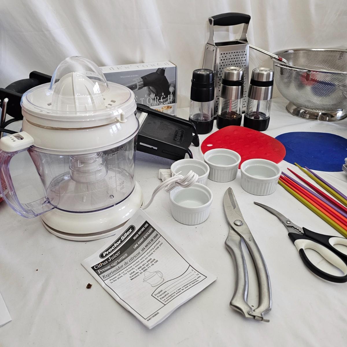 Powered juicer, toaster, mandoline, scale and more. Toaster measures 11" x 6.5" x 7"H. Large stainless collander is 11" x 13.5" x 5.5"H. Water filtration pitcher has new cartridge, test units, measures 11.5" x 6" x 10"H. Scale tested working, Toaster and juicer powered on when plugged in. Micro torch not tested, appears new. See photos for details. Shipping available.