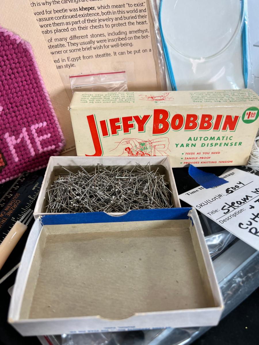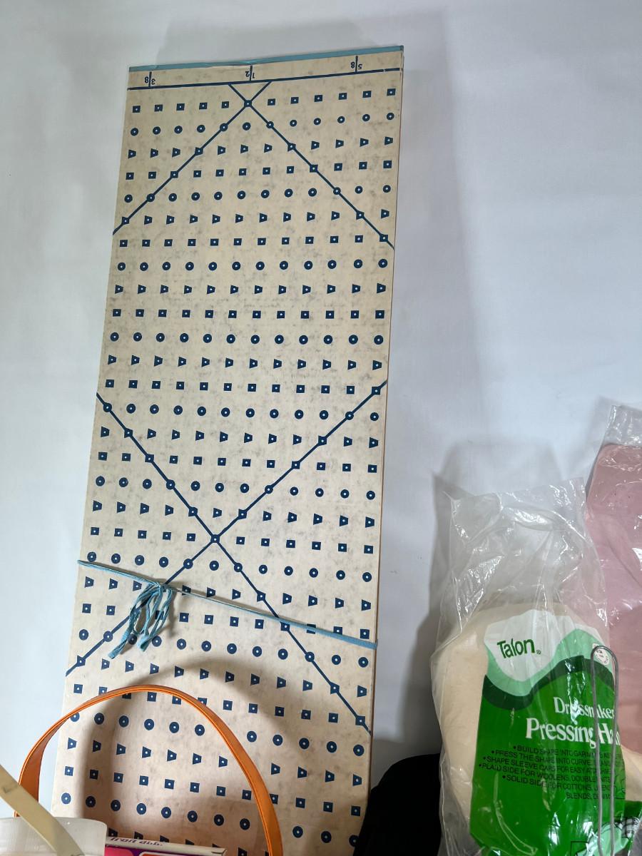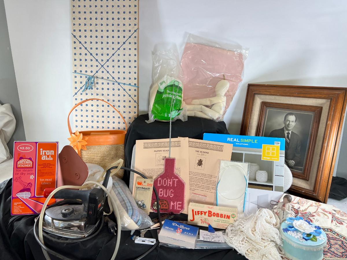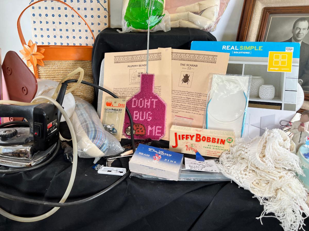 folded sewing layout board. This is what you use to put patterns on over your table or bed. Vintage straight pins, scarab, Voodoo doll kit, raffia purse, cupboard organizer.