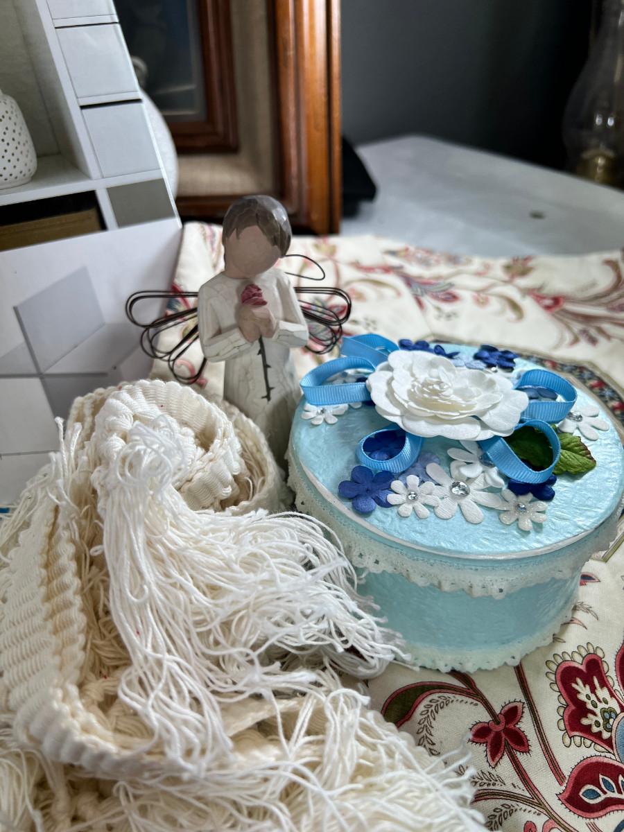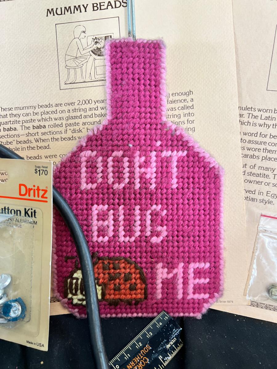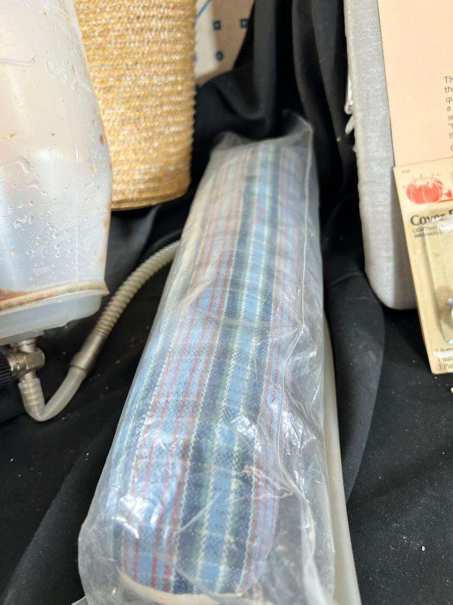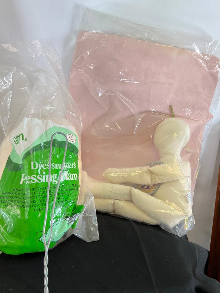 folded sewing layout board. This is what you use to put patterns on over your table or bed. Vintage straight pins, scarab, Voodoo doll kit, raffia purse, cupboard organizer.