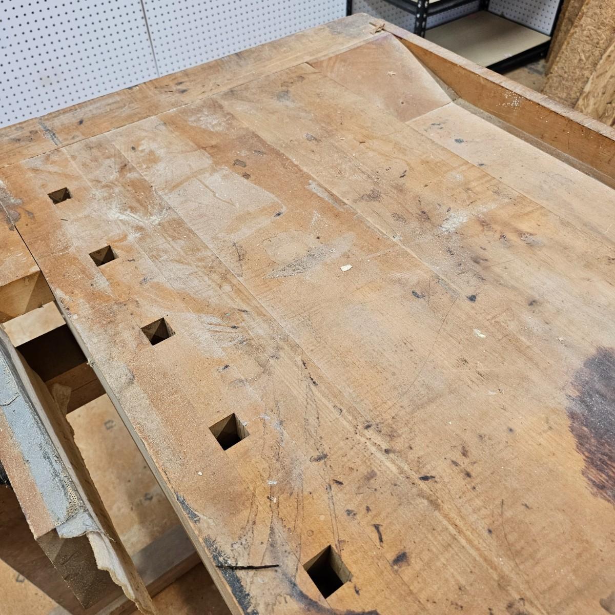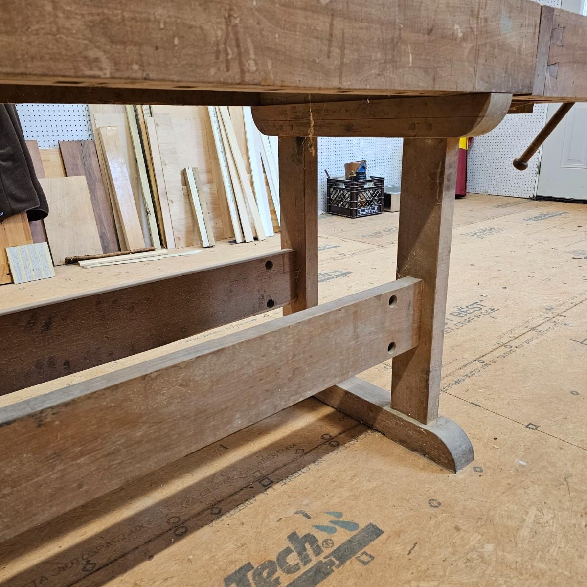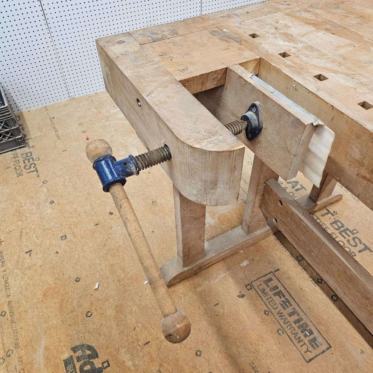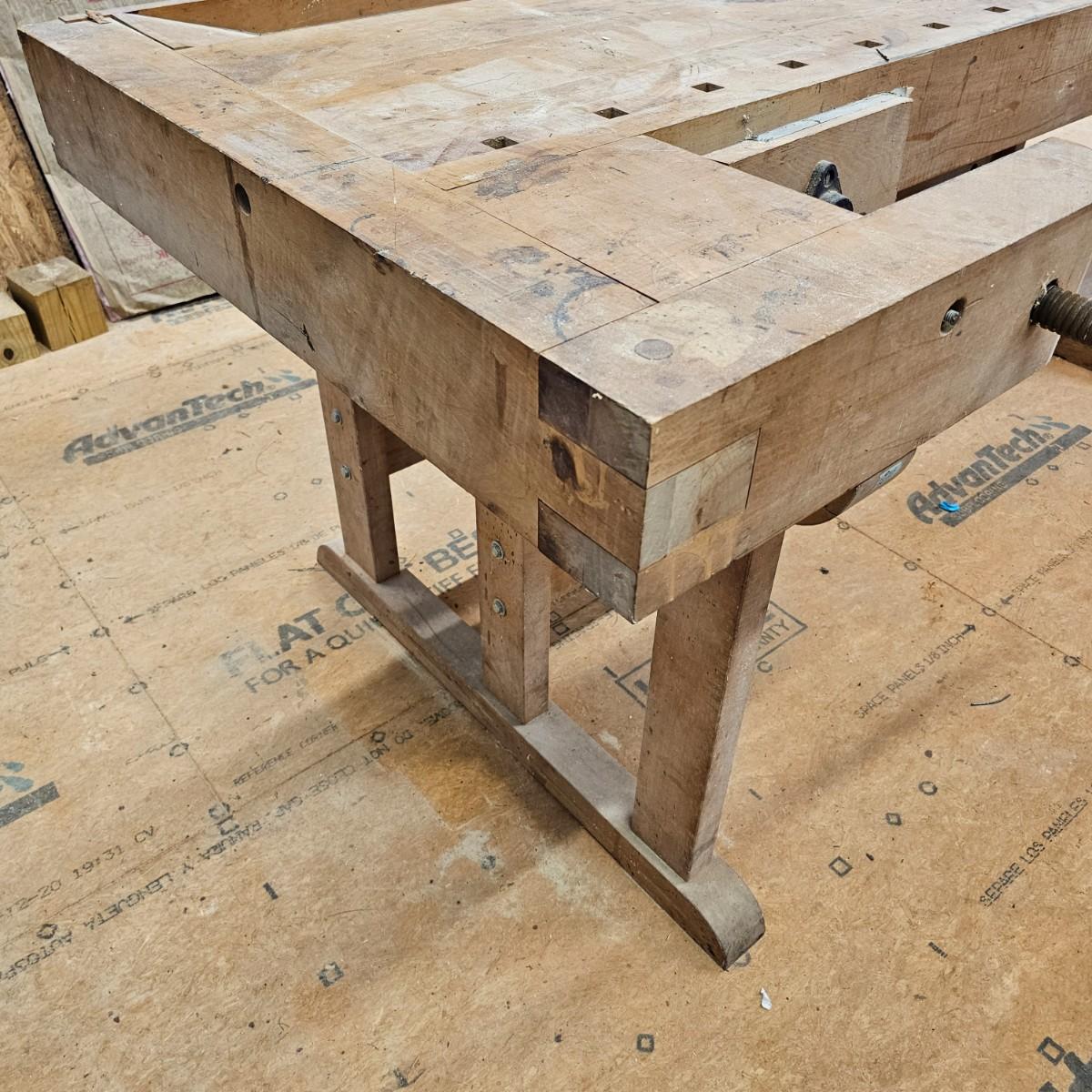 A solid professional style woodworking bench. Unit is solid wood, measures 108" x 39" x 36"H. Constructed with screws, bolts, mortise and tenon and dovetail joints. Also has two wood vises, one on each end and a recessed tray at the back to catch sawdust and pieces. Dog pin slots are situated along one side for holding work. Top is 6" thick at edges. Also includes a copy of 'The Complete Book of Woodworking', which has tips and projects with plans to build. See photos for details. This piece is very solid and very heavy. Local pickup only. Winning bidder must bring assistance to help move and load this item due to its weight and/or size.
