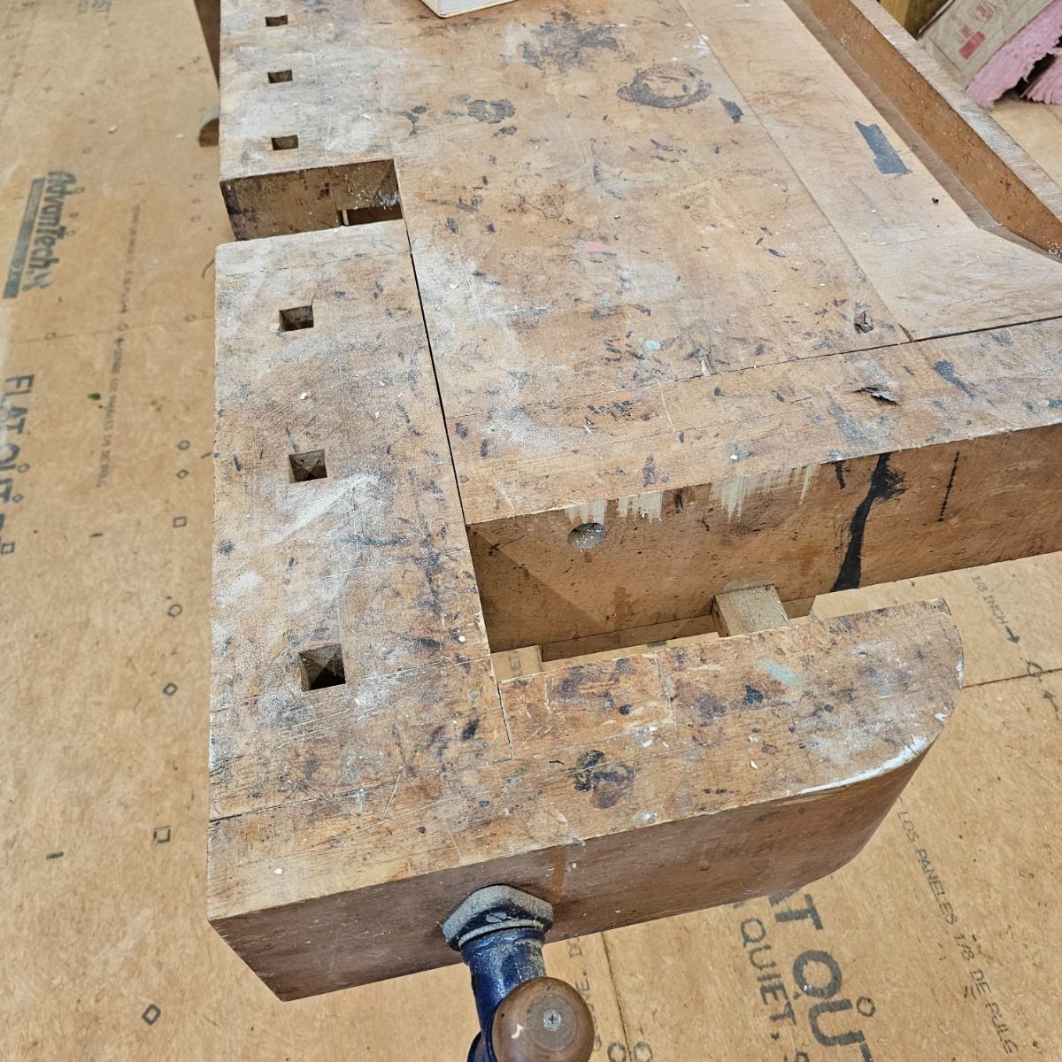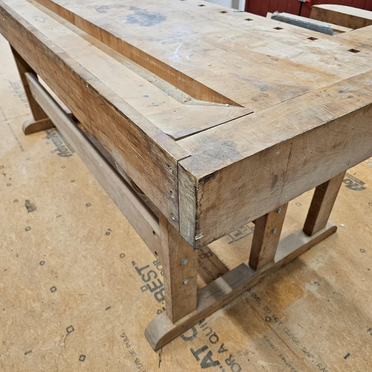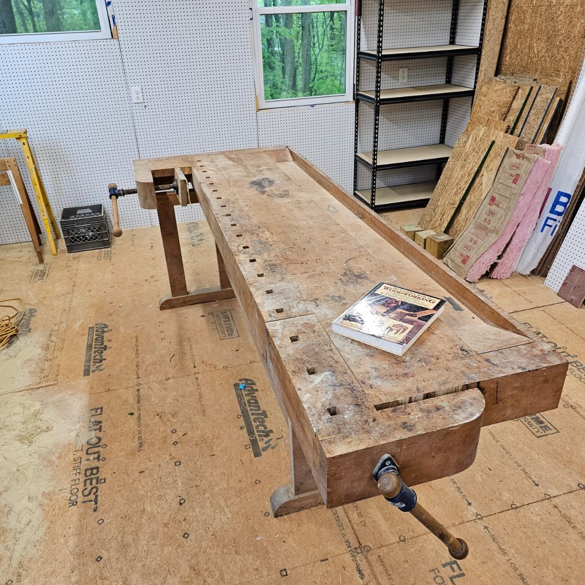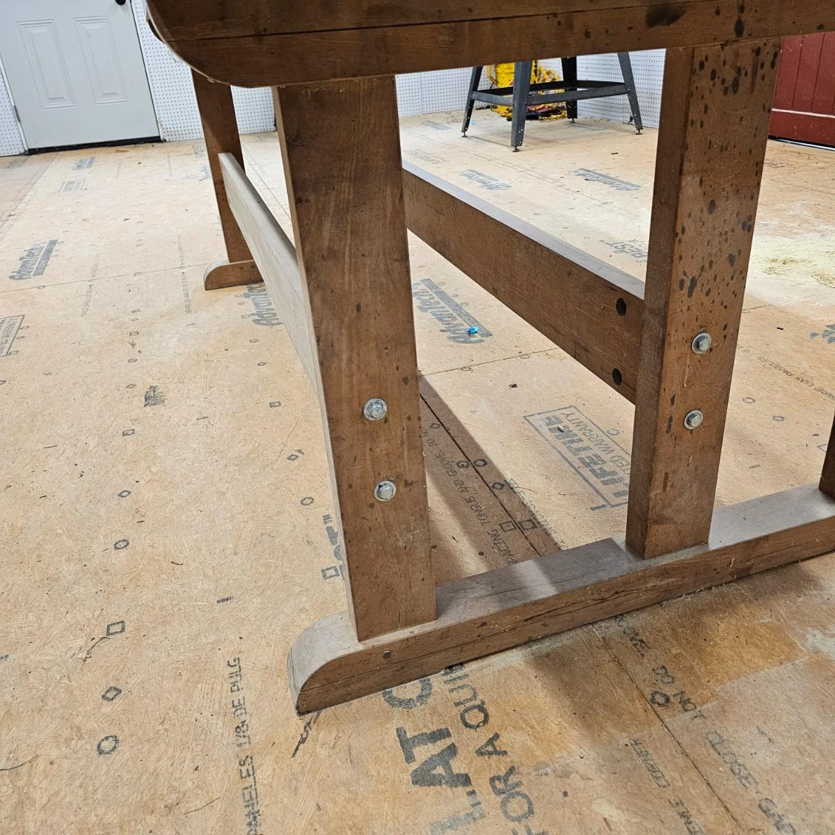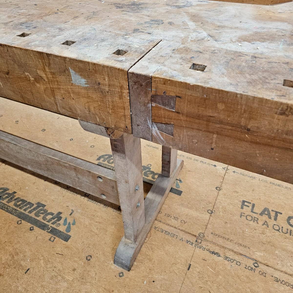 A solid professional style woodworking bench. Unit is solid wood, measures 108" x 39" x 36"H. Constructed with screws, bolts, mortise and tenon and dovetail joints. Also has two wood vises, one on each end and a recessed tray at the back to catch sawdust and pieces. Dog pin slots are situated along one side for holding work. Top is 6" thick at edges. Also includes a copy of 'The Complete Book of Woodworking', which has tips and projects with plans to build. See photos for details. This piece is very solid and very heavy. Local pickup only. Winning bidder must bring assistance to help move and load this item due to its weight and/or size.