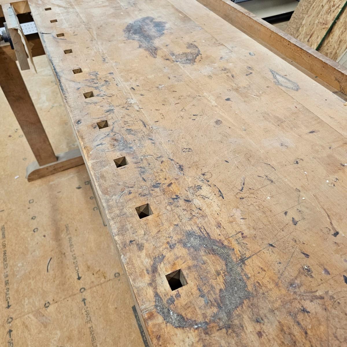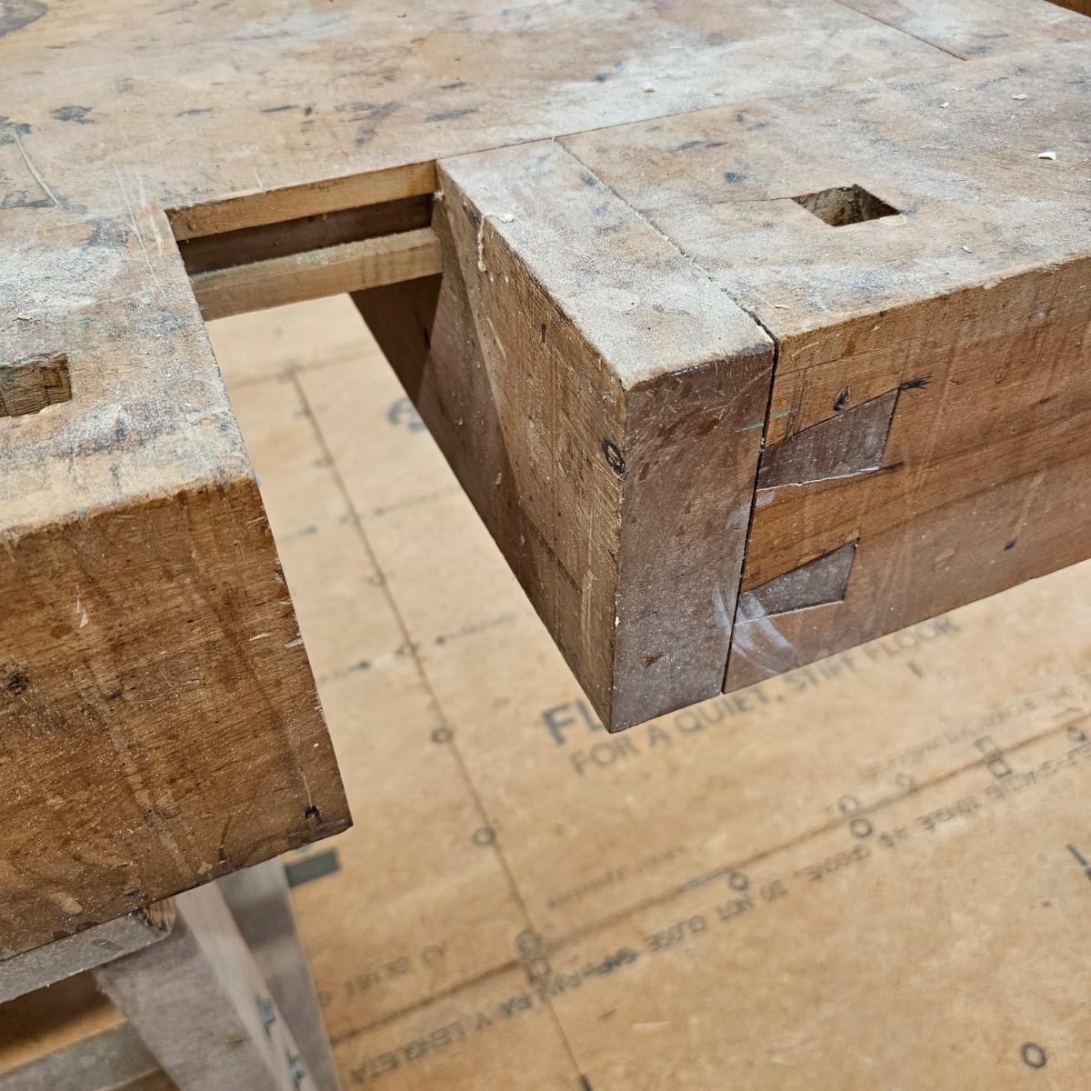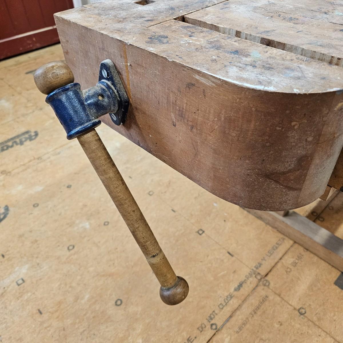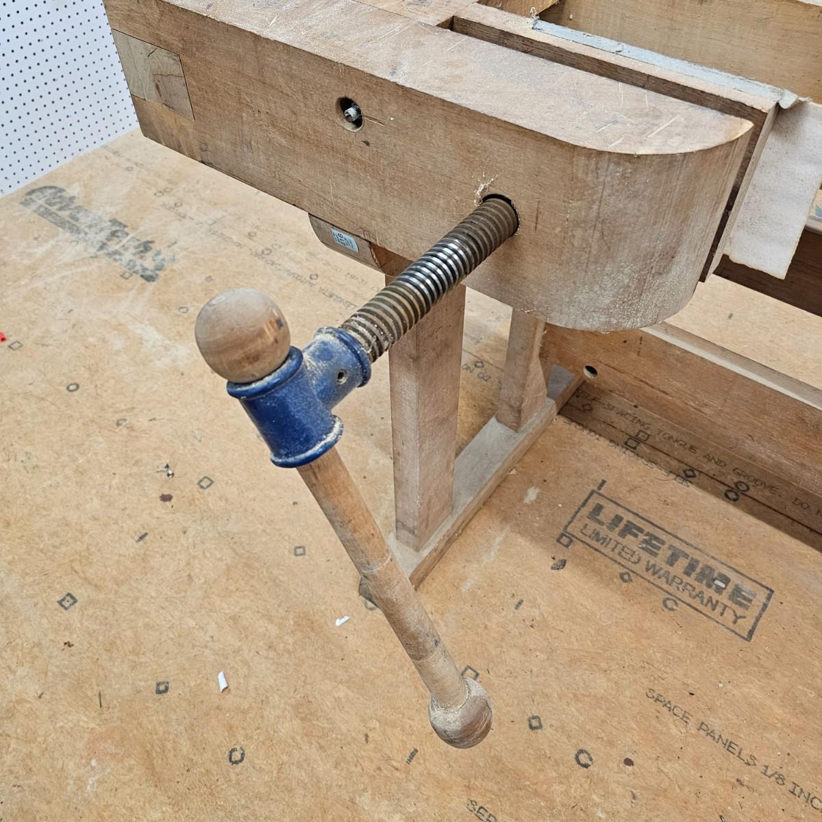A solid professional style woodworking bench. Unit is solid wood, measures 108" x 39" x 36"H. Constructed with screws, bolts, mortise and tenon and dovetail joints. Also has two wood vises, one on each end and a recessed tray at the back to catch sawdust and pieces. Dog pin slots are situated along one side for holding work. Top is 6" thick at edges. Also includes a copy of 'The Complete Book of Woodworking', which has tips and projects with plans to build. See photos for details. This piece is very solid and very heavy. Local pickup only. Winning bidder must bring assistance to help move and load this item due to its weight and/or size.