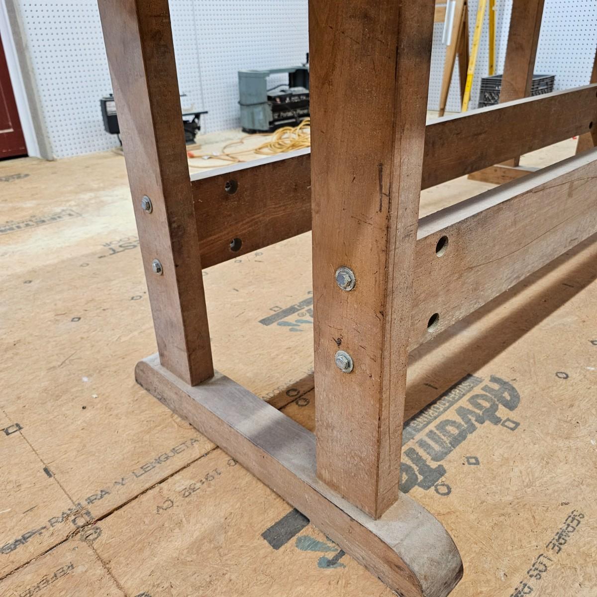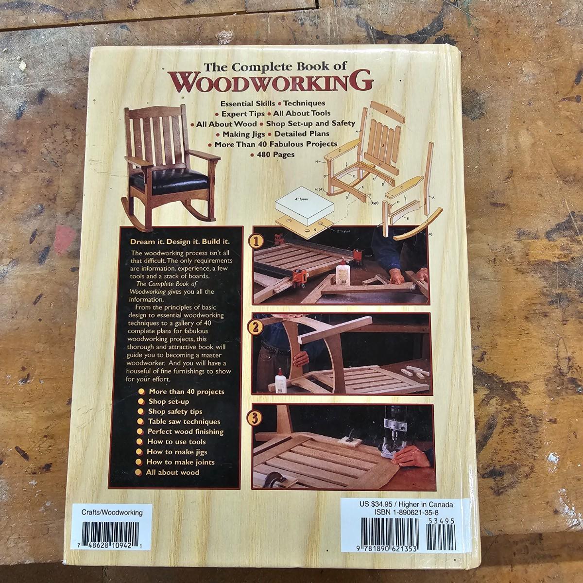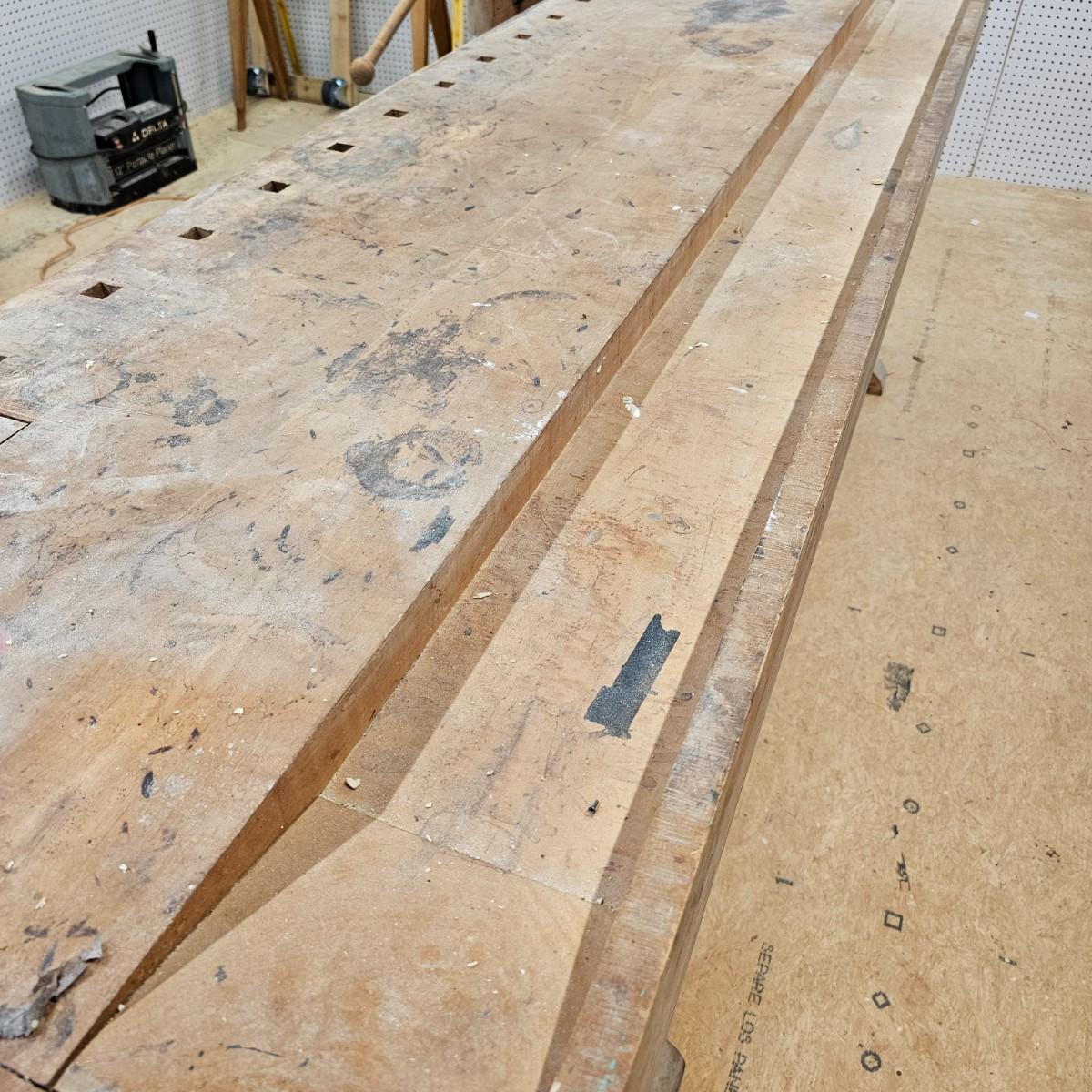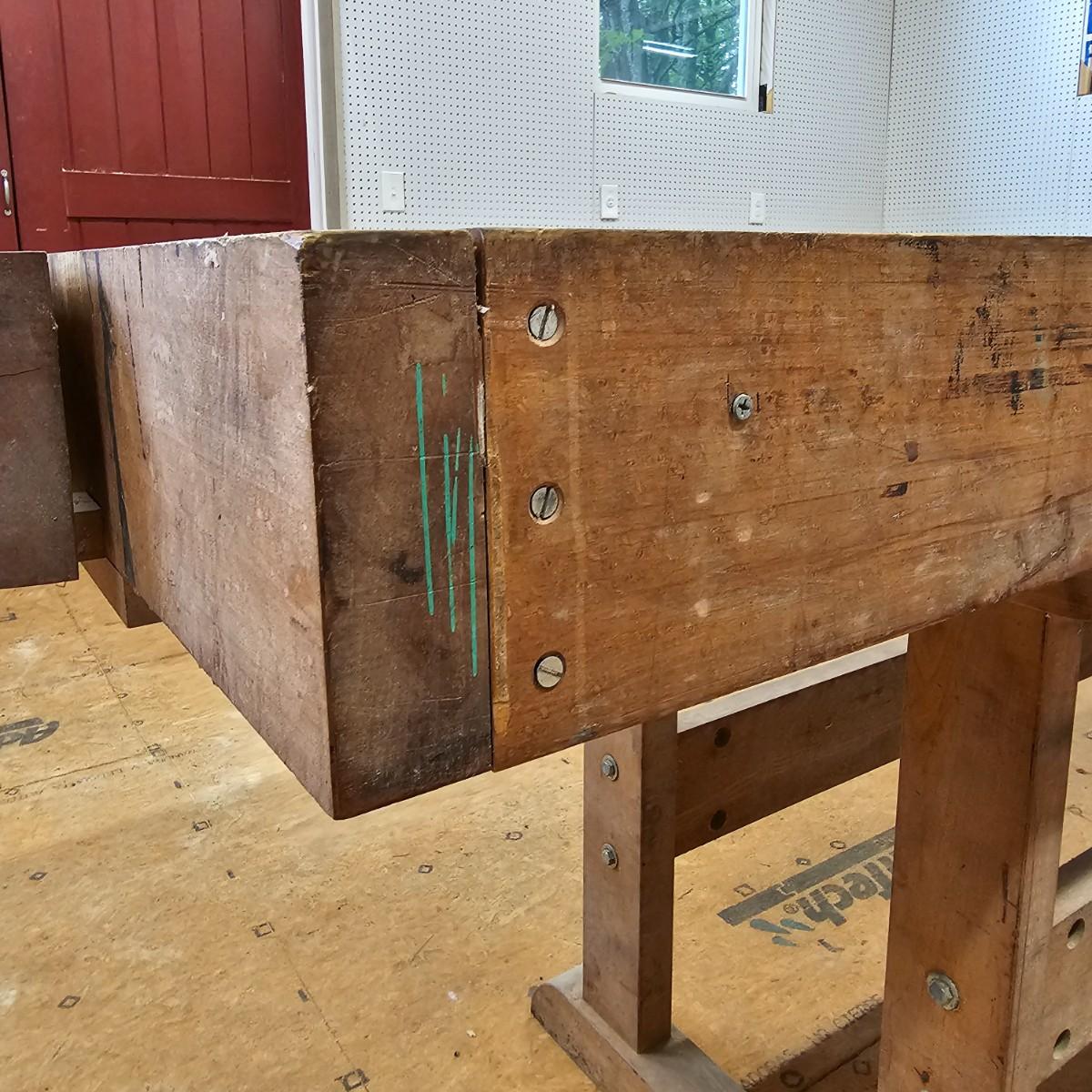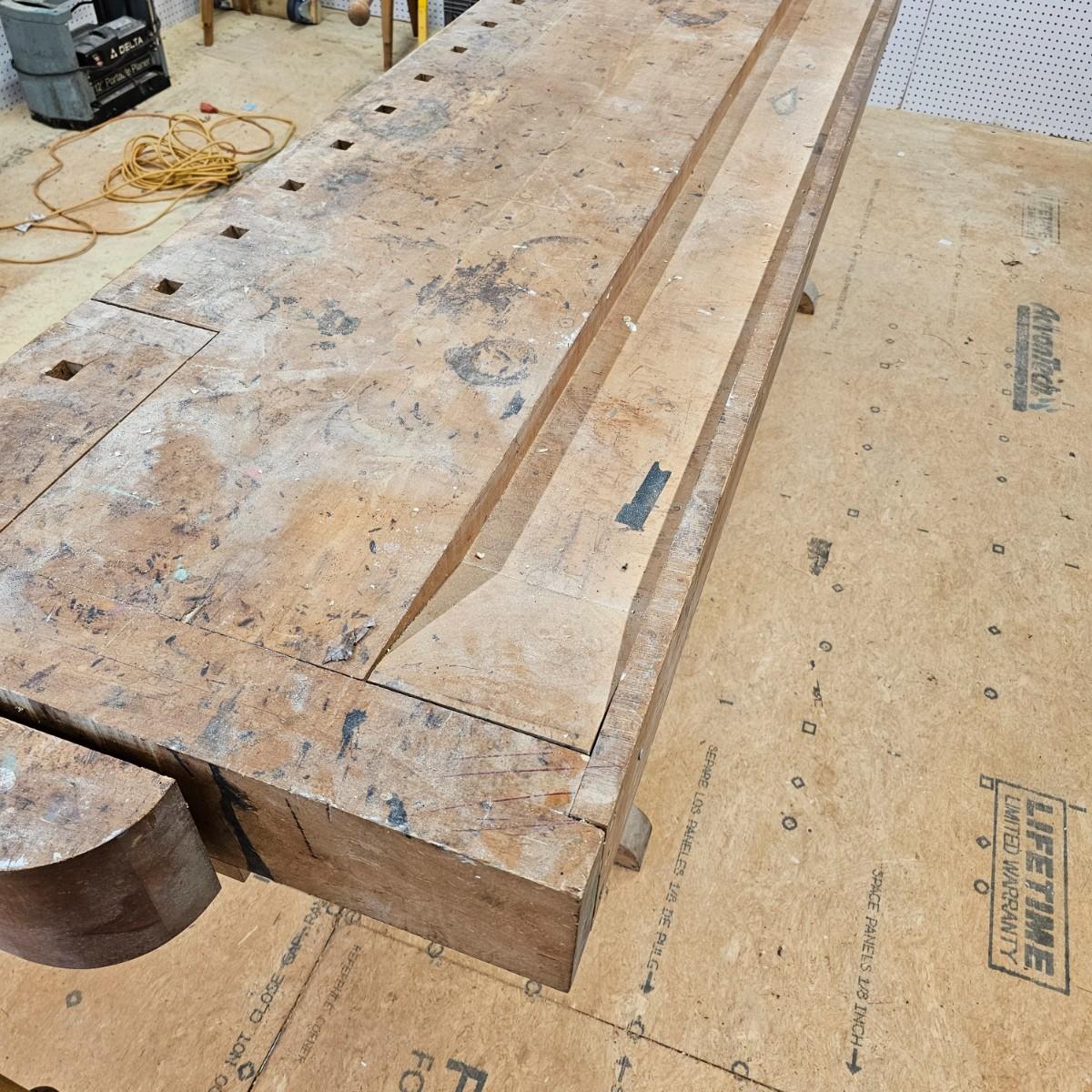 A solid professional style woodworking bench. Unit is solid wood, measures 108" x 39" x 36"H. Constructed with screws, bolts, mortise and tenon and dovetail joints. Also has two wood vises, one on each end and a recessed tray at the back to catch sawdust and pieces. Dog pin slots are situated along one side for holding work. Top is 6" thick at edges. Also includes a copy of 'The Complete Book of Woodworking', which has tips and projects with plans to build. See photos for details. This piece is very solid and very heavy. Local pickup only. Winning bidder must bring assistance to help move and load this item due to its weight and/or size.