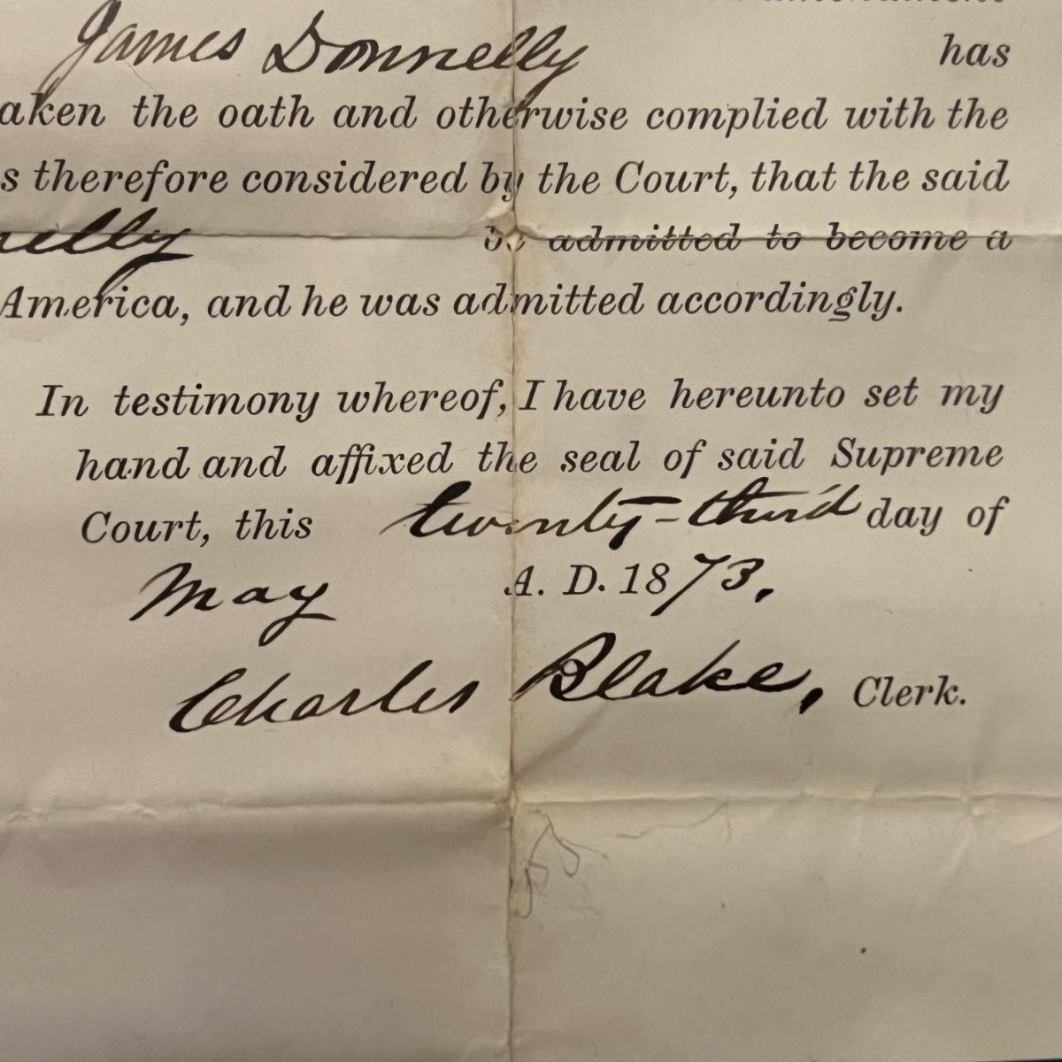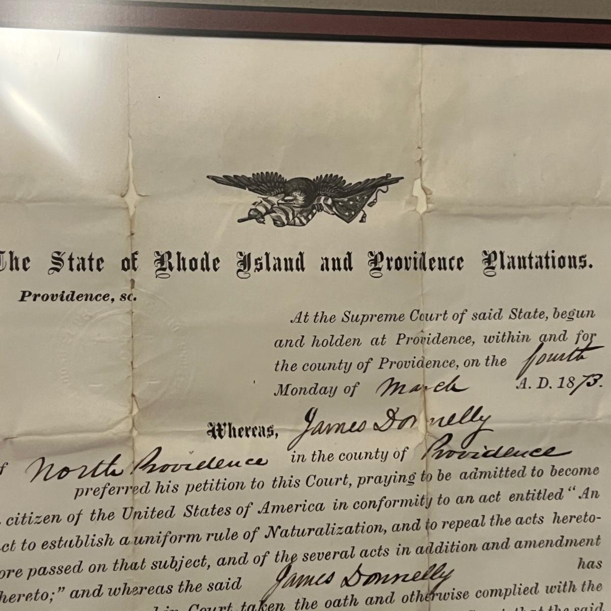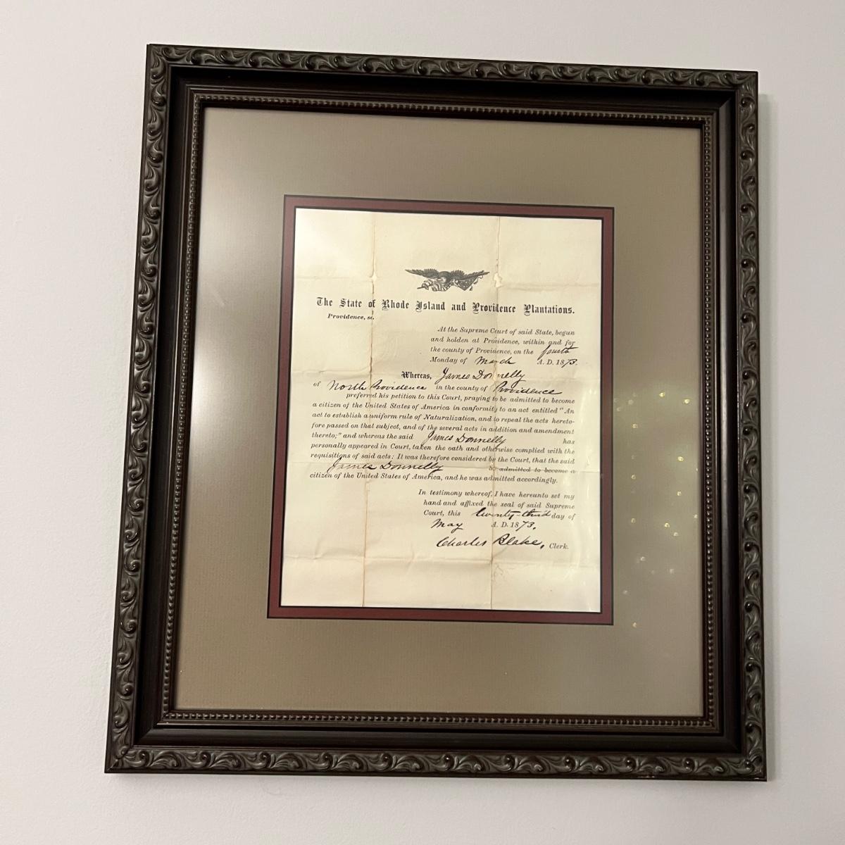 Professionally Framed 1873 Citizenship Document Providence Co., Rhode Island