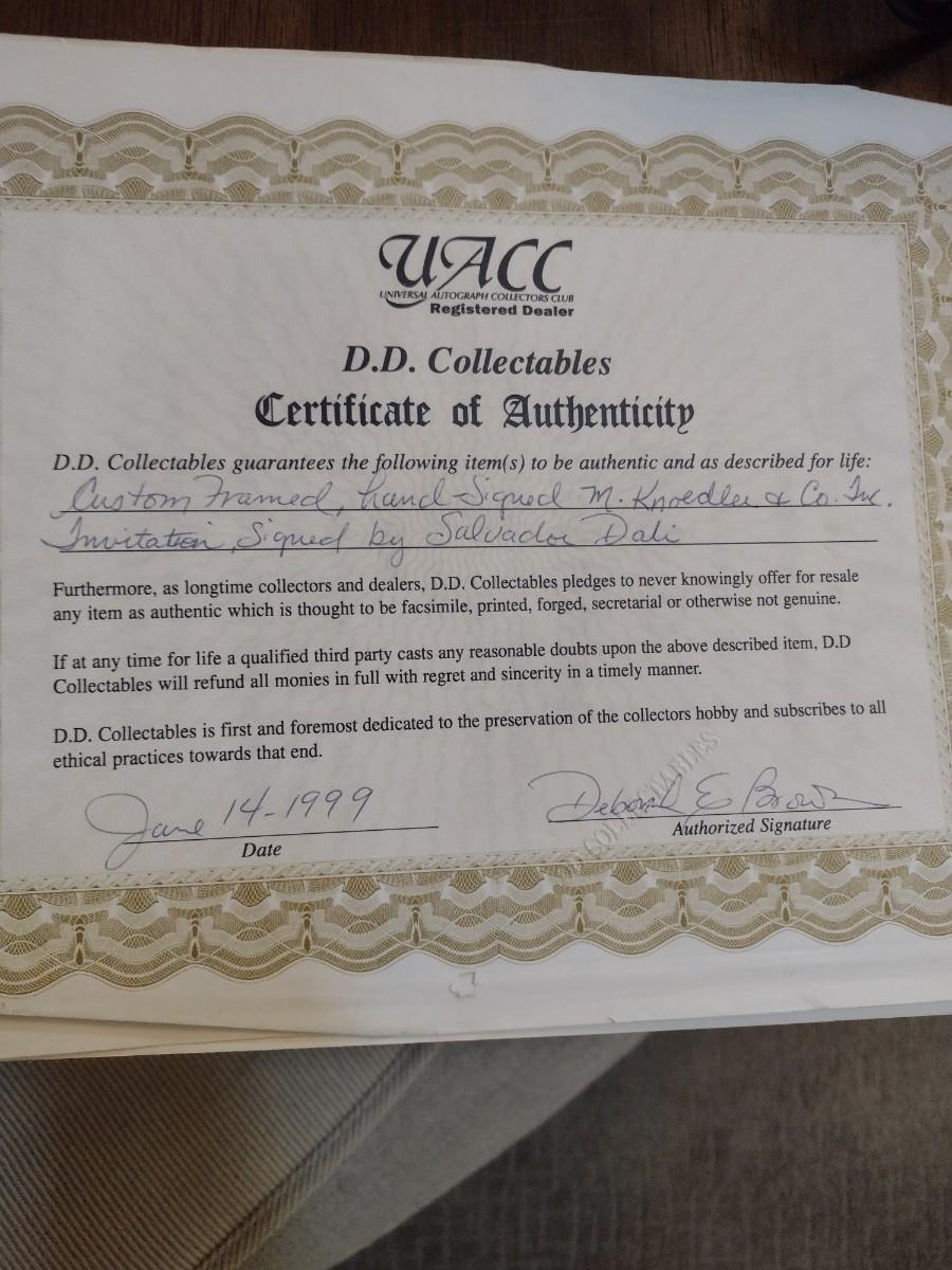 Professionally Framed Hand Signed M. Knoedler and Co. Invitation by Salvador Dali with C.O.A. third party only shipping via UPS Store or other local pack and ship company. Auction firm will ensure item is delivered to shipping facility of buyer's choice near the 28792 area code.