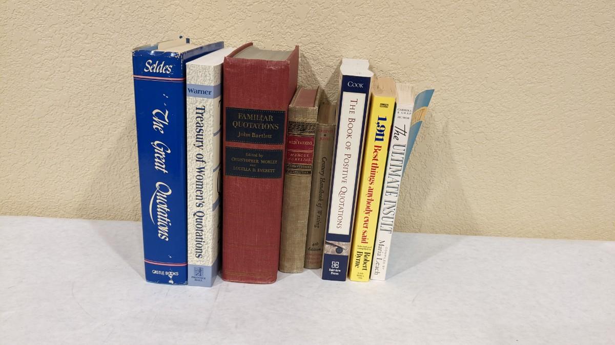 8 varied hardcover and softback books covering the great quotations of our time. Inludes a novelty insult book that's a riot as well as mid century installments. A very fun little lot.