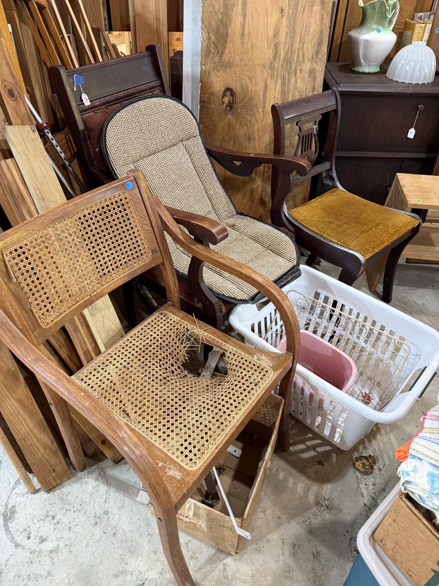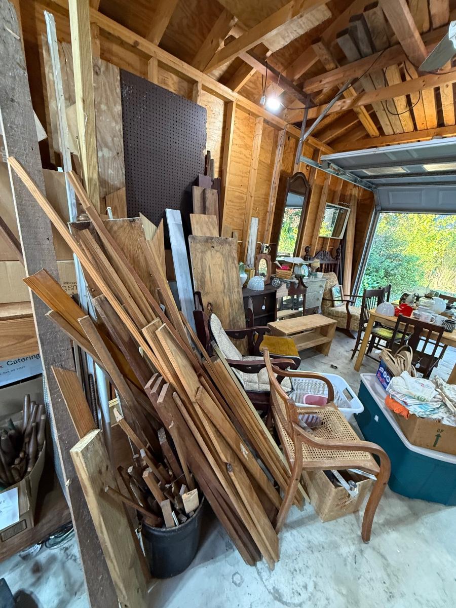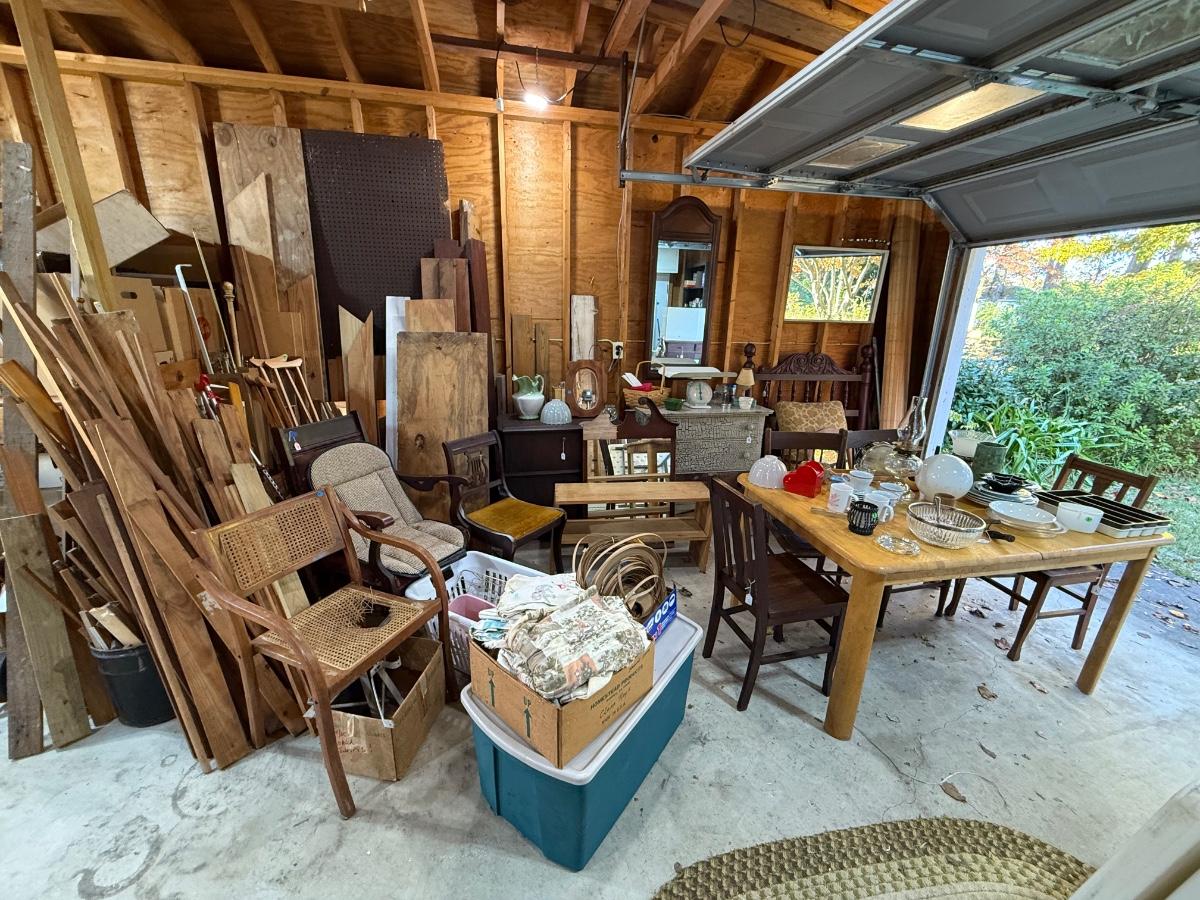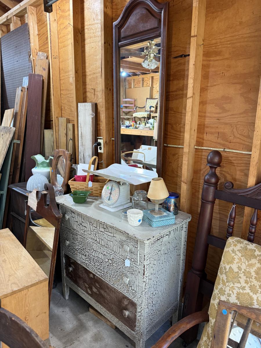 Garage 3: table, miscellaneous kitchen & decor, rocker, early twin bed, dresser, cabinet, scrap wood, curtain rods, project chairs, reupholstering supplies, mirrors, baby scale, lantern, pitcher, storage contain, laundry basket & more