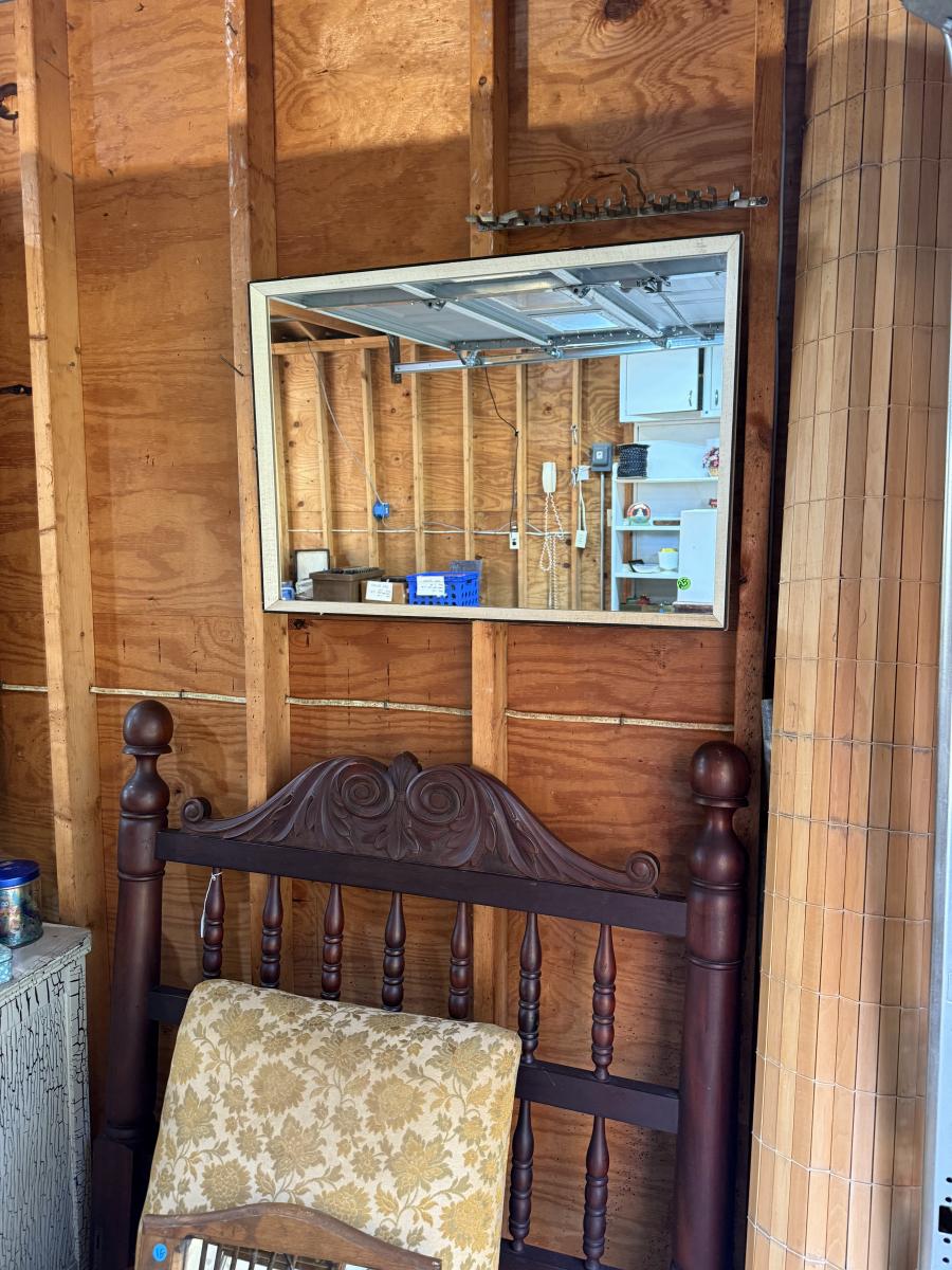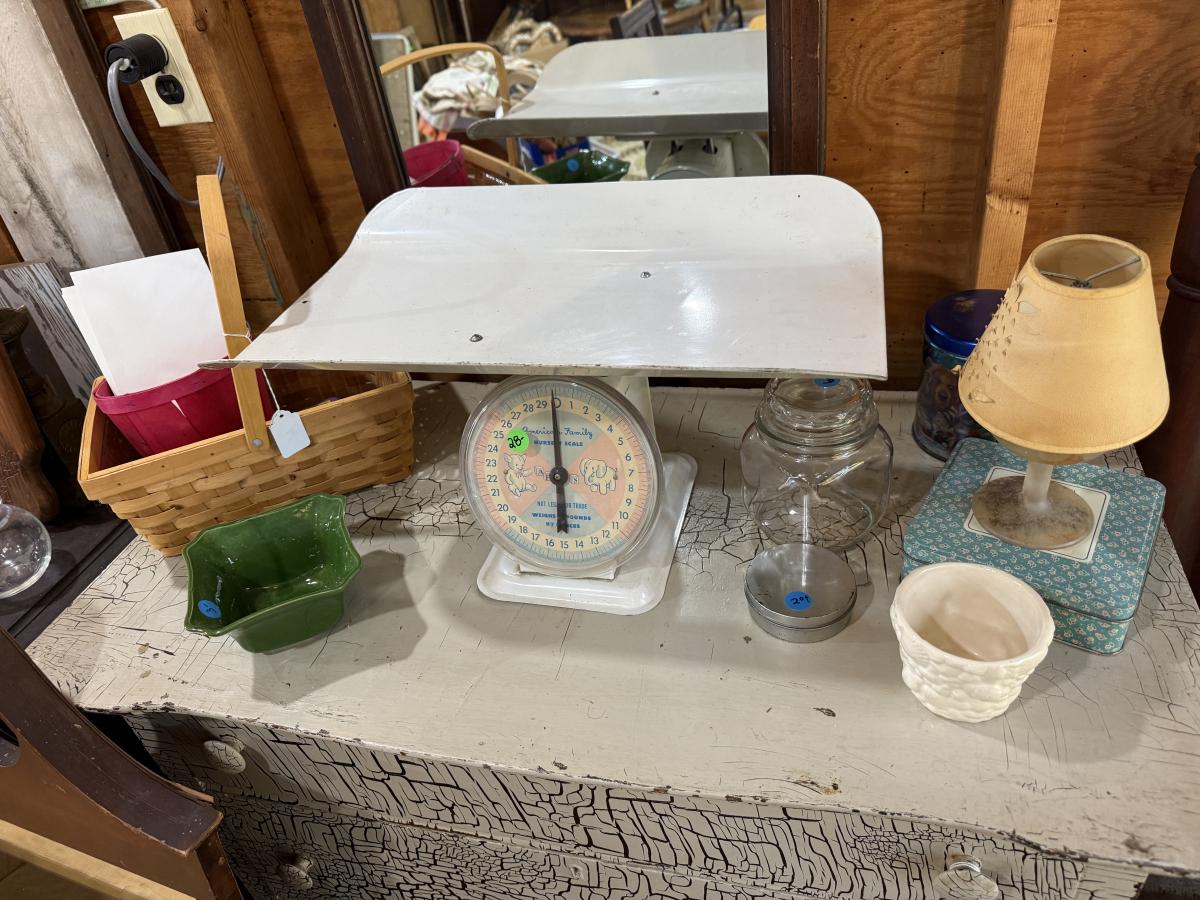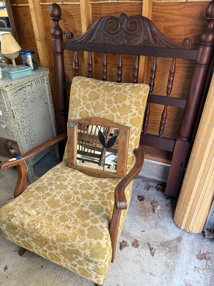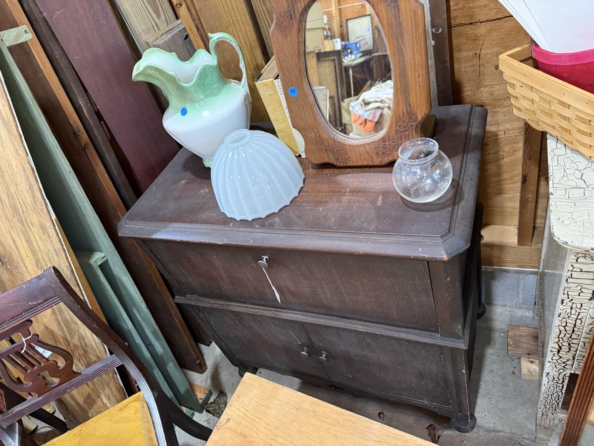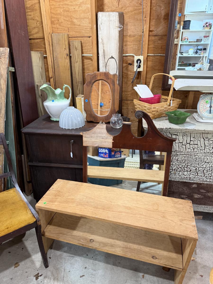 Garage 3: table, miscellaneous kitchen & decor, rocker, early twin bed, dresser, cabinet, scrap wood, curtain rods, project chairs, reupholstering supplies, mirrors, baby scale, lantern, pitcher, storage contain, laundry basket & more