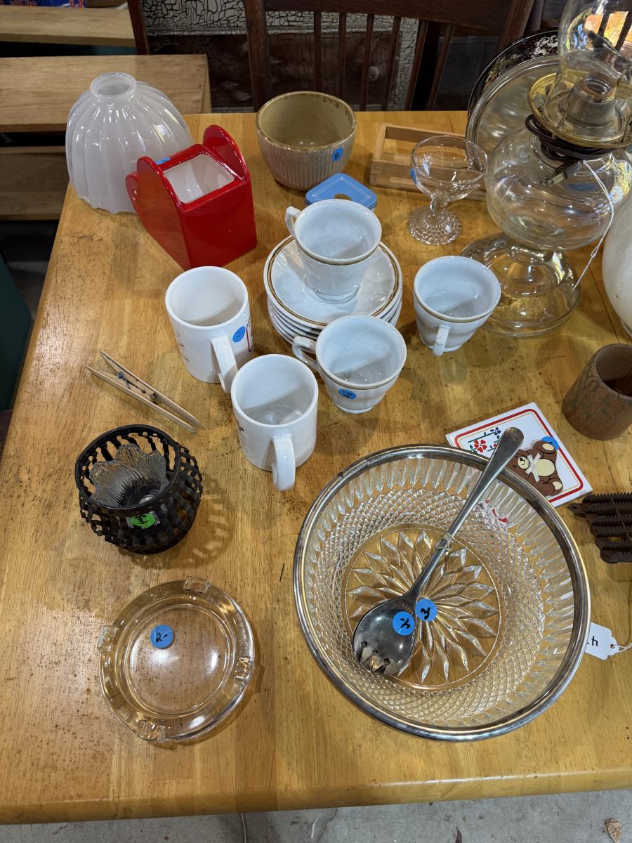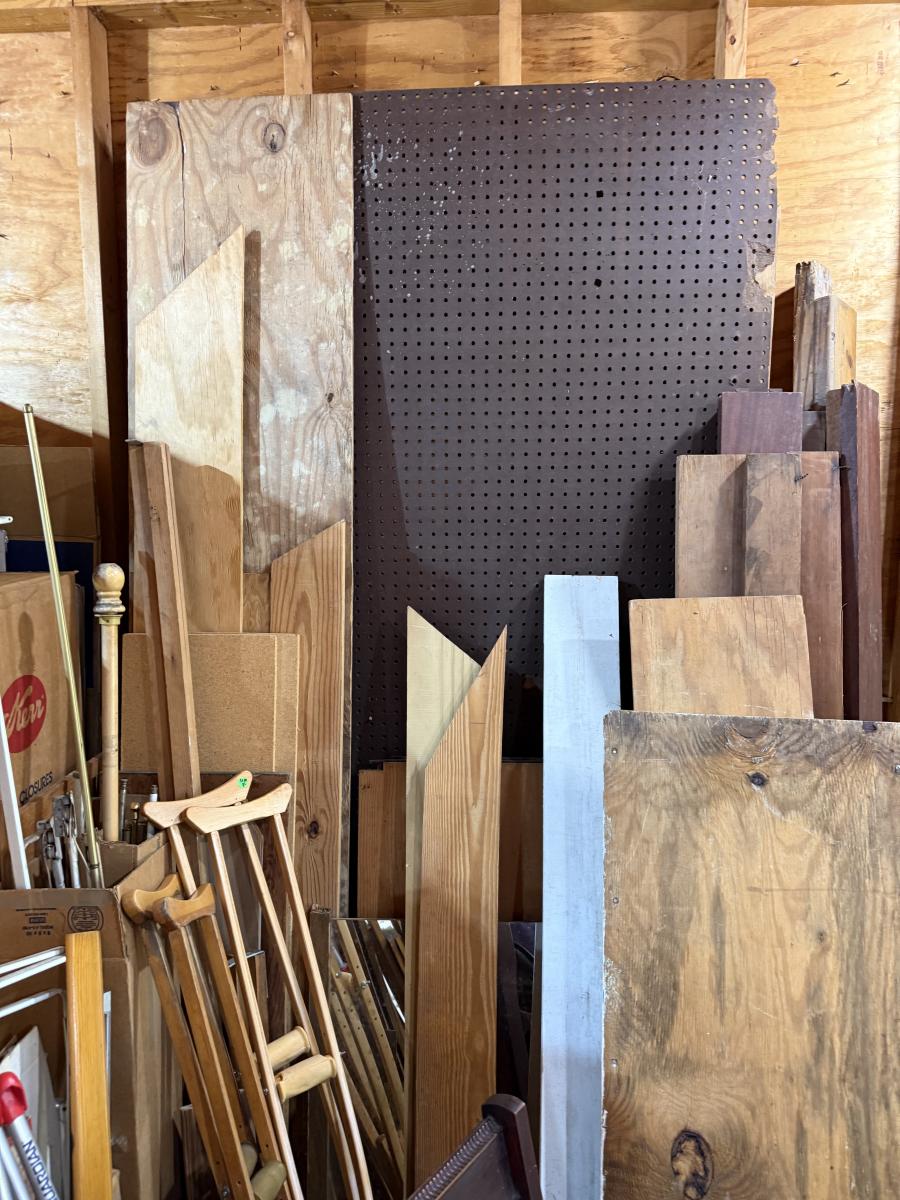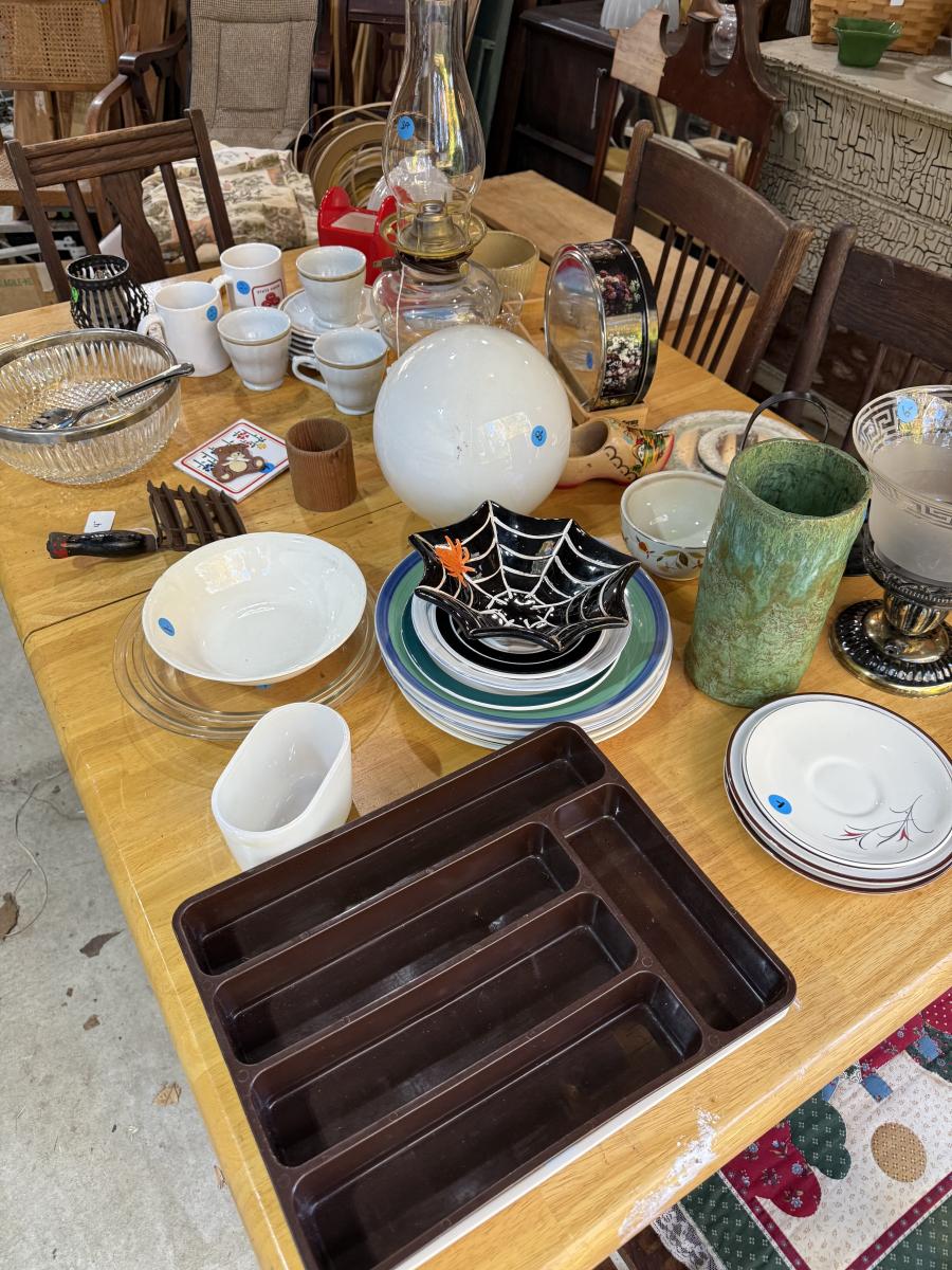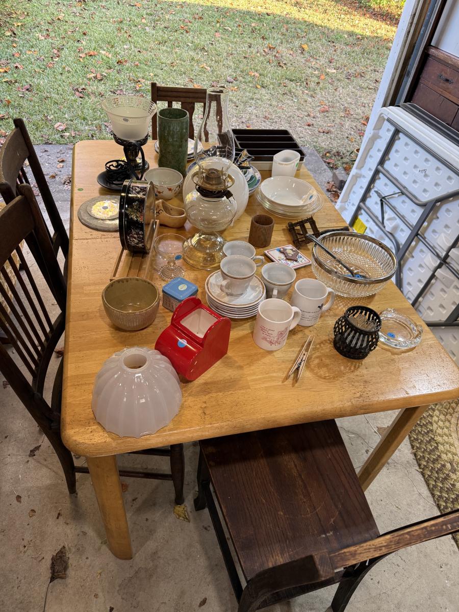 Garage 3: table, miscellaneous kitchen & decor, rocker, early twin bed, dresser, cabinet, scrap wood, curtain rods, project chairs, reupholstering supplies, mirrors, baby scale, lantern, pitcher, storage contain, laundry basket & more