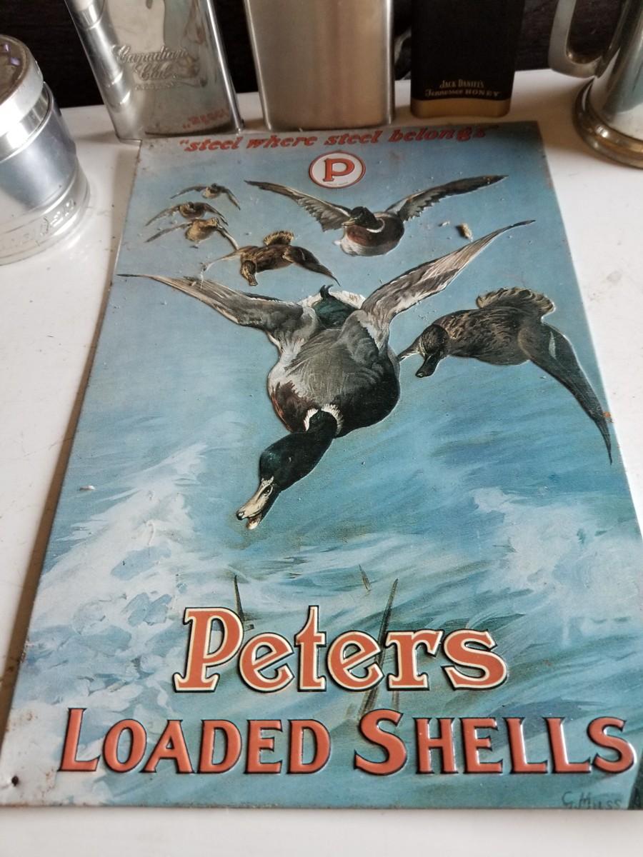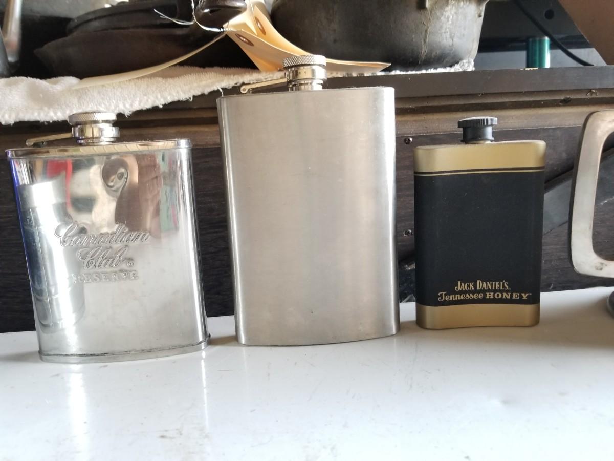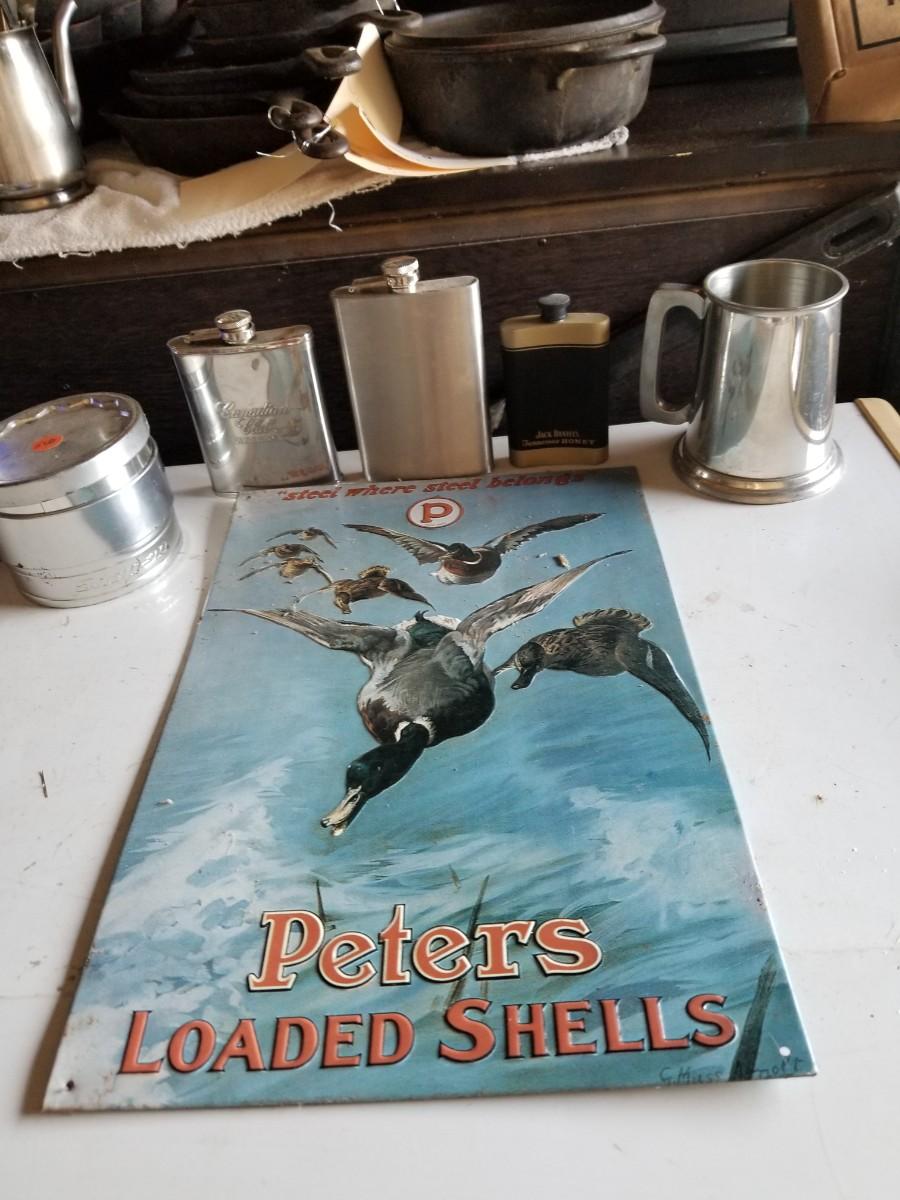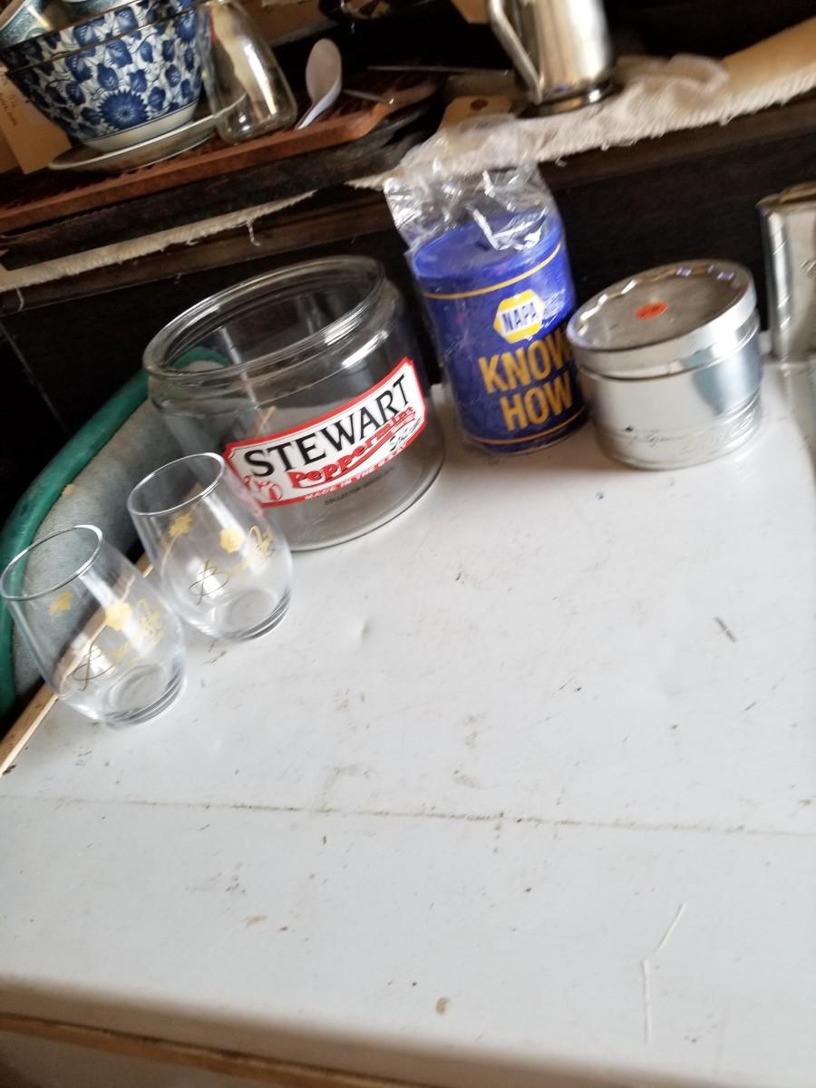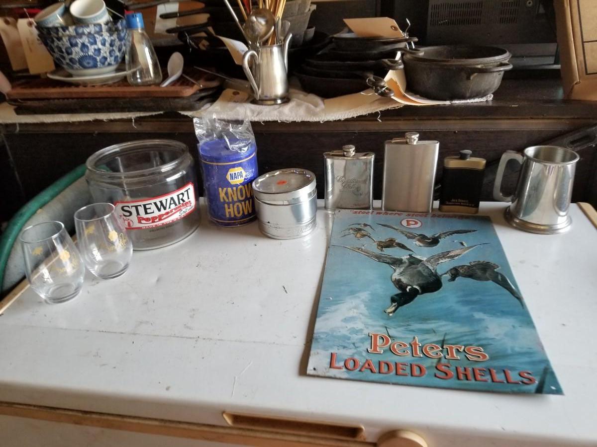 Stewarts Jar, NAPA coin bank, flasks, wine glasses, and metal sign