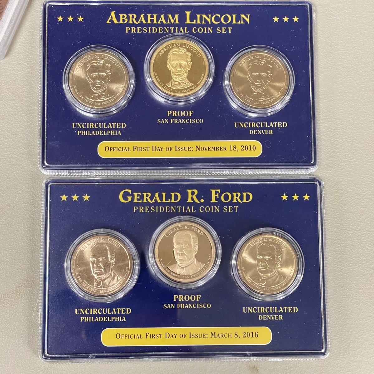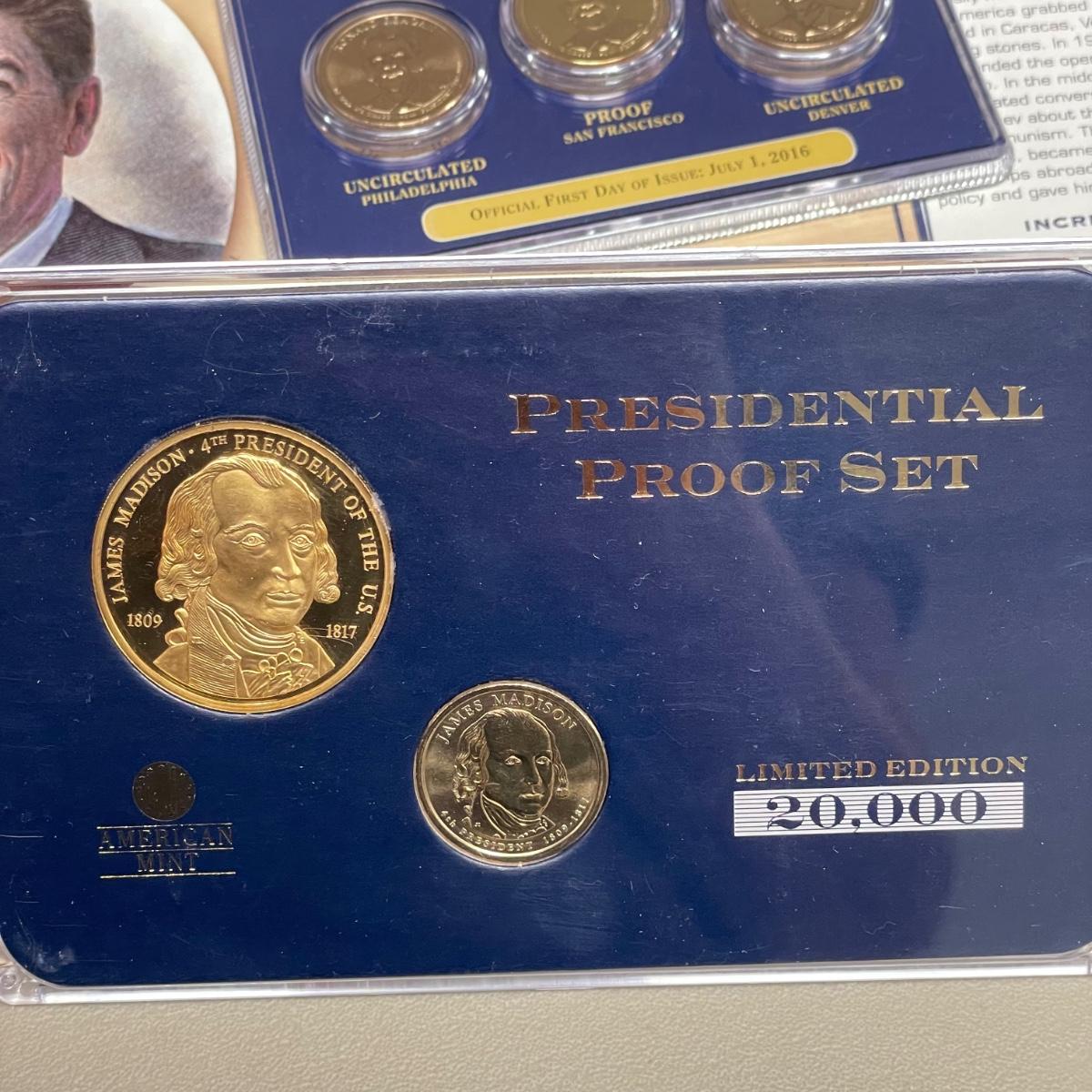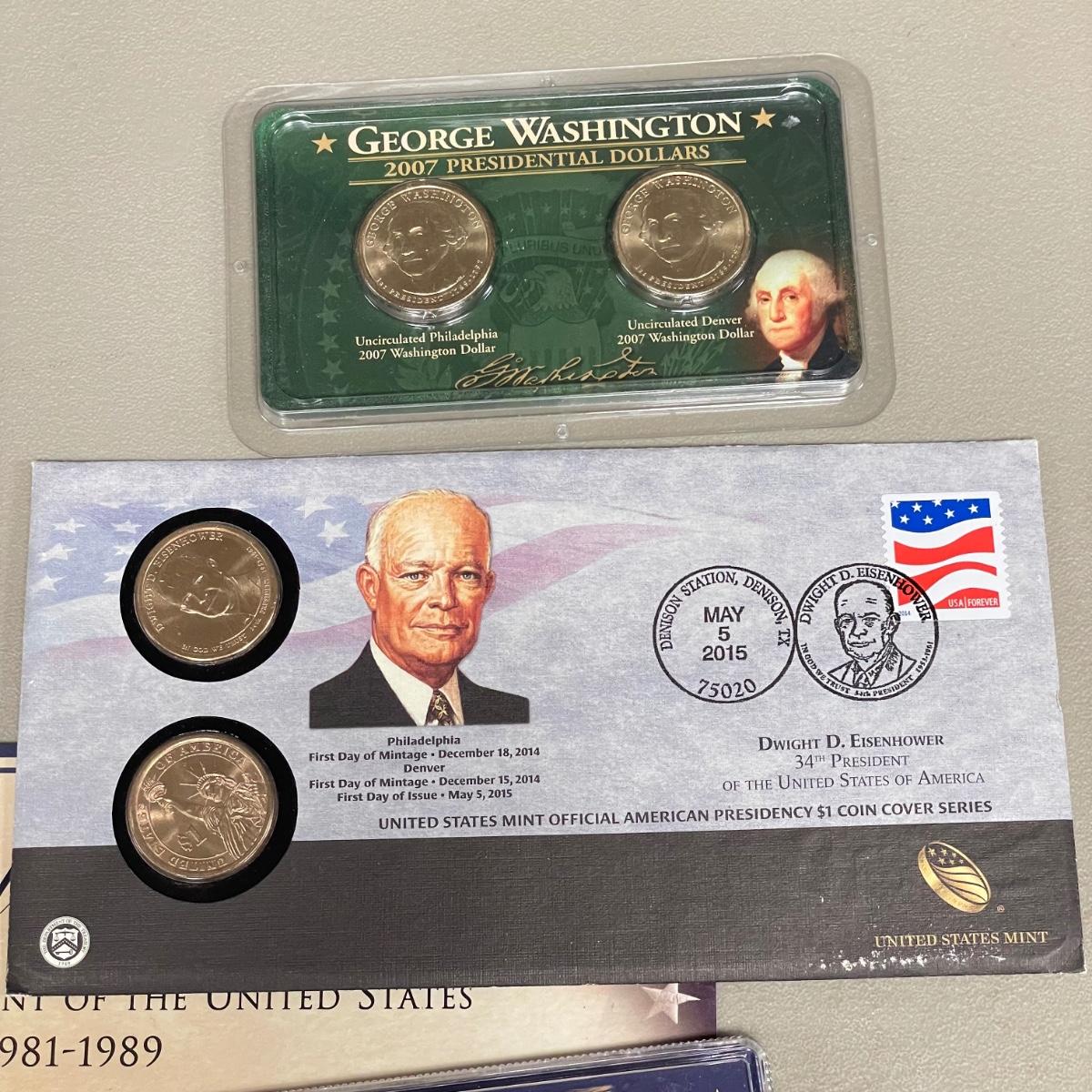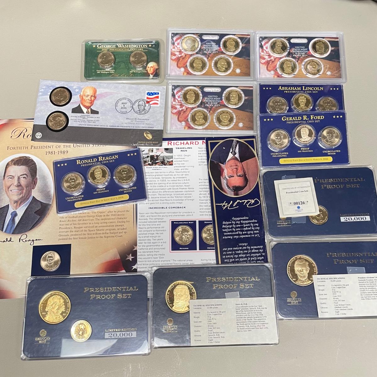 Large collection of presidential dollars coins, the majority of the packaging states Proof. A few sets have medallions included plus a few stamps. See images. Starting bid is at face value. All sales are final. No returns or refunds. Please bid accordingly. Shipping available.