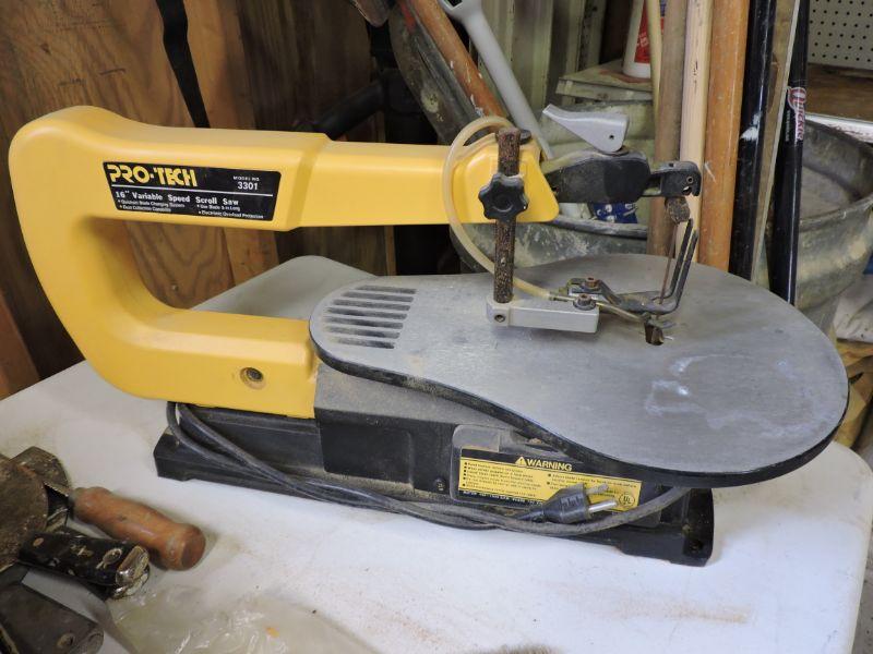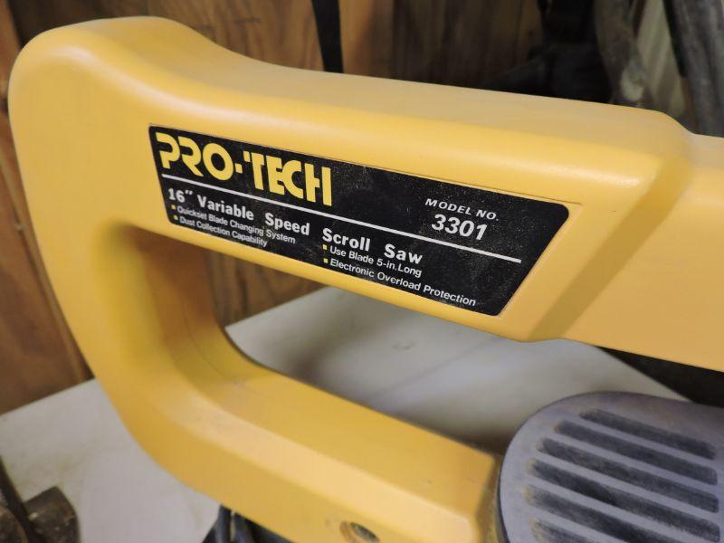 Pro-Tech 16" Variable Speed Scroll Saw Model No 3301Please read Terms and Conditions before placing a bid. Pick up is Friday, October 25th between 4 and 7, and Saturday, October 26th between 9 and 1. Please bring boxes, tools, and muscle to help move your items. Props included in photos are not included in listing. All measurements are approximate.