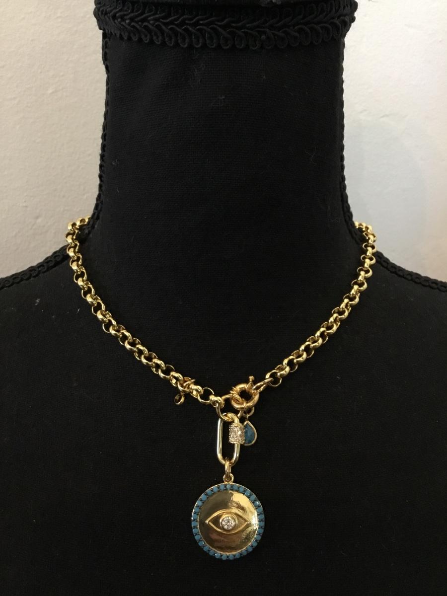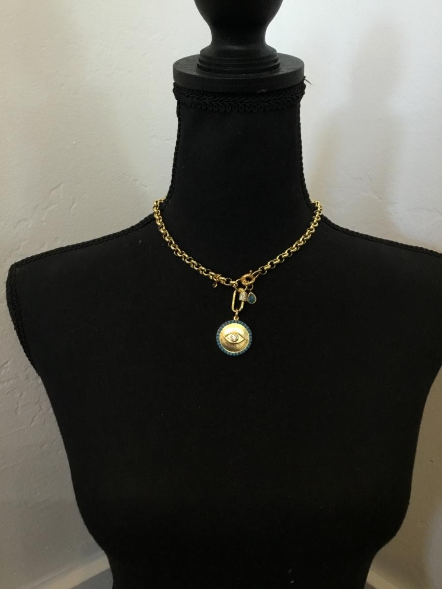 Protection evil eye Gold tone, turquoise Crystal rhinestone toggle necklace