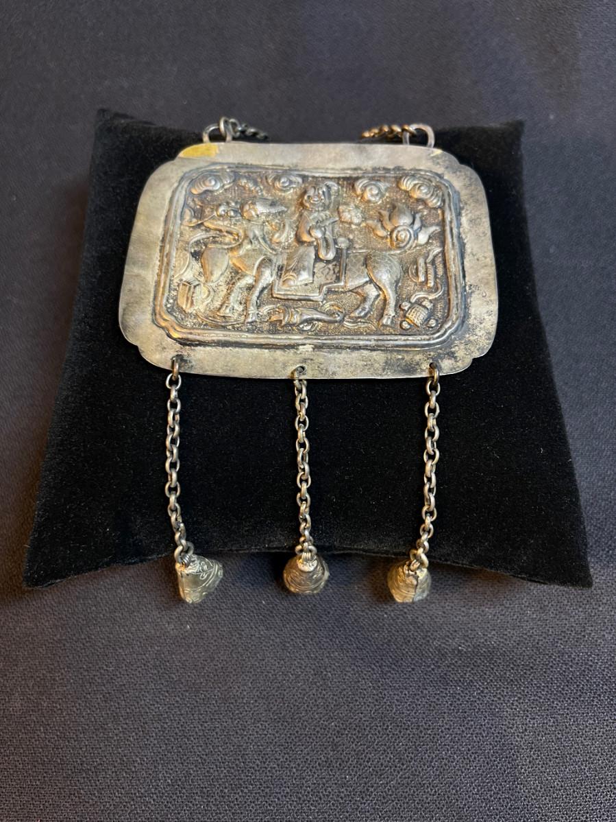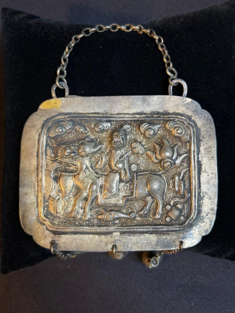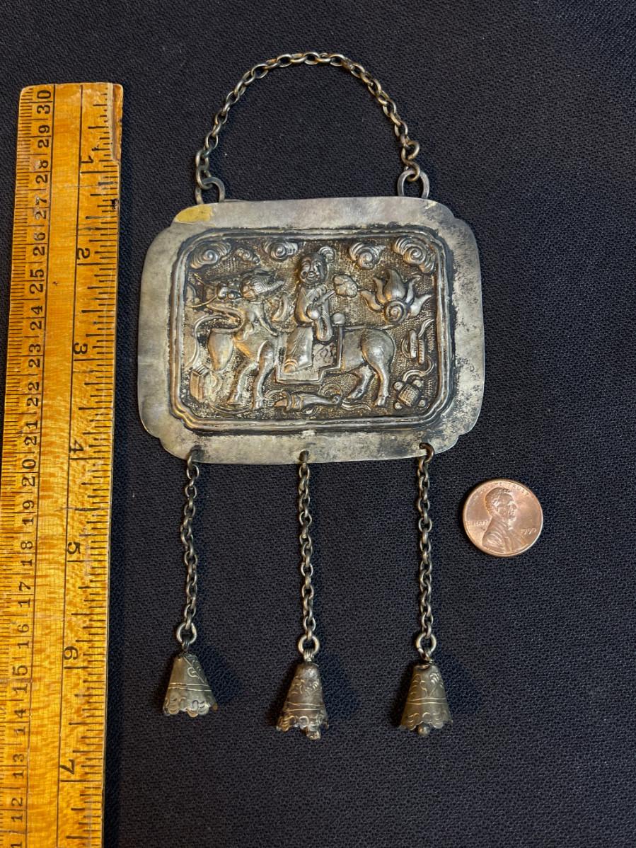 DESCRIPTION: This protective amulet is a repoussé formed delicately on cultural silver, posing a Chinese Lohan figure riding on the back of a mythical beast. The dangles are designed to tinkle and scare away the demons.
