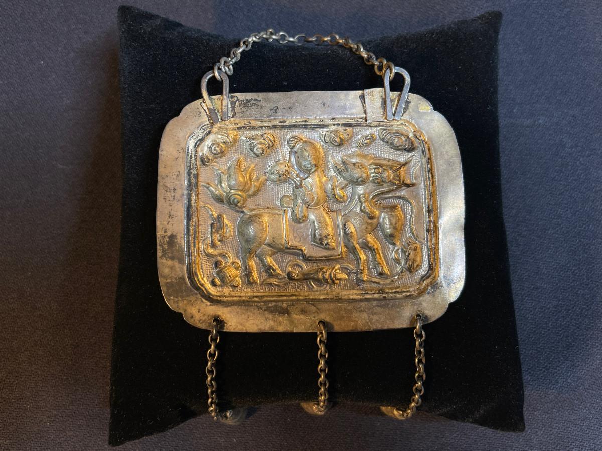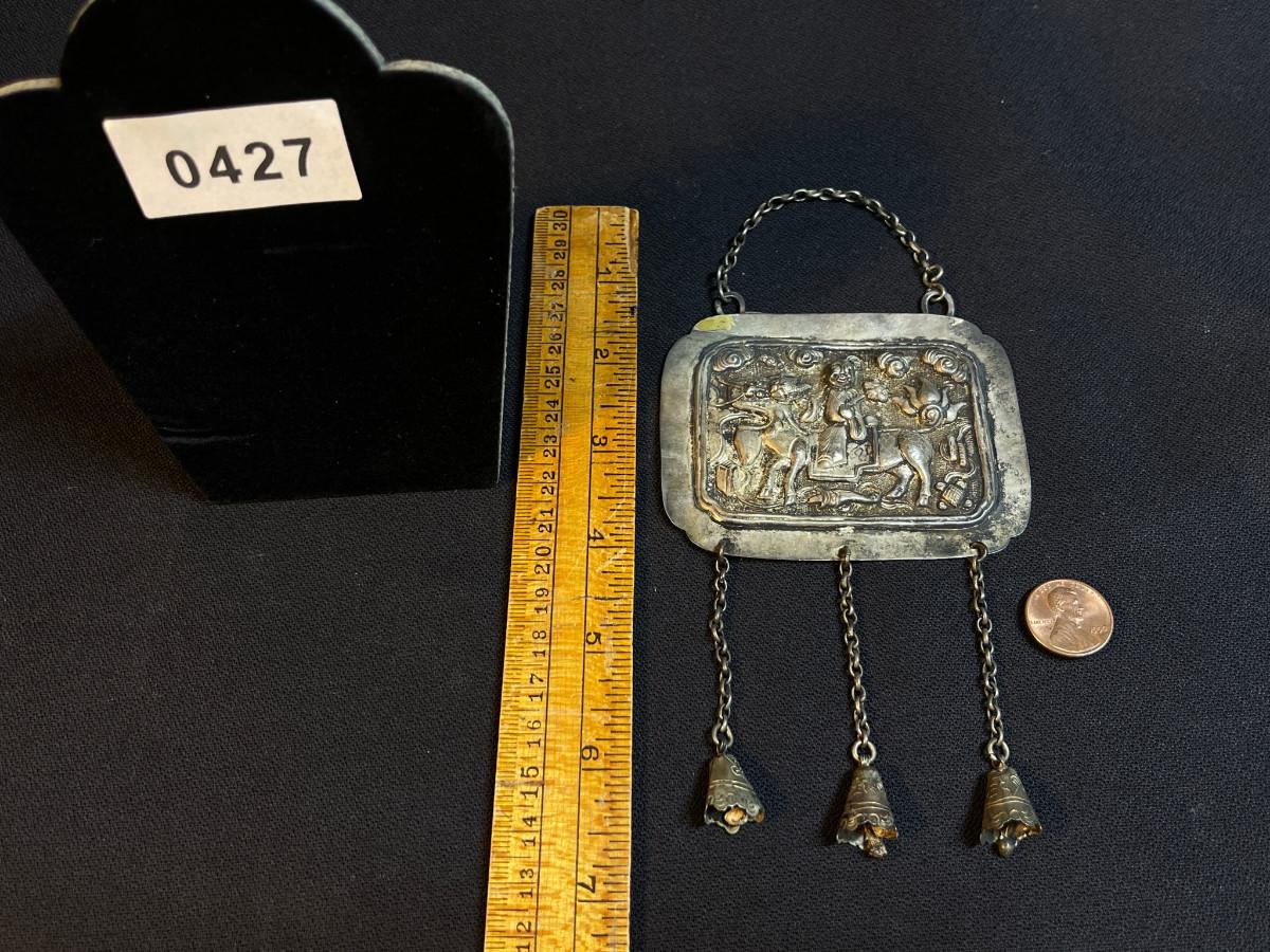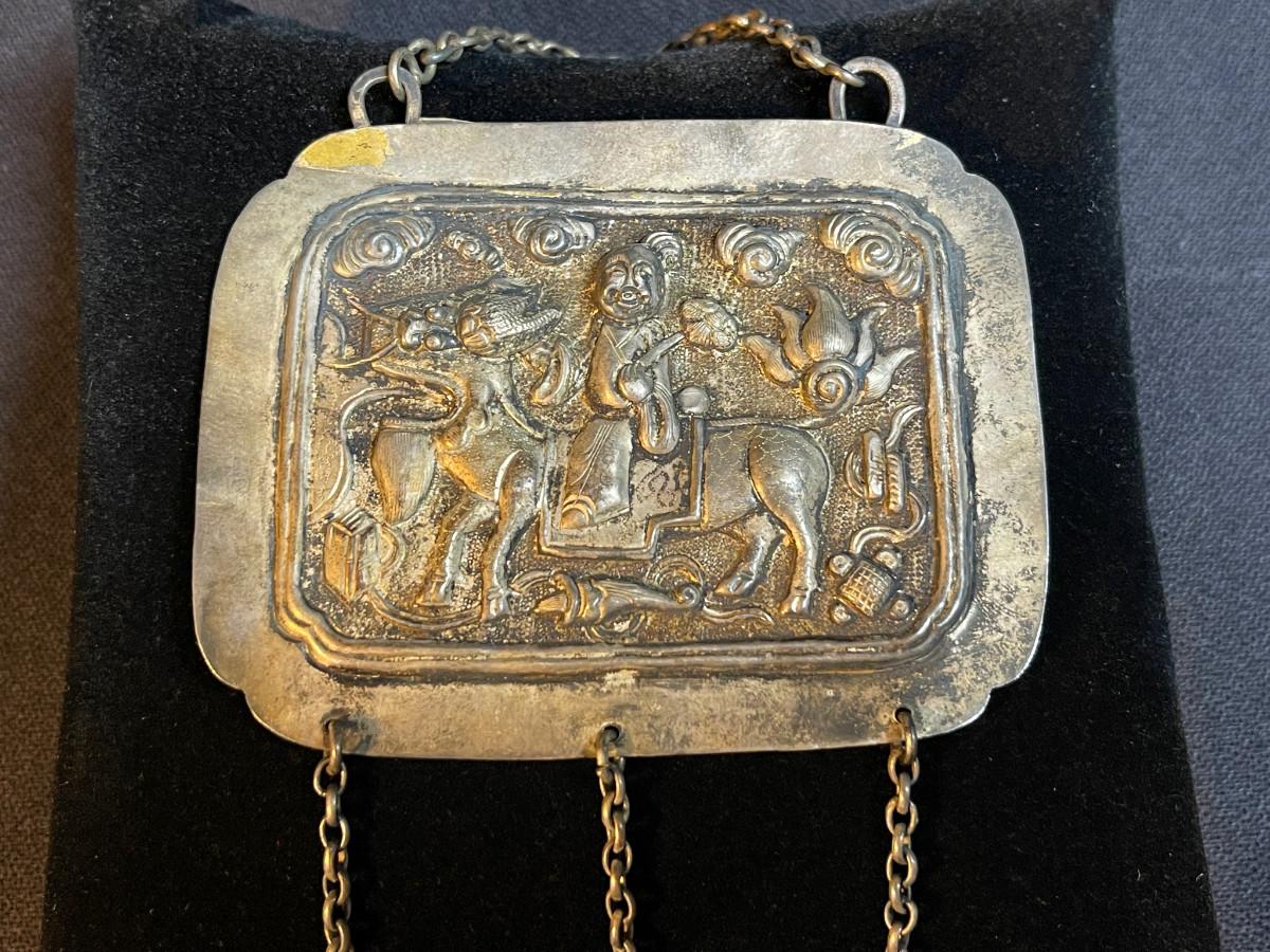 DESCRIPTION: This protective amulet is a repoussé formed delicately on cultural silver, posing a Chinese Lohan figure riding on the back of a mythical beast. The dangles are designed to tinkle and scare away the demons.