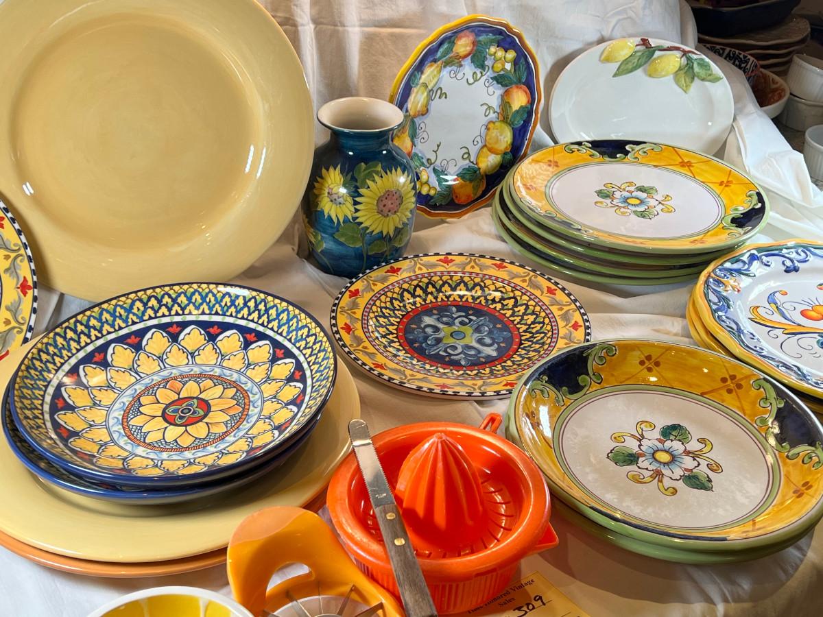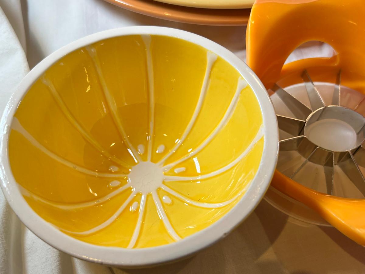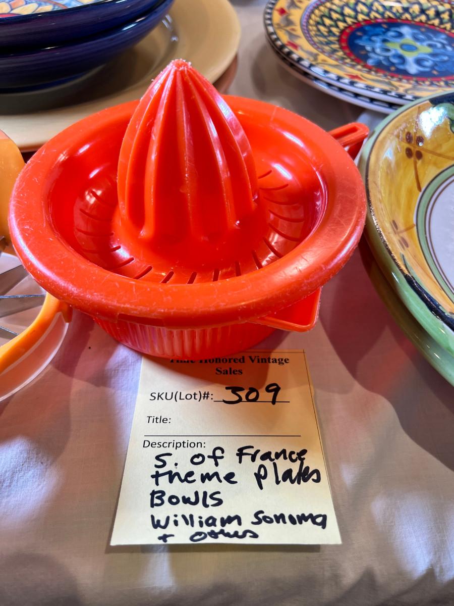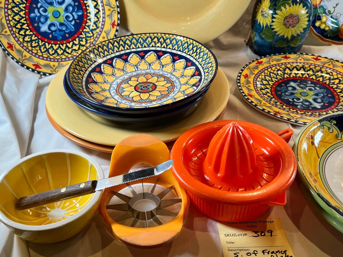 Provence France theme plates bowls by William Sonoma. Colors from the sunny south of France, Grapefruit bowl, juicer and knife.