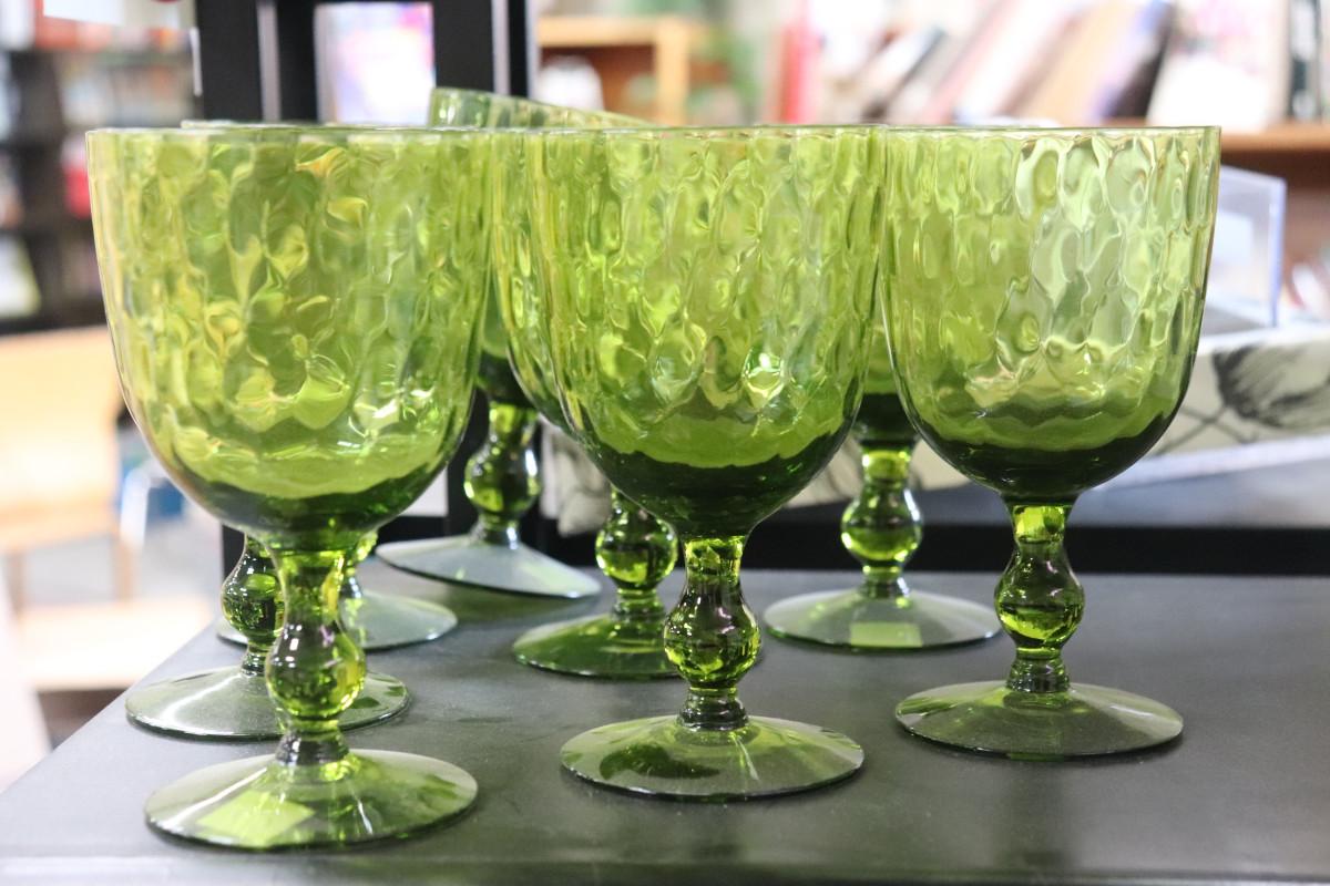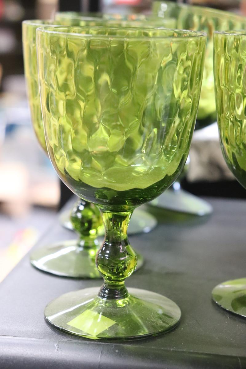 Provincial Green Imperial Glass Water Goblets, Set of 14, Avocado Green Thumbprint Goblets, 1970s Table Scape, Retro 70s Glassware