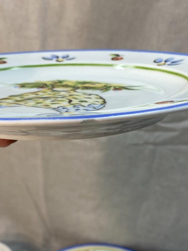 222 Fifth fine porcelain dishware in "Provincial Rooster". 28 pcs set includes 8 dinner plates, 8 salad plates, 7 soup bowls, and 5 coffee mugs. There is one salad plate with a chip on the underside. Minimal signs of use on surfaces. Local Pick Up