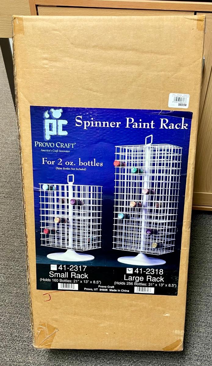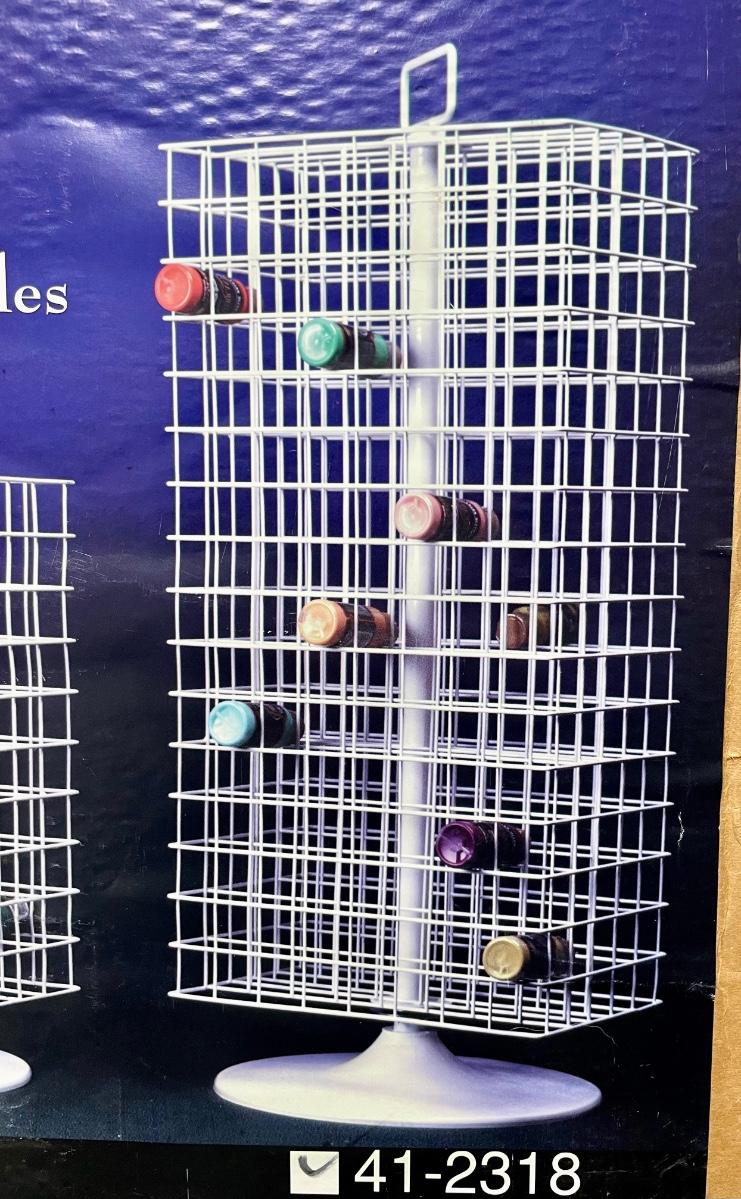 Square wire mesh rack designed to hold 256 paint bottles. Model 41-2318, 31" tall x 13" x 8.5". New in original box.