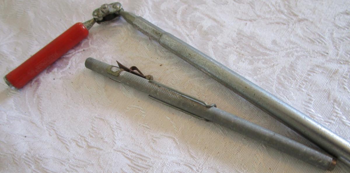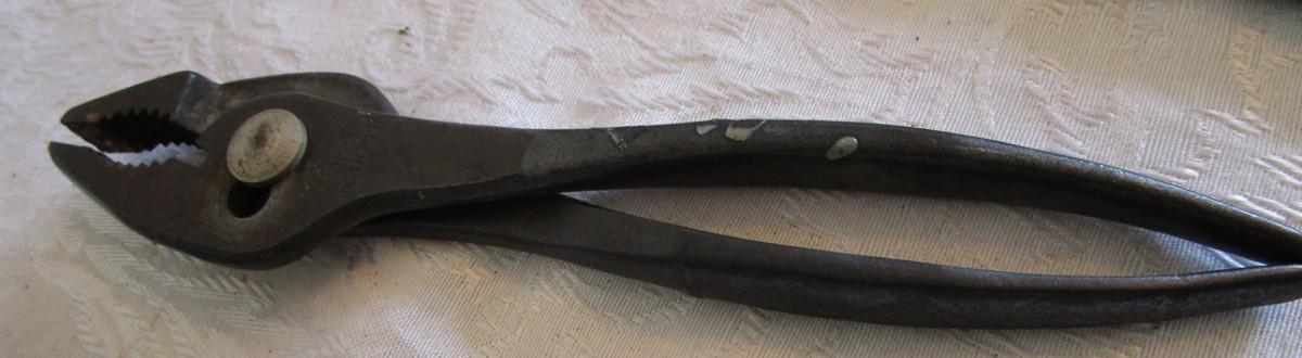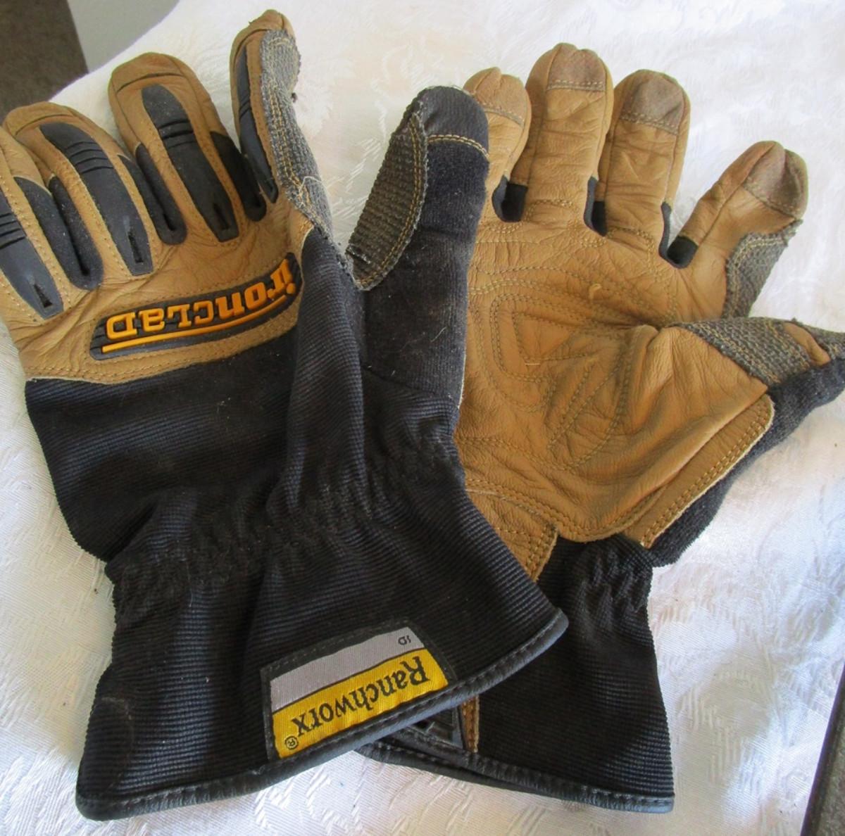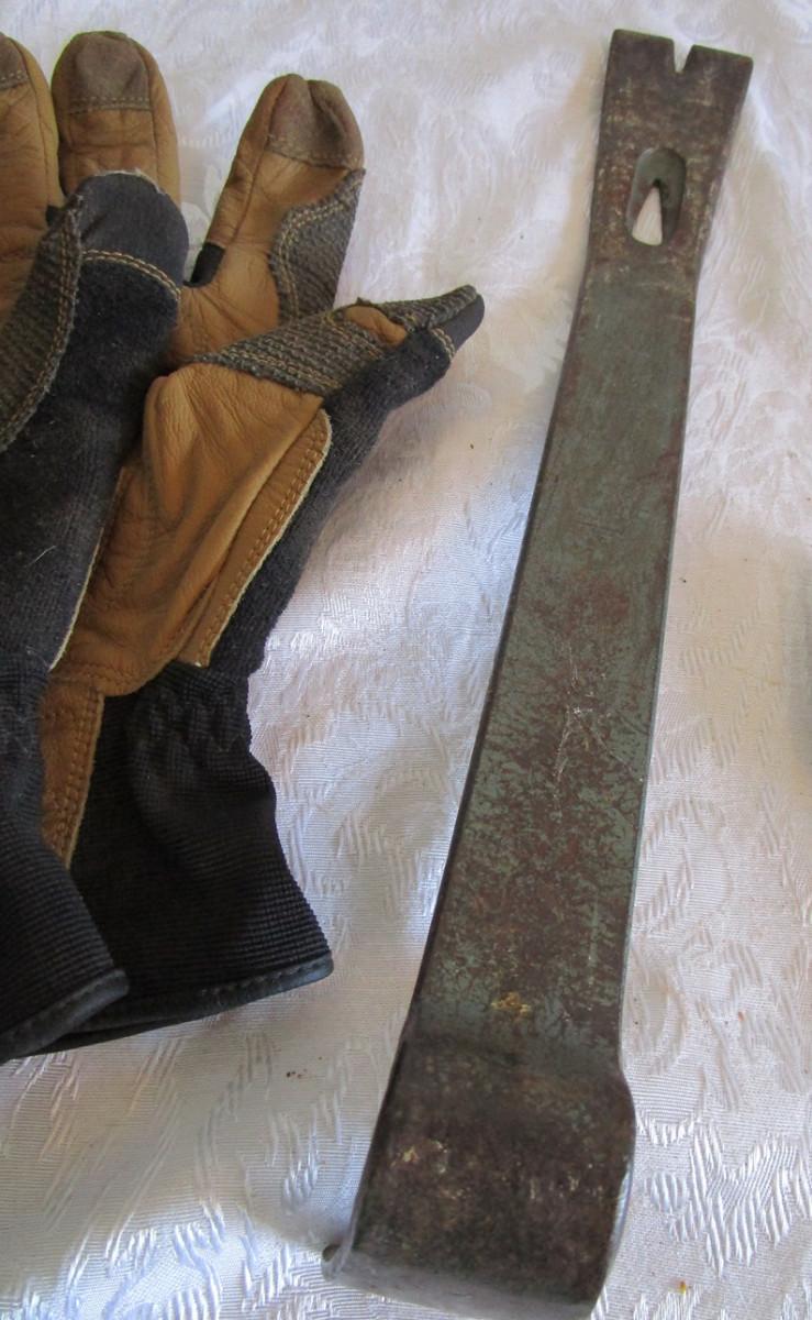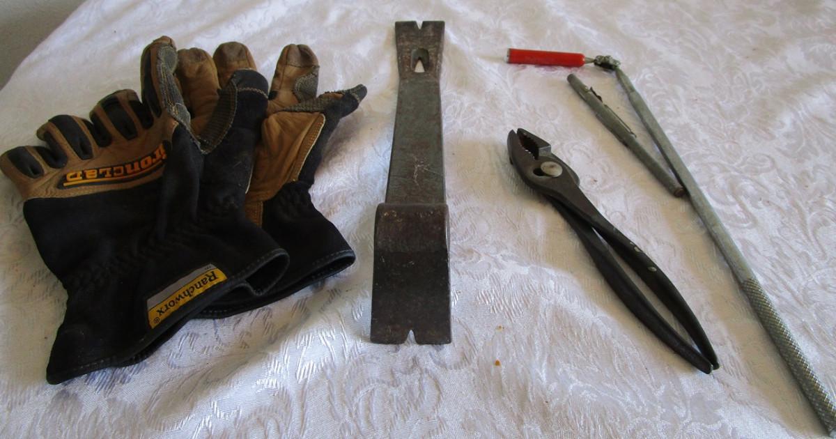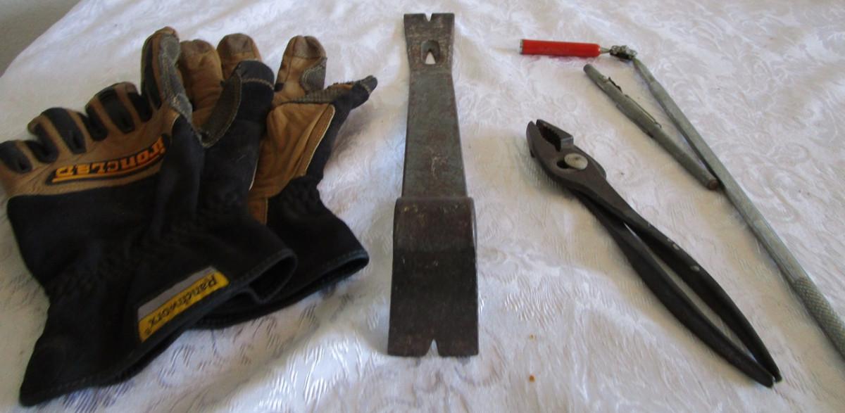 Pry bar, magnets, leather gloves, pliers