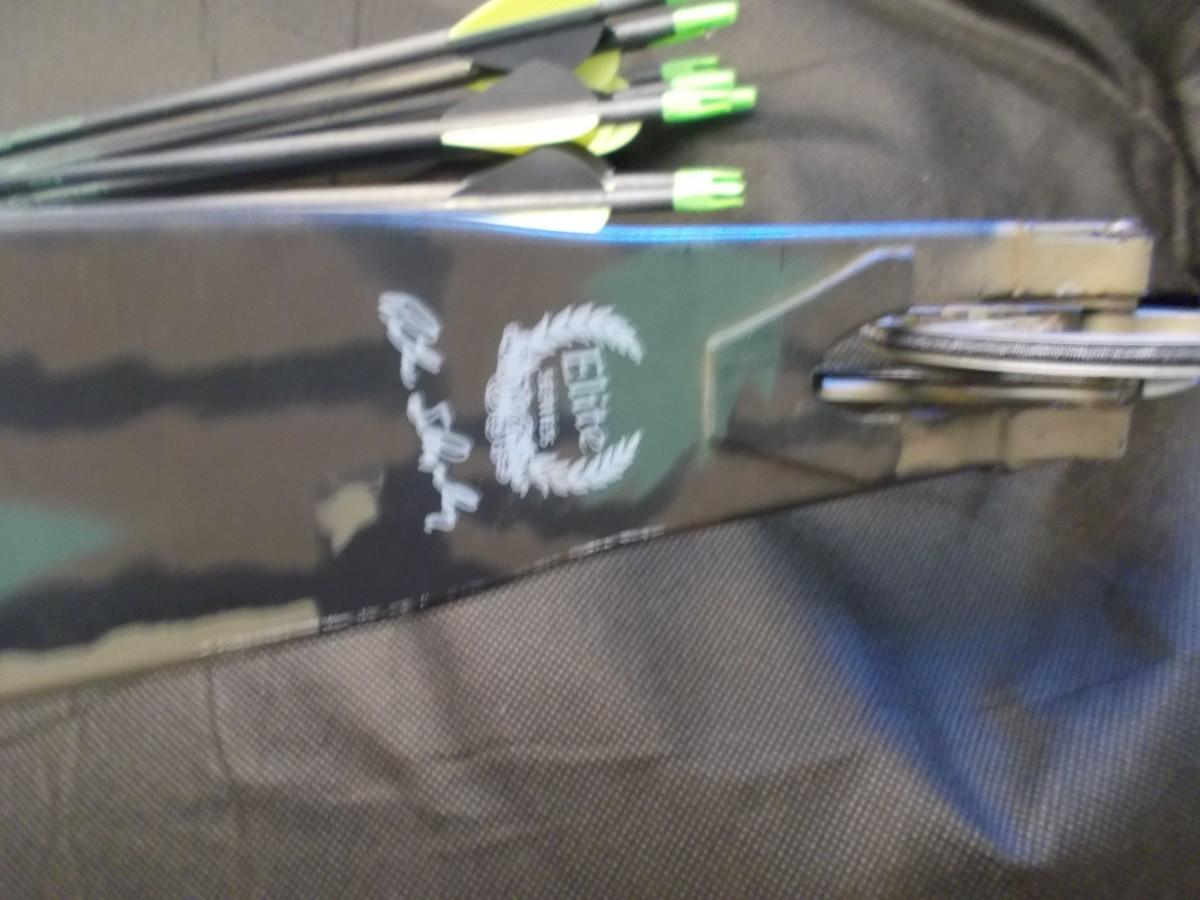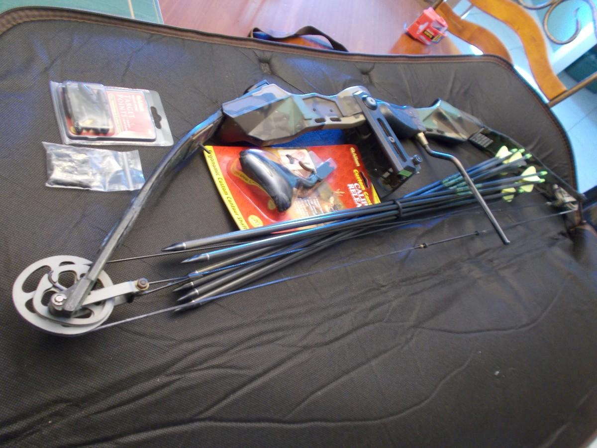 This PSE Graphite Mach 4 compound bow comes with two bags of extra arrow tips, arrows, and a caliper release as seen in the photo. It appears to be in excellent condition. The bow is in a camo pattern. The carrying case is not included, but is listed separately.