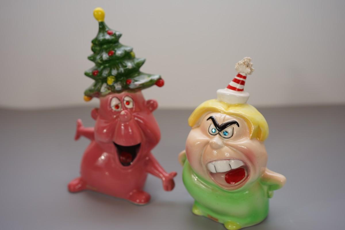 condition: good. The little guy with the christmas tree on his head has a bit of paint missing from the tip of his nose. Not bad.