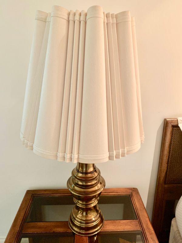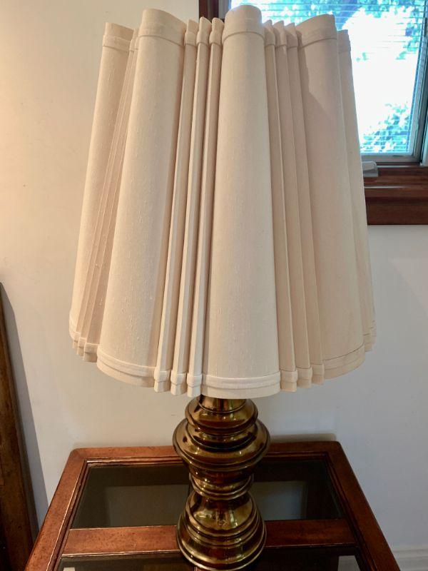 Brass finish base, white pleated shade. 36"tall