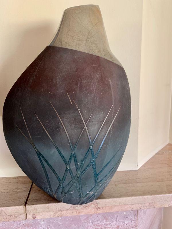 Asymmetrical ombre matte bottom half w/streaks of shiny glaze, top part with opening is a shiny glaze. 18.5" tall