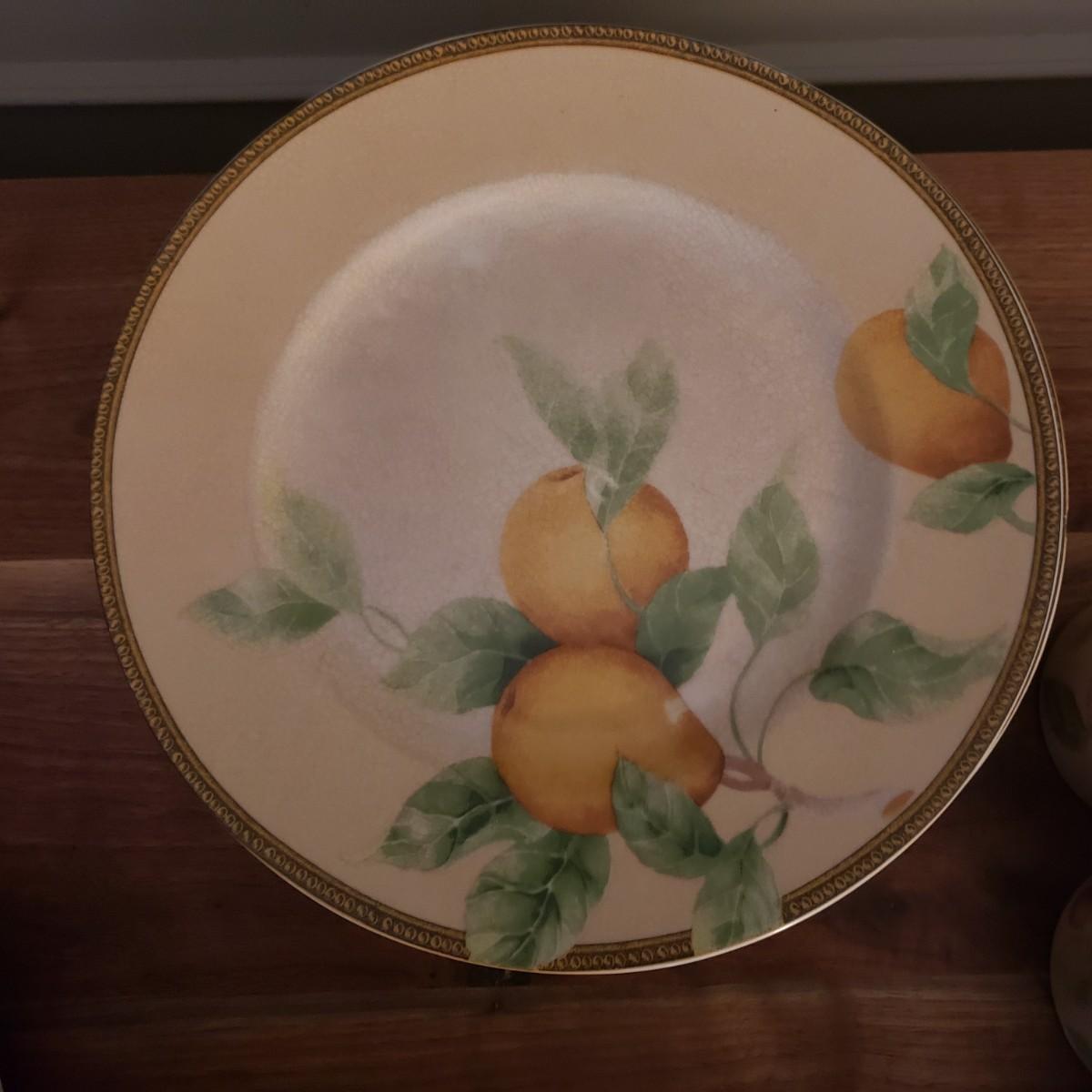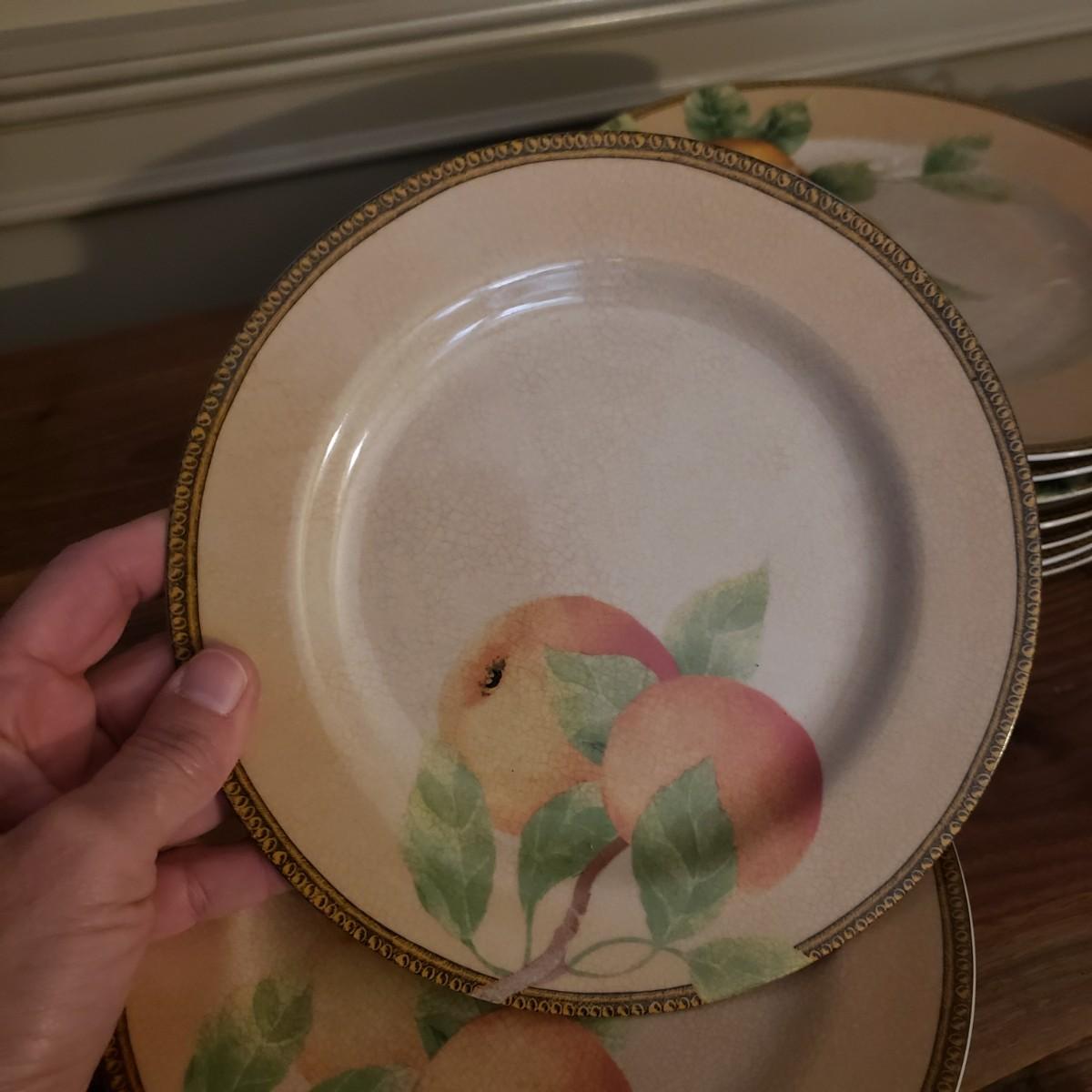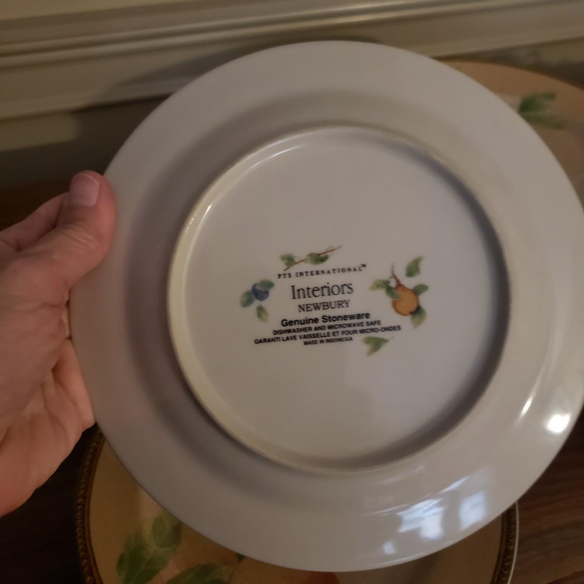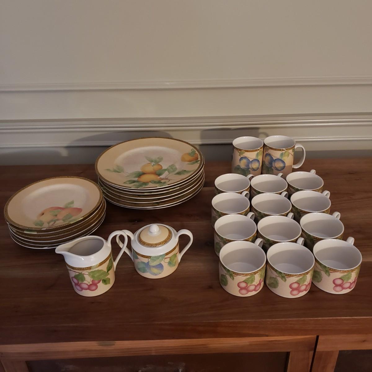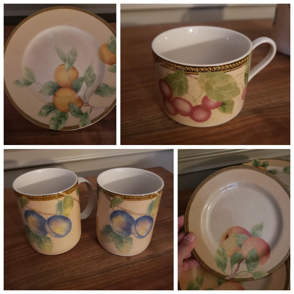This 28 piece set from PTS International is called Interiors Newbury. A variety of fruit adorns each different piece. There are seven dinner plates (10"), five salad plates (8"), a sugar and creamer bowls, 12 tea cups and two coffee mugs. The set appears to not have any blemishes, other than two dinner plates, see pictures for details. One has a chip and the other has a worn area in the finish.