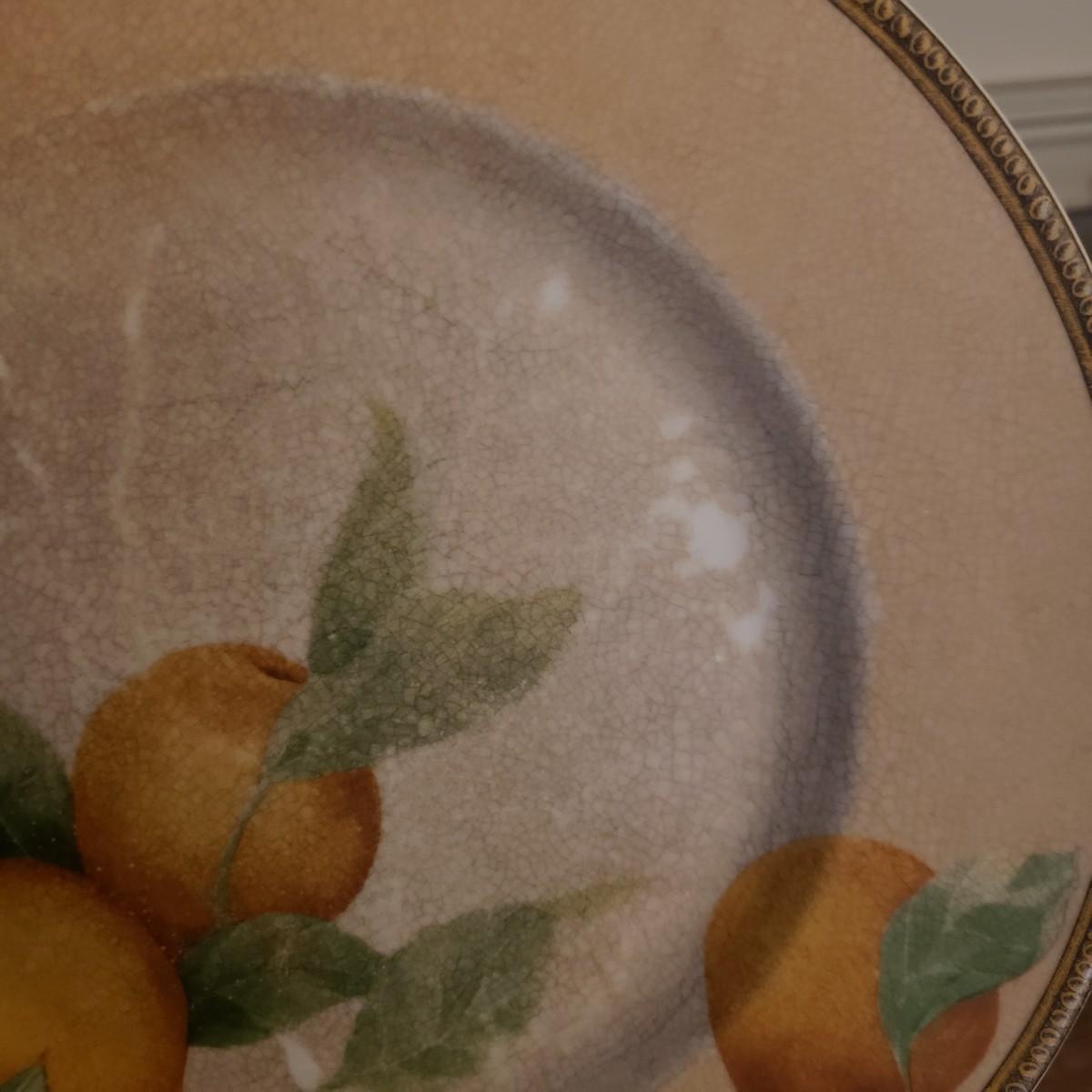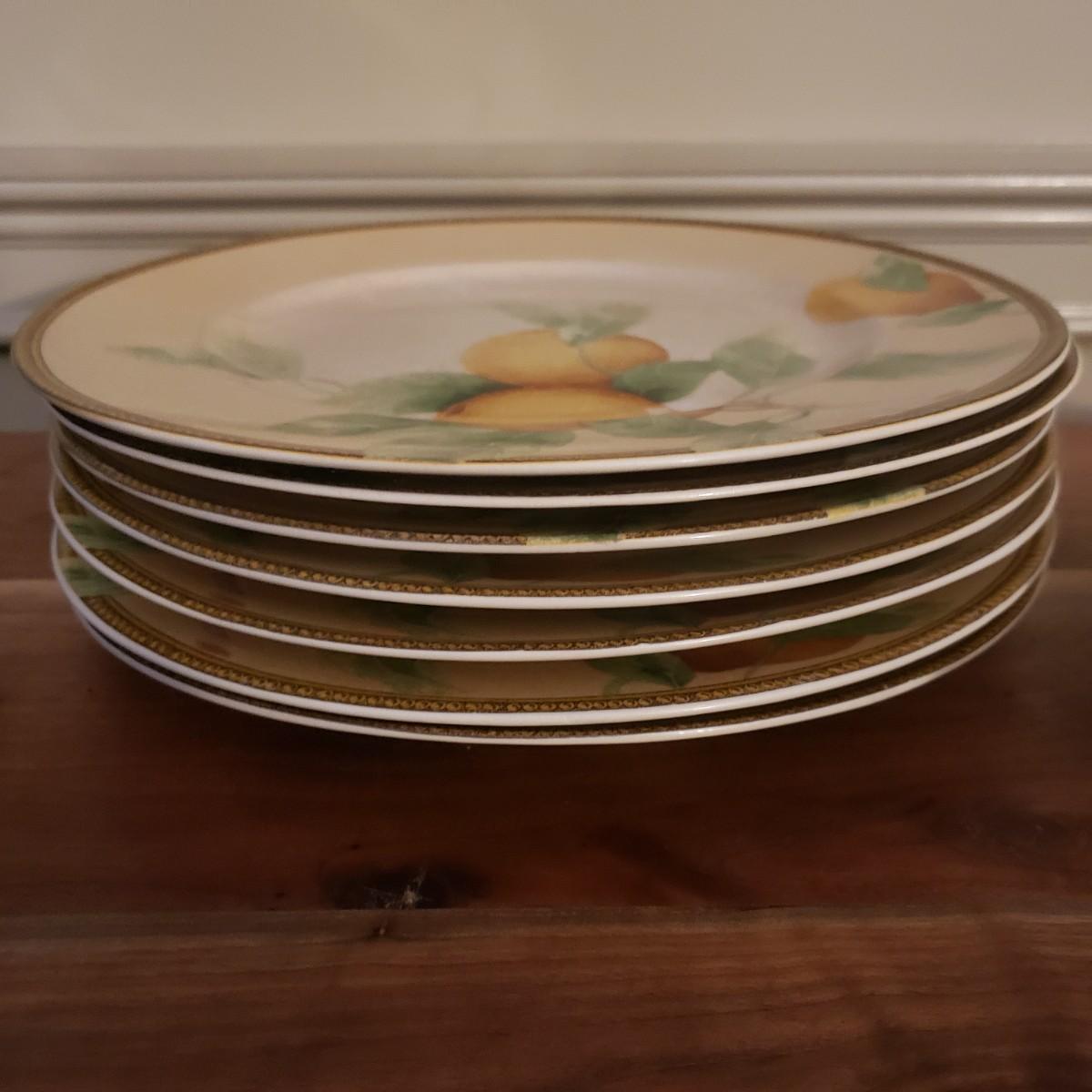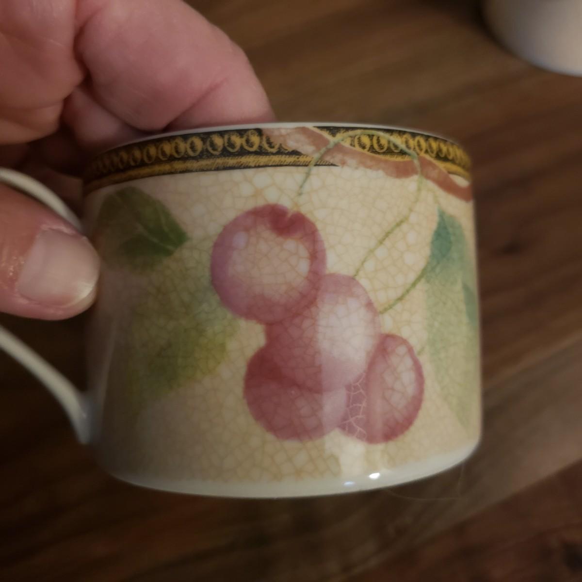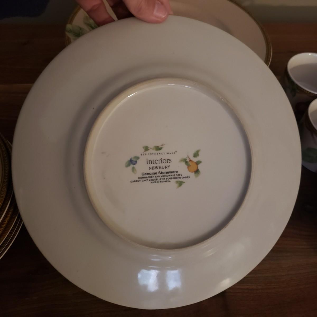This 28 piece set from PTS International is called Interiors Newbury. A variety of fruit adorns each different piece. There are seven dinner plates (10"), five salad plates (8"), a sugar and creamer bowls, 12 tea cups and two coffee mugs. The set appears to not have any blemishes, other than two dinner plates, see pictures for details. One has a chip and the other has a worn area in the finish.