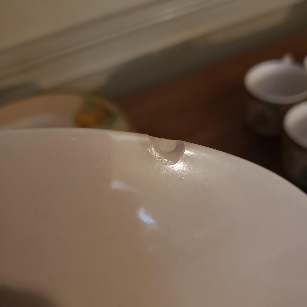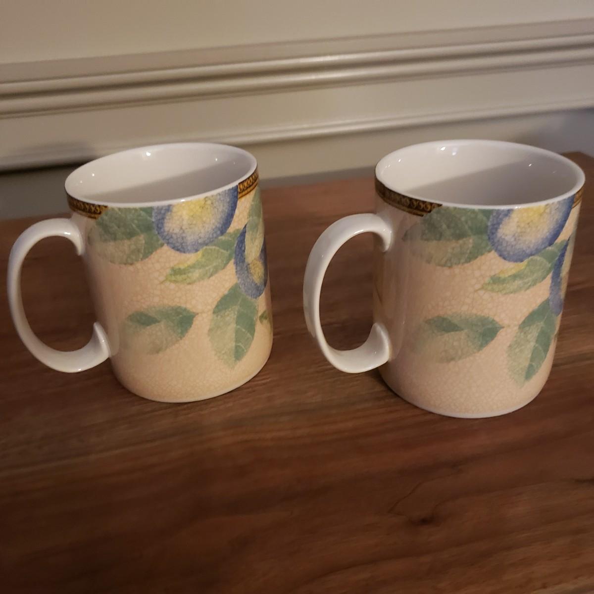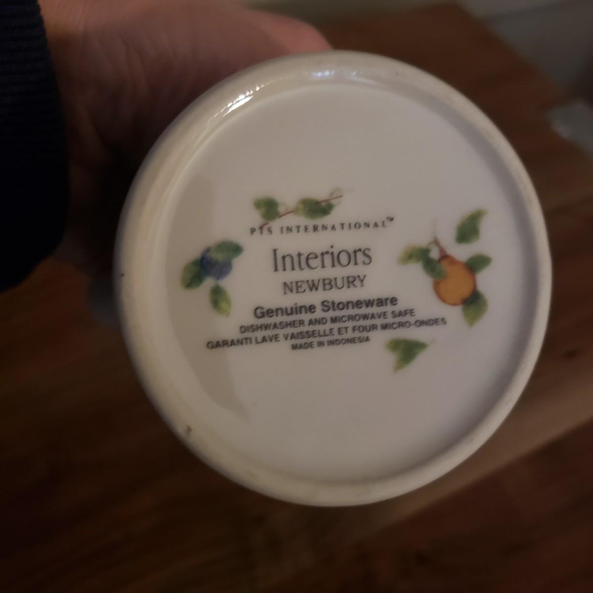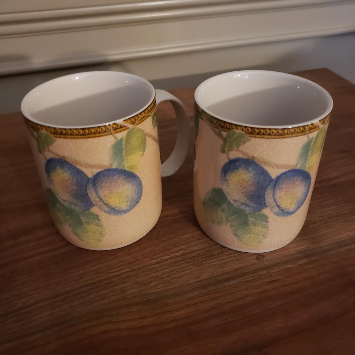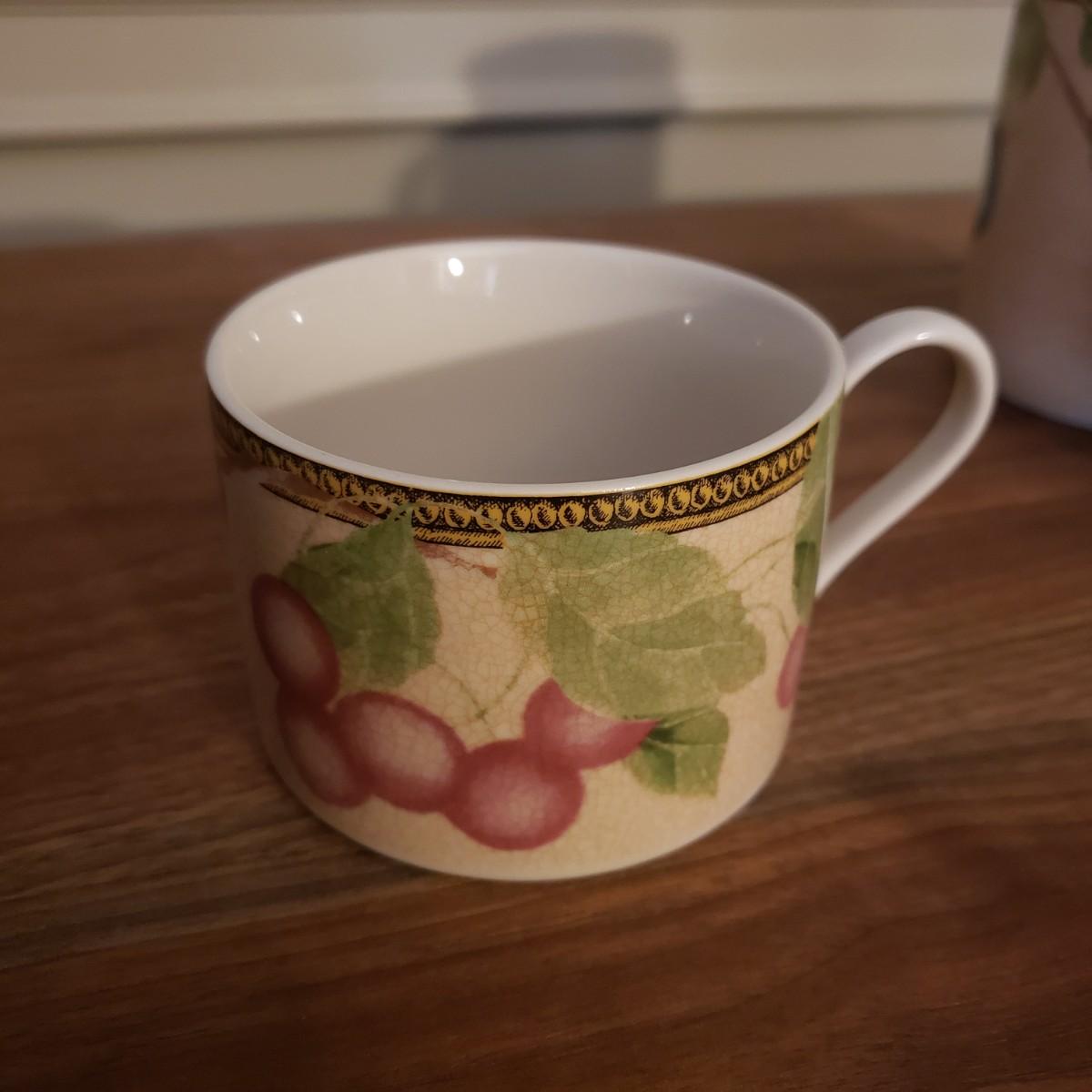 This 28 piece set from PTS International is called Interiors Newbury. A variety of fruit adorns each different piece. There are seven dinner plates (10"), five salad plates (8"), a sugar and creamer bowls, 12 tea cups and two coffee mugs. The set appears to not have any blemishes, other than two dinner plates, see pictures for details. One has a chip and the other has a worn area in the finish.