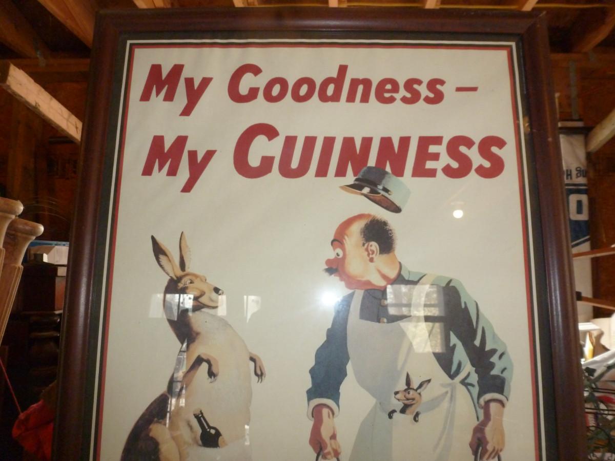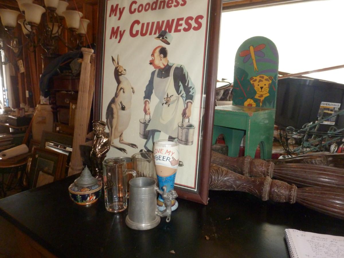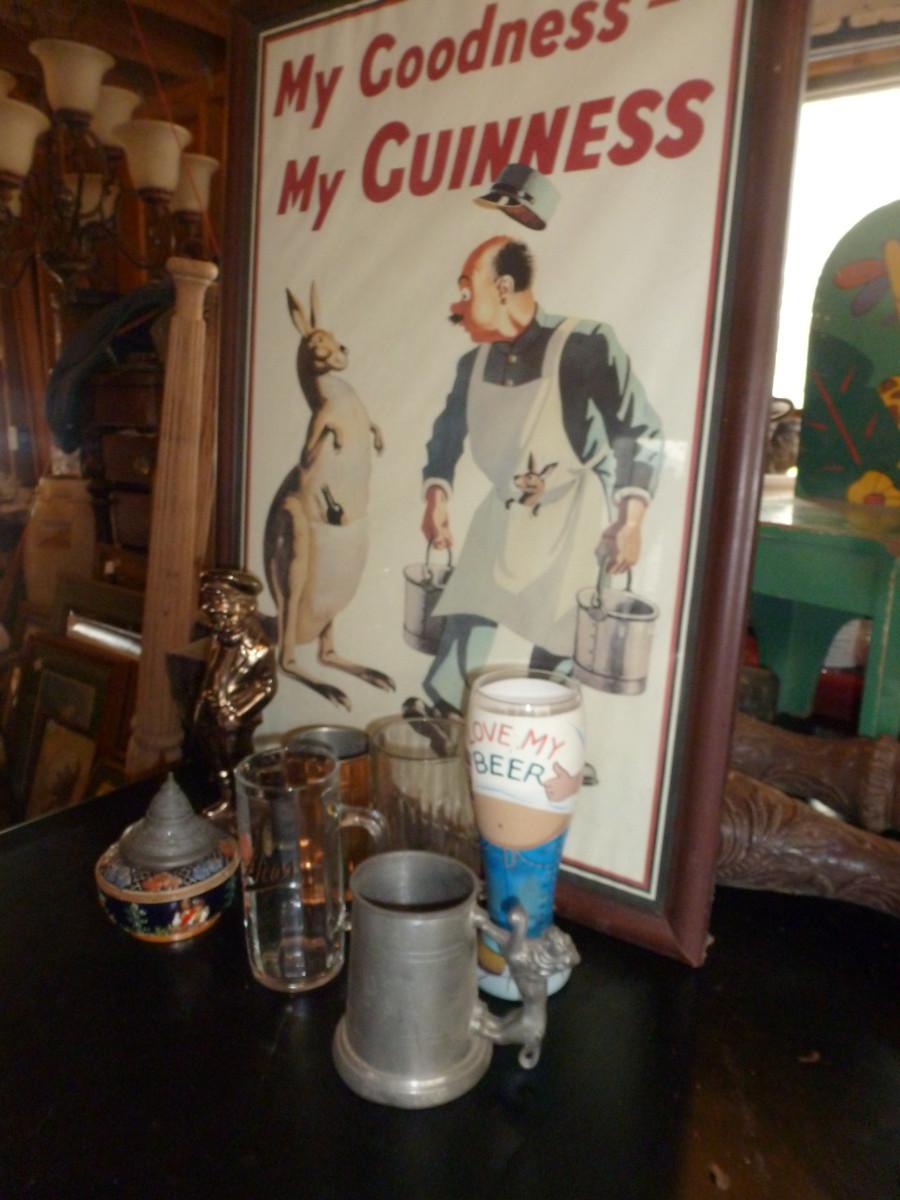 Pub Decor and Drink Ware. Framed Guiness poster, beer glasses and steins,