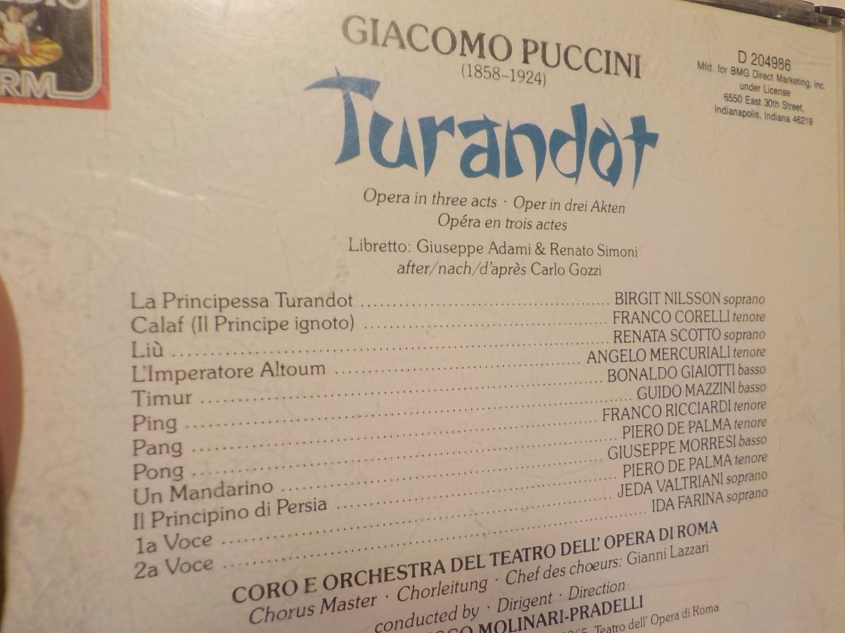 Puccini in Turandot, Nilsson Scotto, Corelli, Opera Acts 1,2,3, on CD.