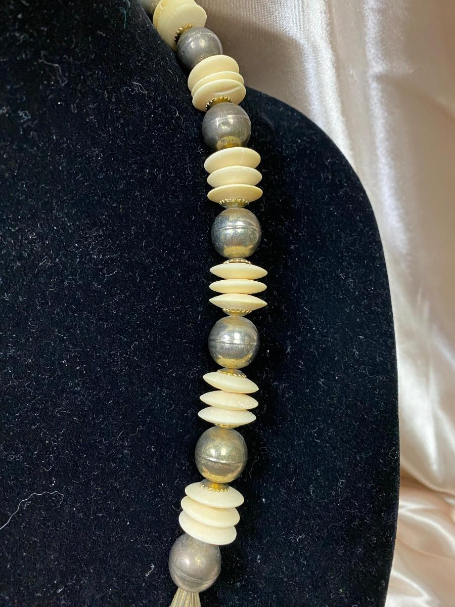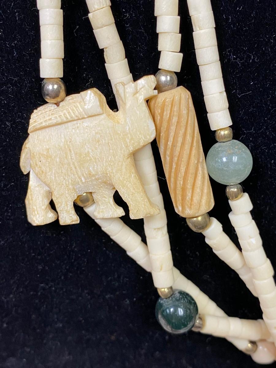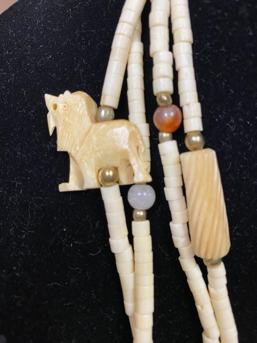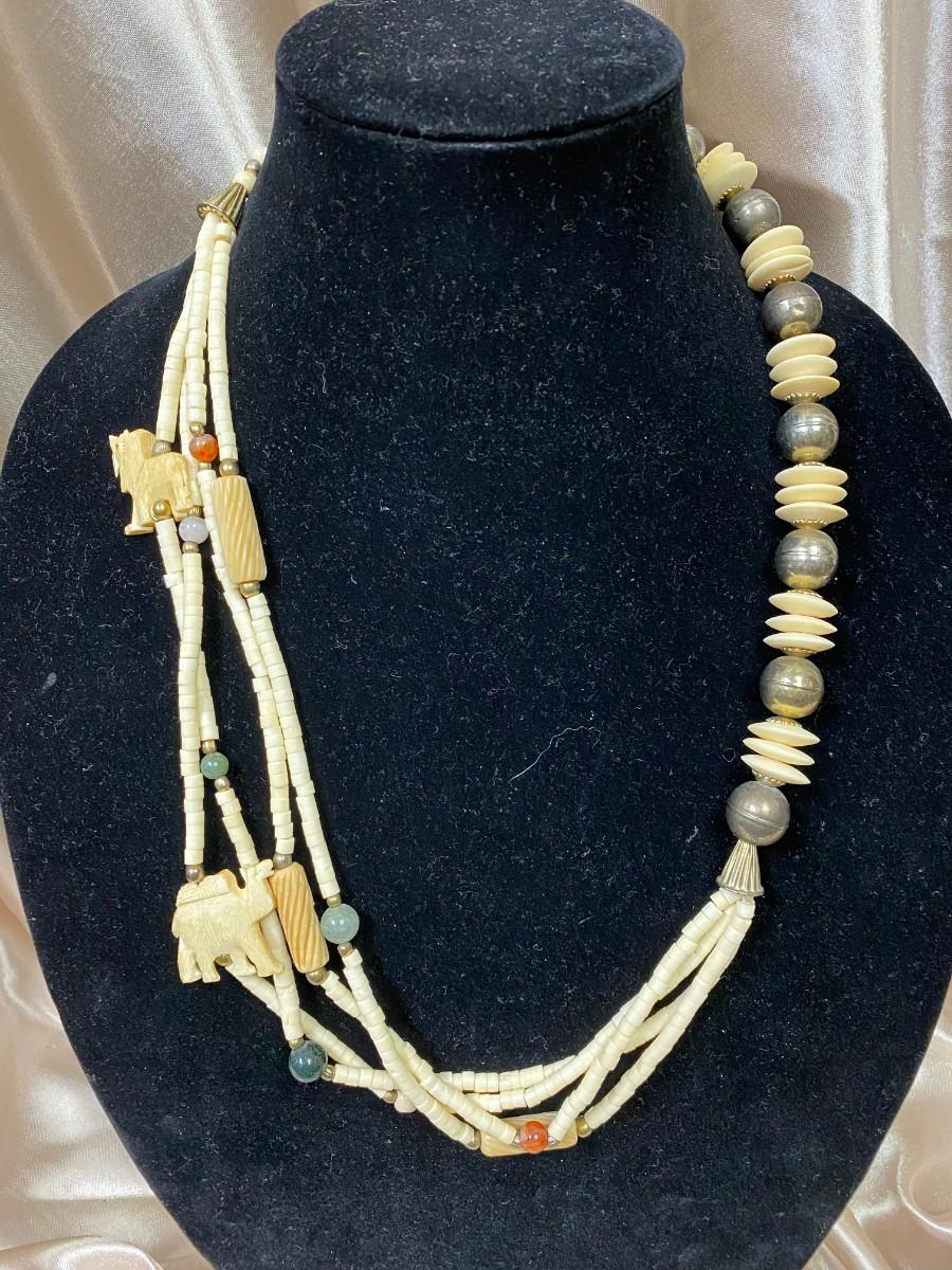 Beige necklace with a horse and a camel carved piece. Jade and gemstone accent pieces.