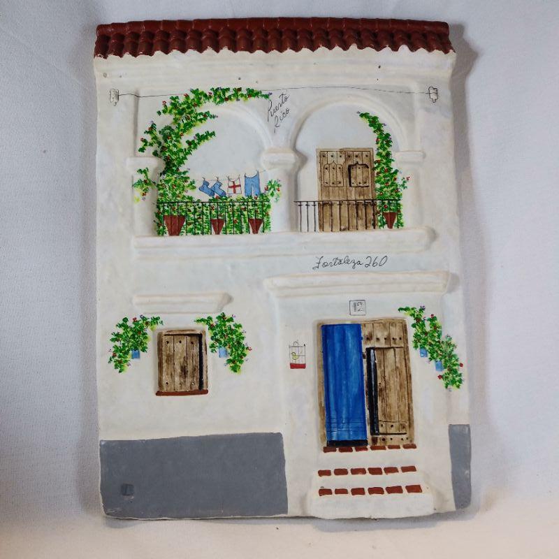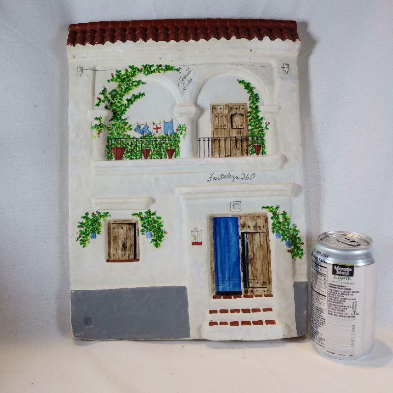 This unusual item is handmade and hand-painted from Puerto Rico. Client lived in the depicted house for 12 years. It is 15-inches tall X 11-inches wide and very heavy. It is in very good condition. A very cheerful painted plaque.