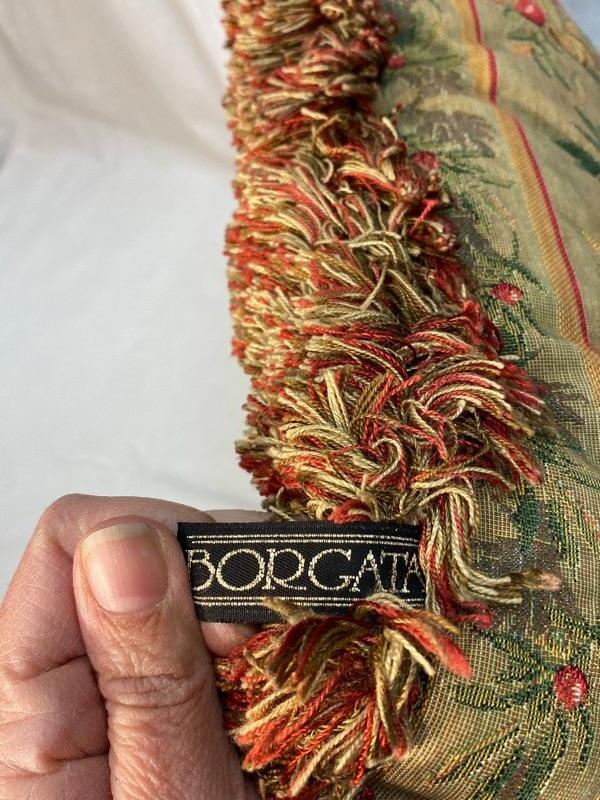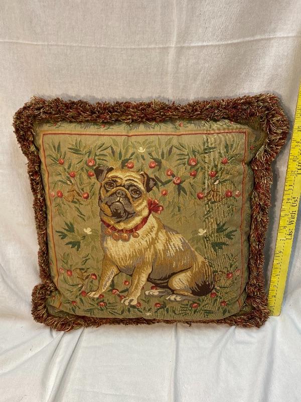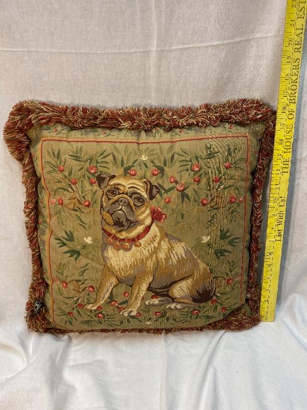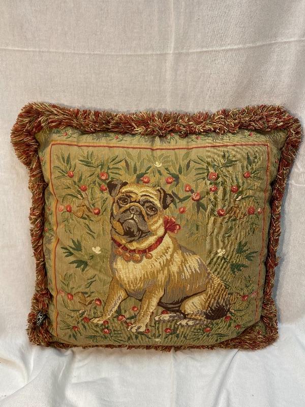Pug with bells on his collar double sided tapestry pillow. Fringed edge. Has a maker tag from Borgata. About 16" size. Good condition.