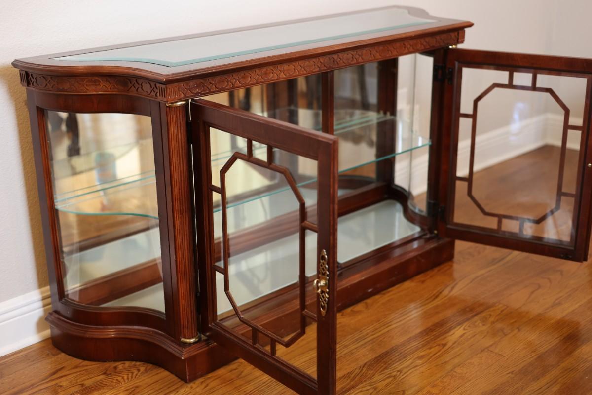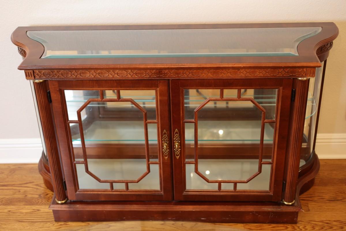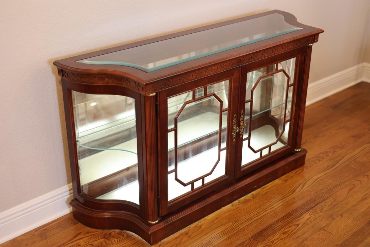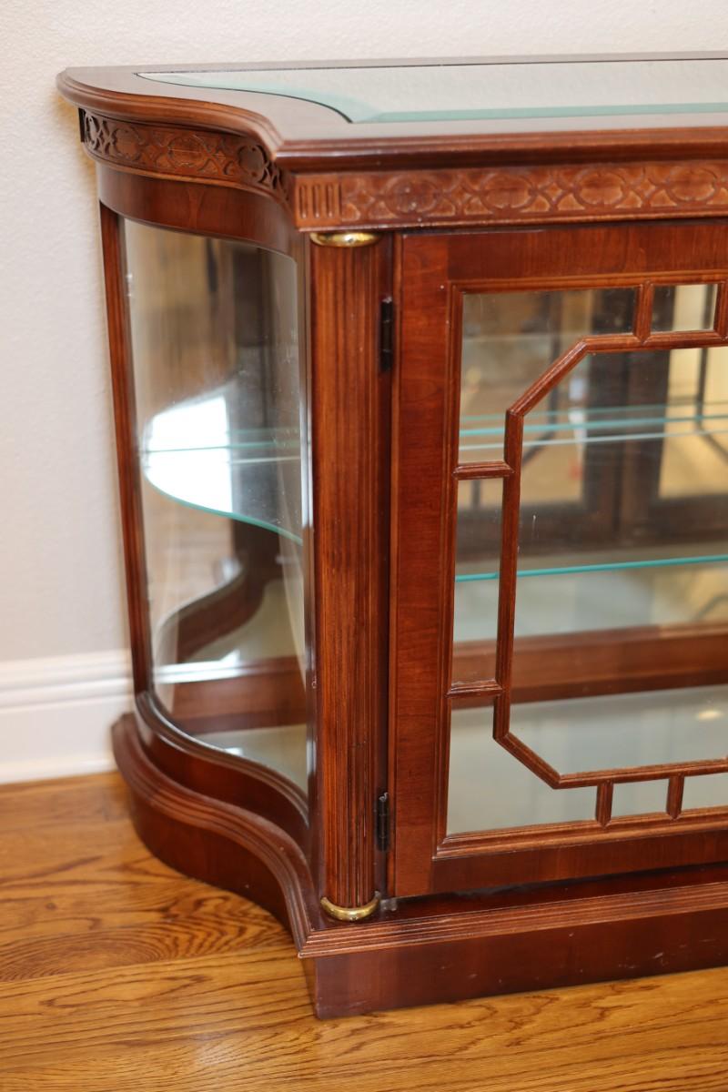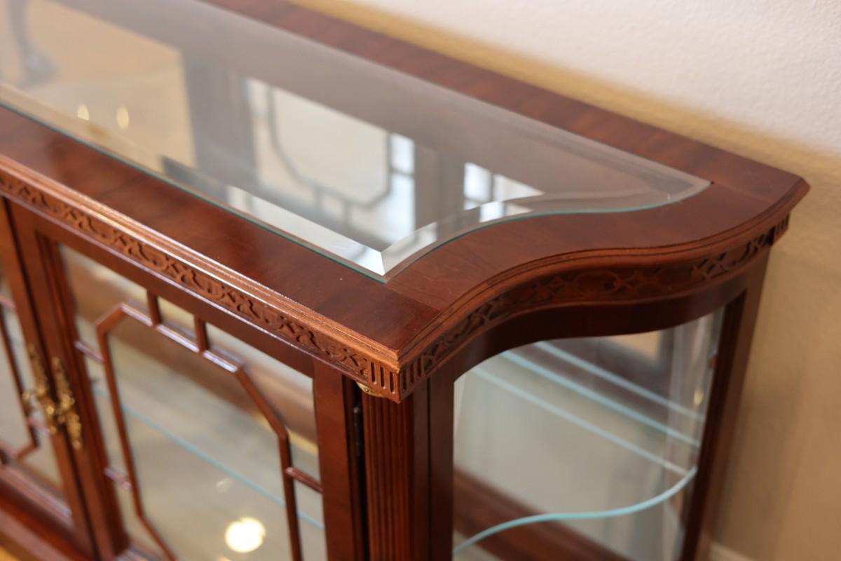 Pulaski Furniture illuminated curio cabinet featuring carved wood details, mirrored back, two glass shelves, and interior lighting at the base. Beautiful display piece in good working condition.
