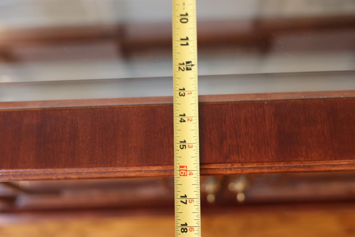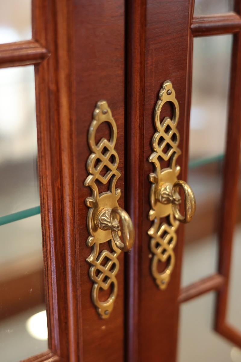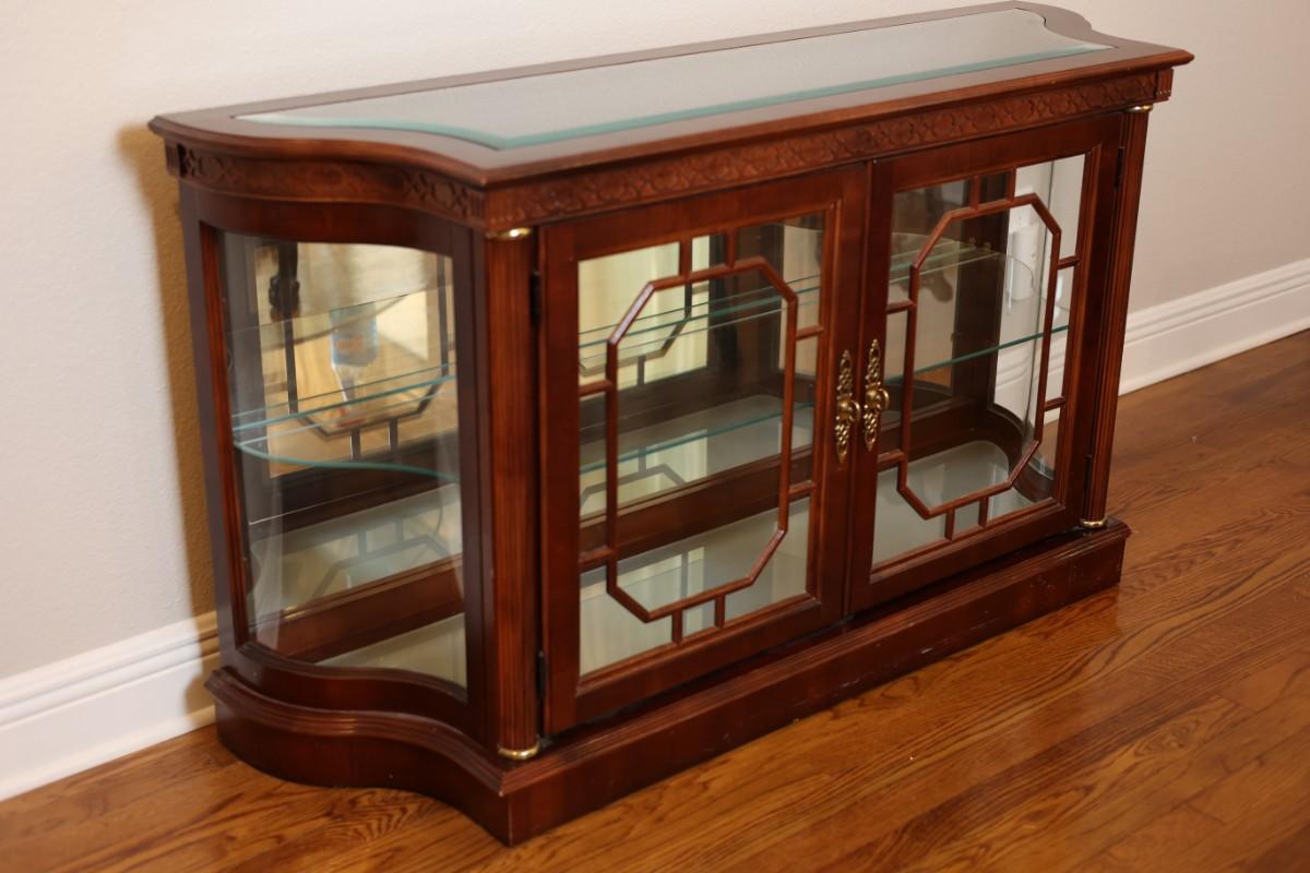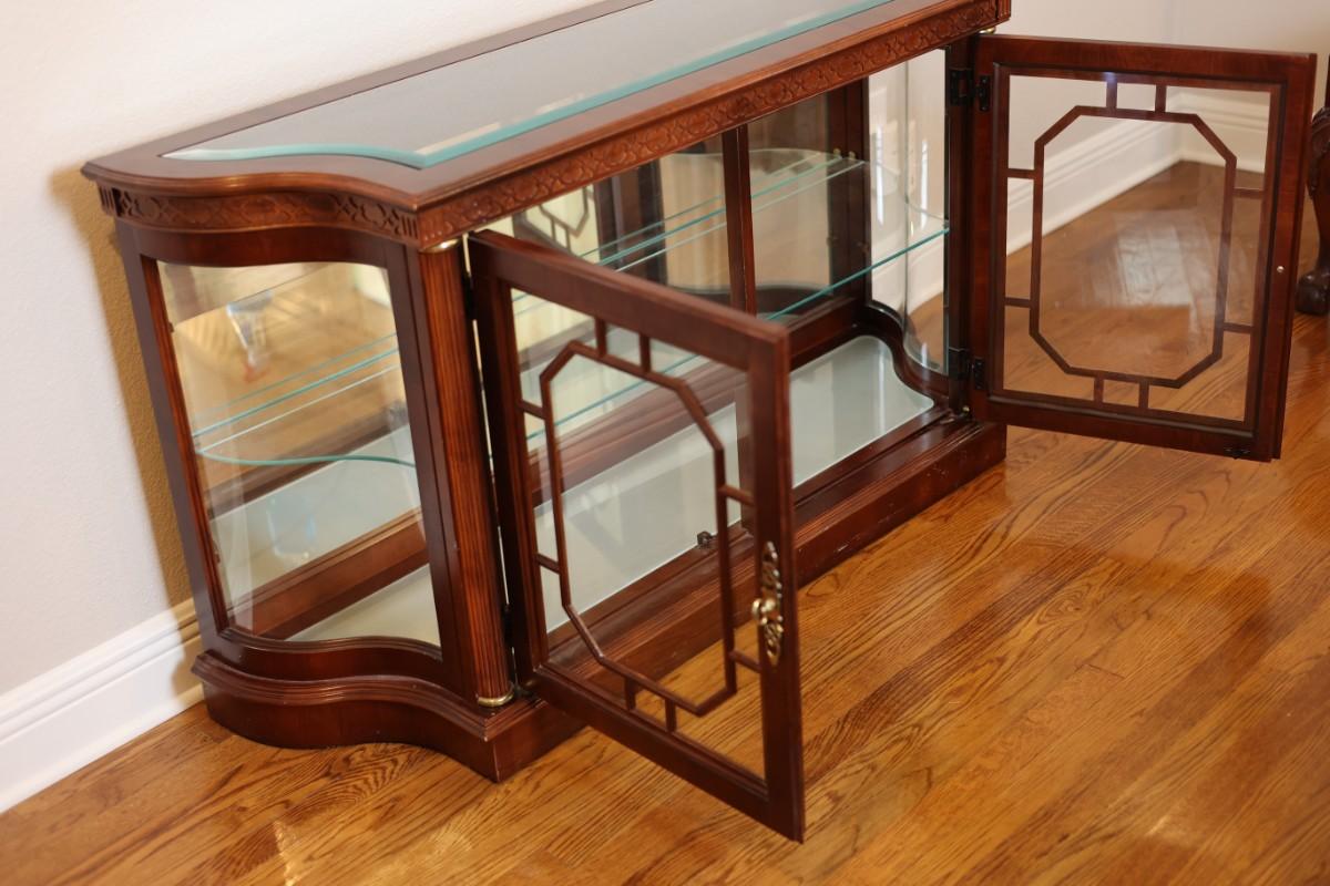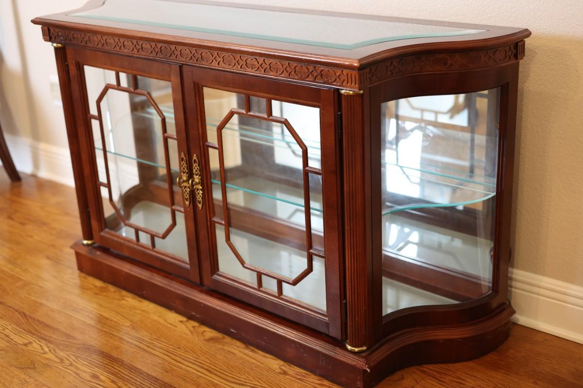 Pulaski Furniture illuminated curio cabinet featuring carved wood details, mirrored back, two glass shelves, and interior lighting at the base. Beautiful display piece in good working condition.