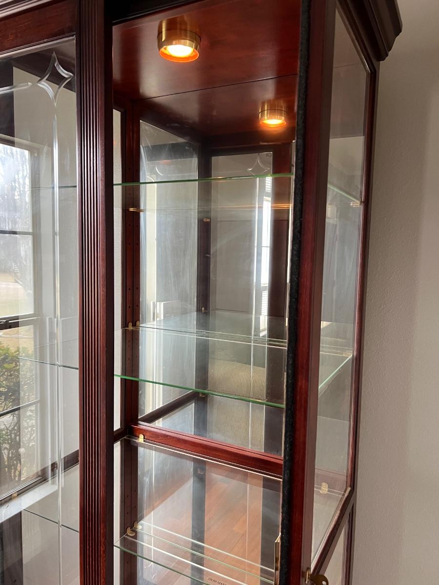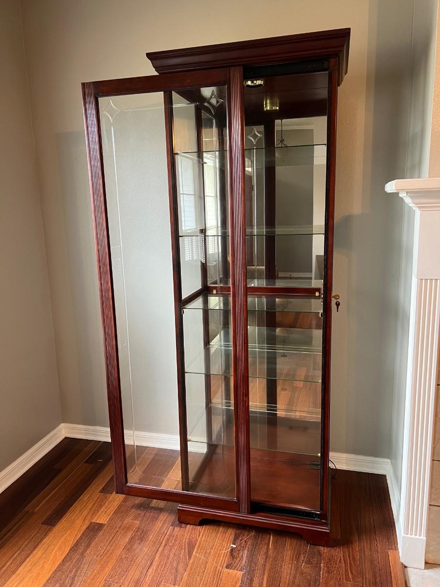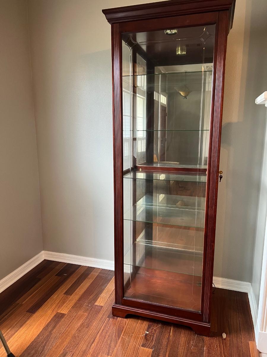 Lights up with two light settings, five glass shelves, with a key to lock. Cabinet measures 80 inches tall 26 1/2 inches wide 18 inches deep.