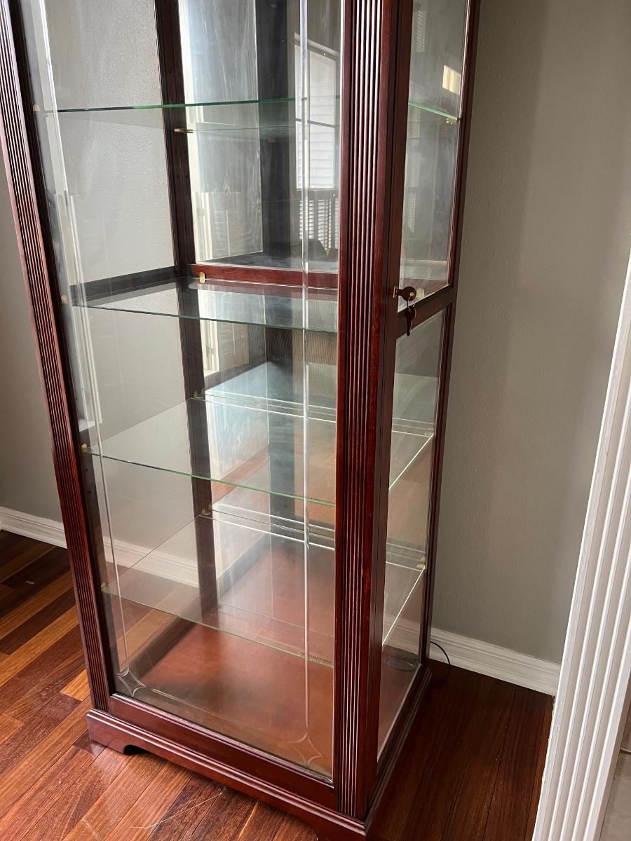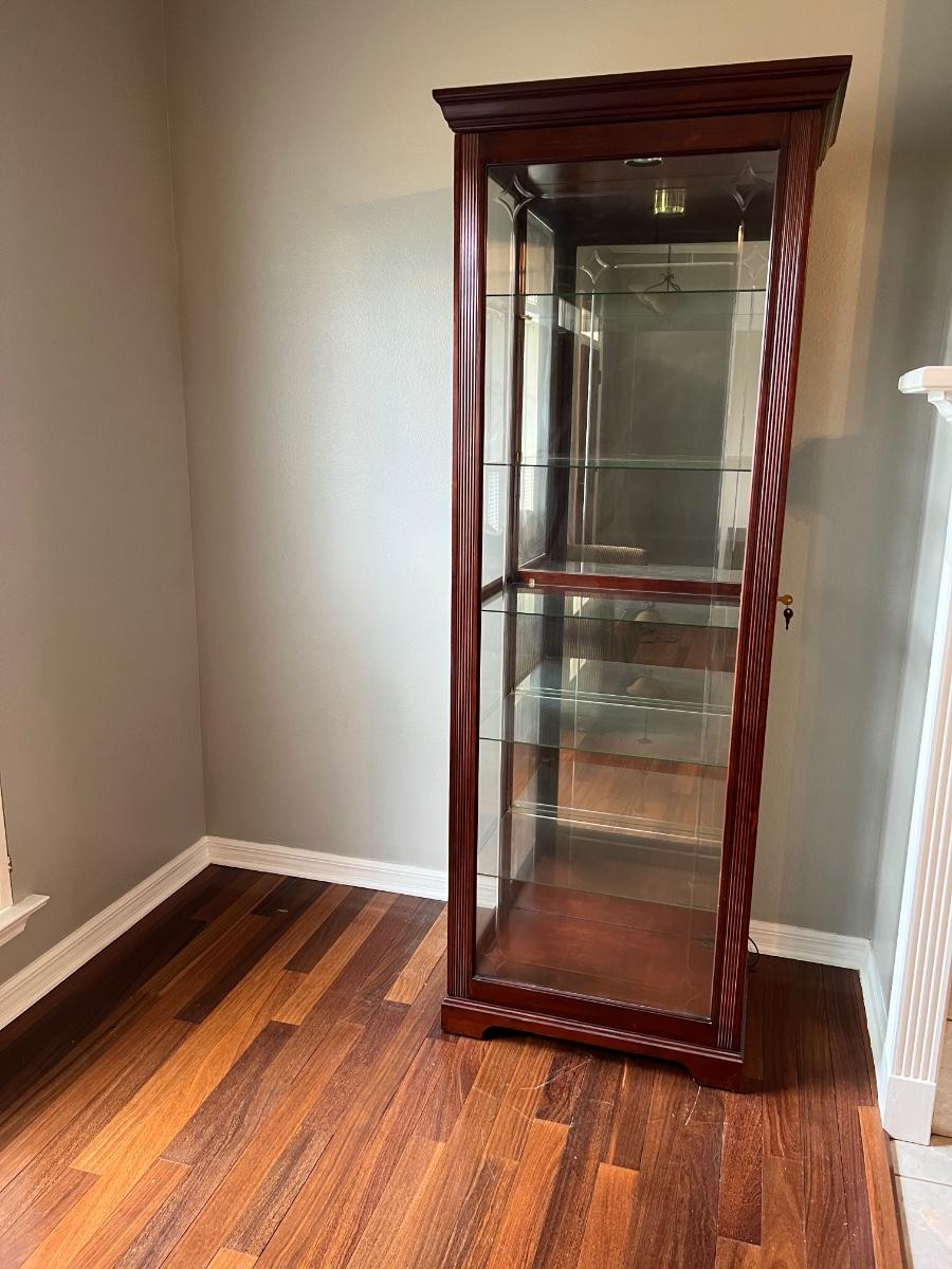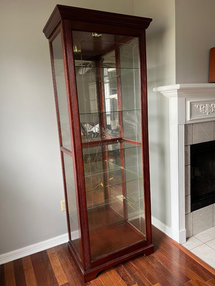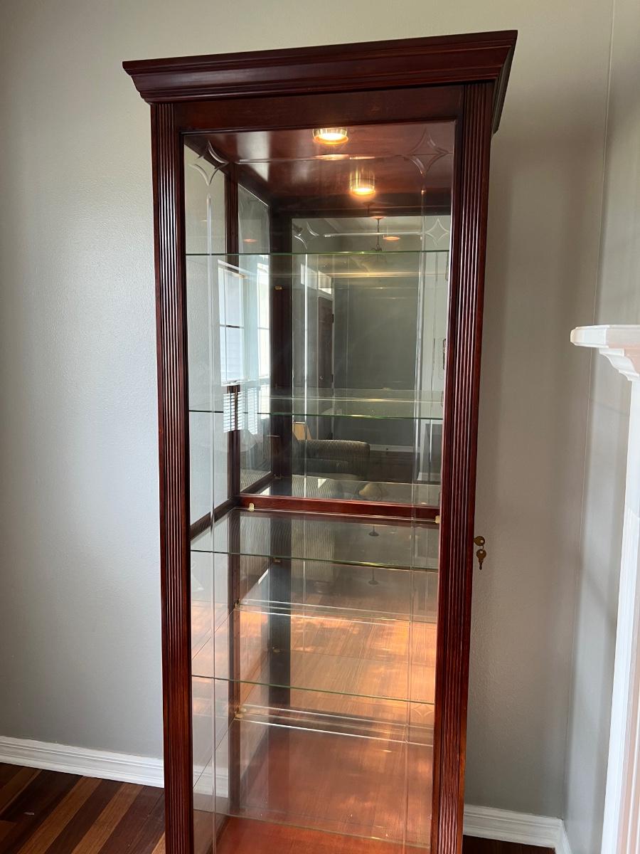 Lights up with two light settings, five glass shelves, with a key to lock. Cabinet measures 80 inches tall 26 1/2 inches wide 18 inches deep.