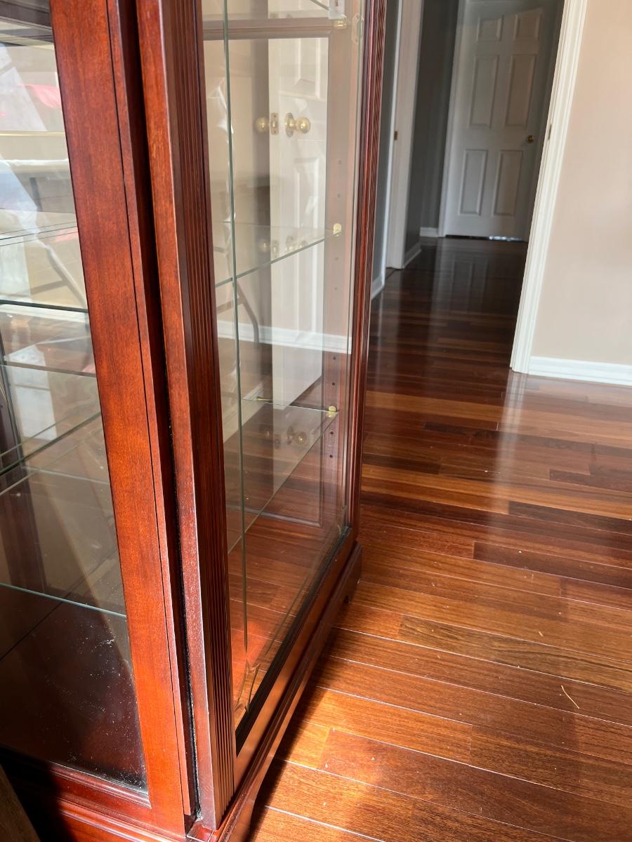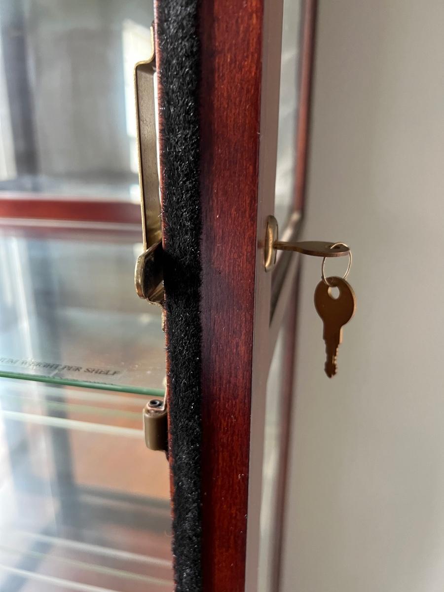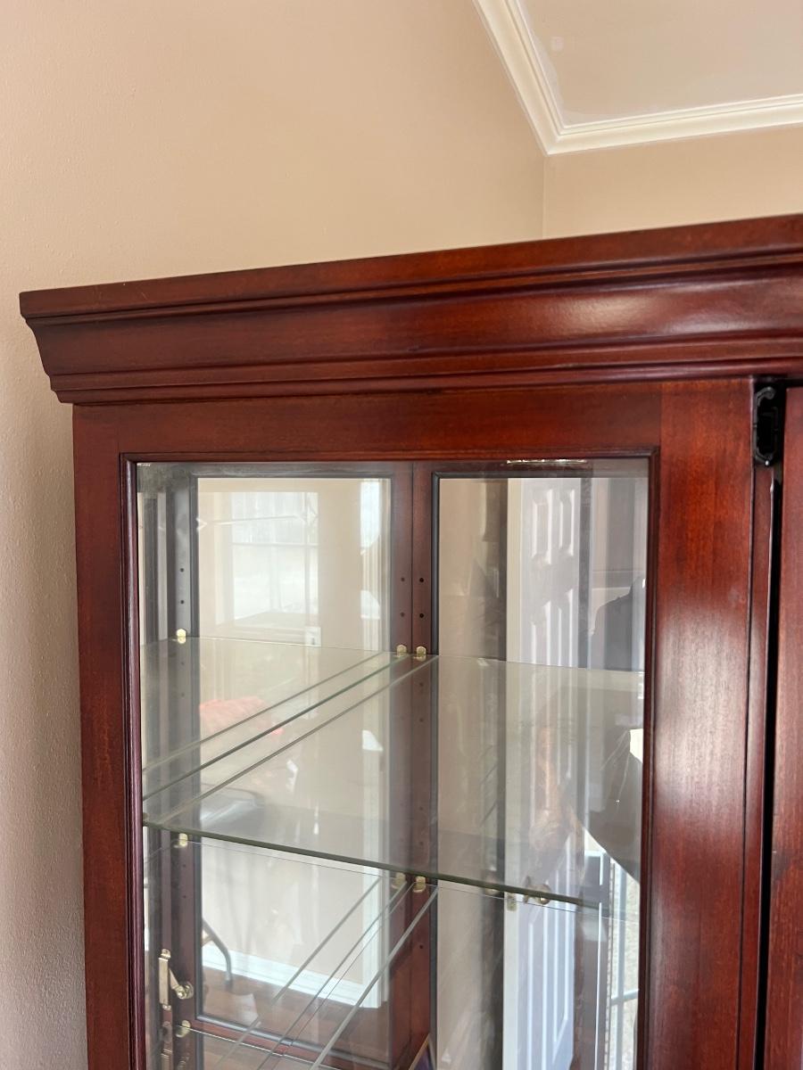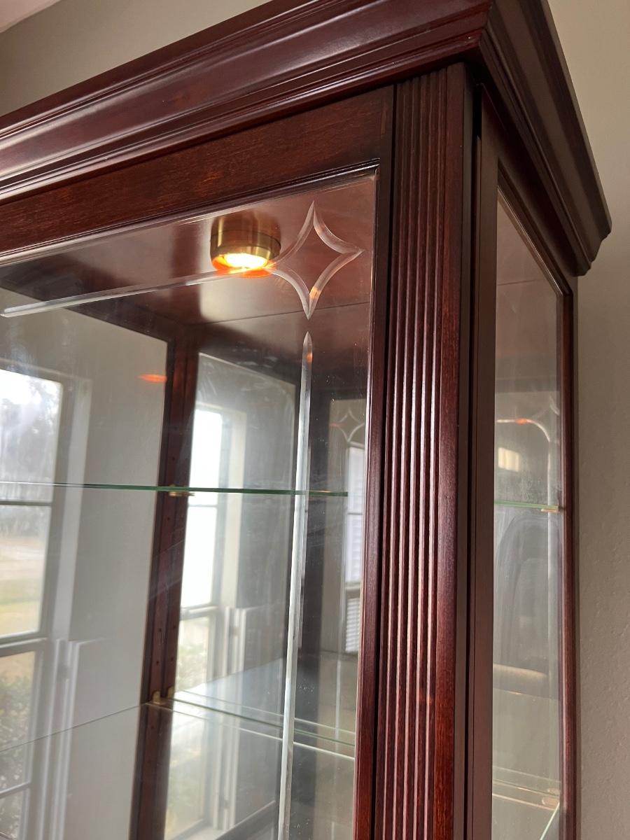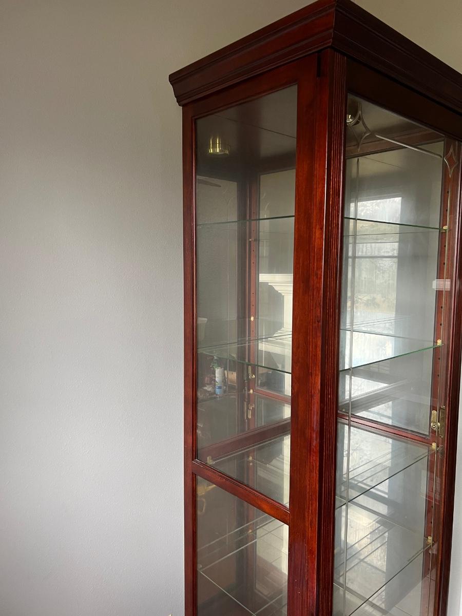 Lights up with two light settings, five glass shelves, with a key to lock. Cabinet measures 80 inches tall 26 1/2 inches wide 18 inches deep.