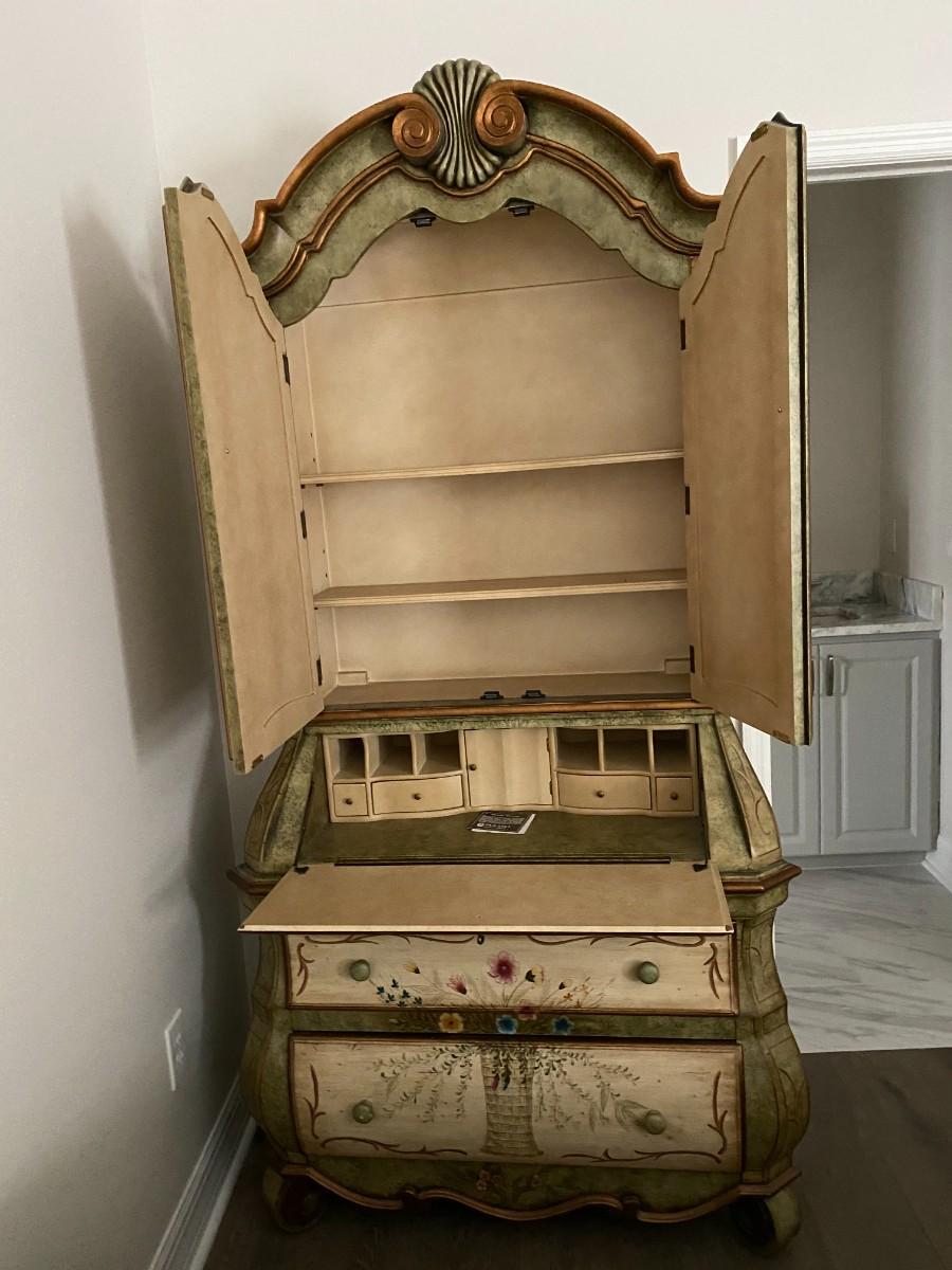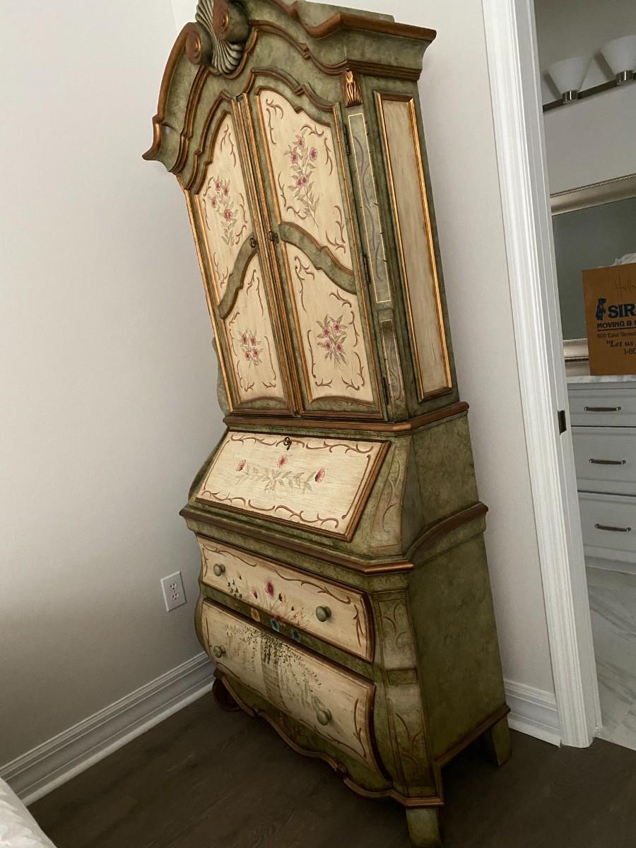 PULASKI PAINT DECORATED SECRETARY DESK, SLANT FRONT WITH BOOKCASE HUTCH, DRAWERS