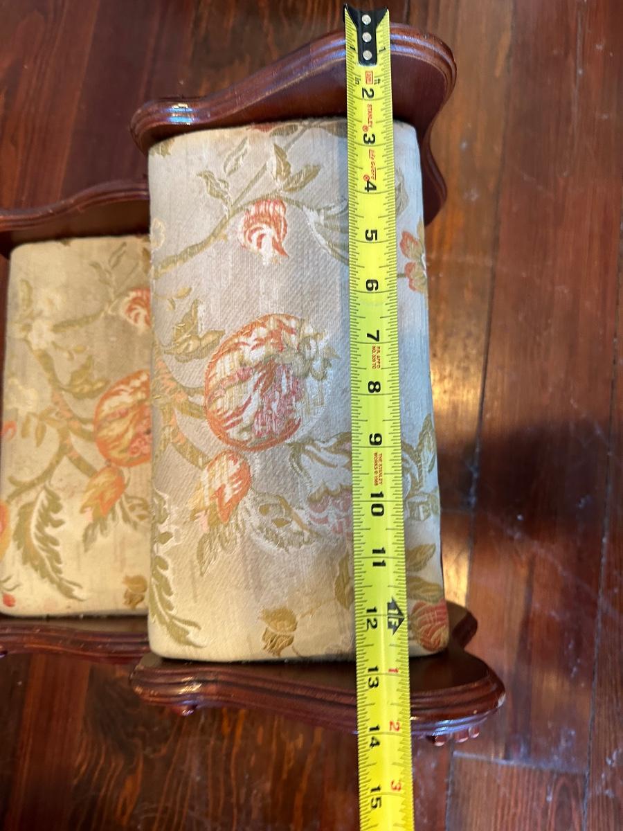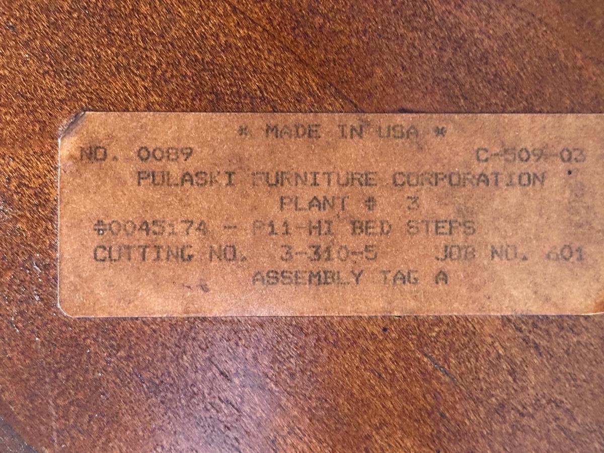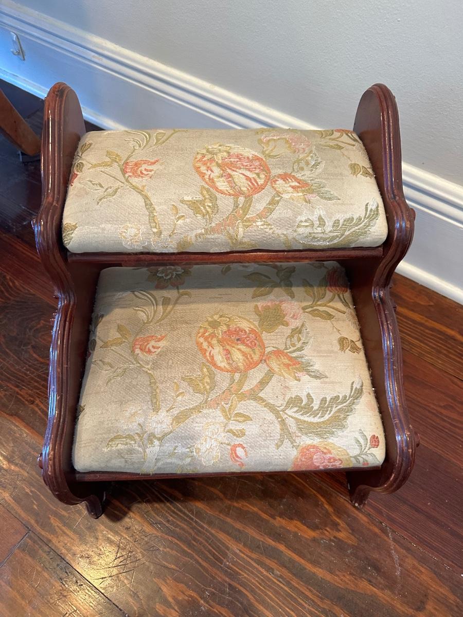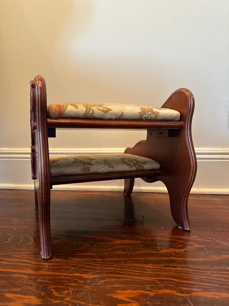 Pulaski two-step upholstered wooden stool with carved sides. Solid and decorative. Label on underside. Upholstery has wear, see photos.