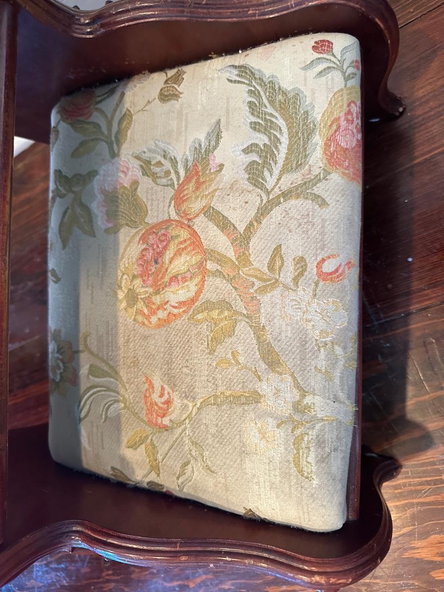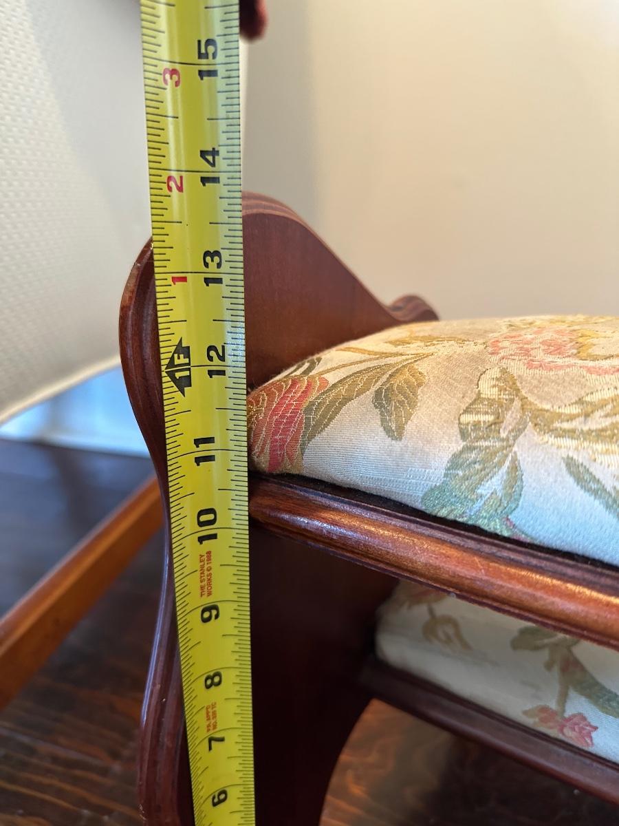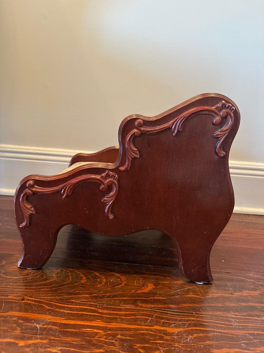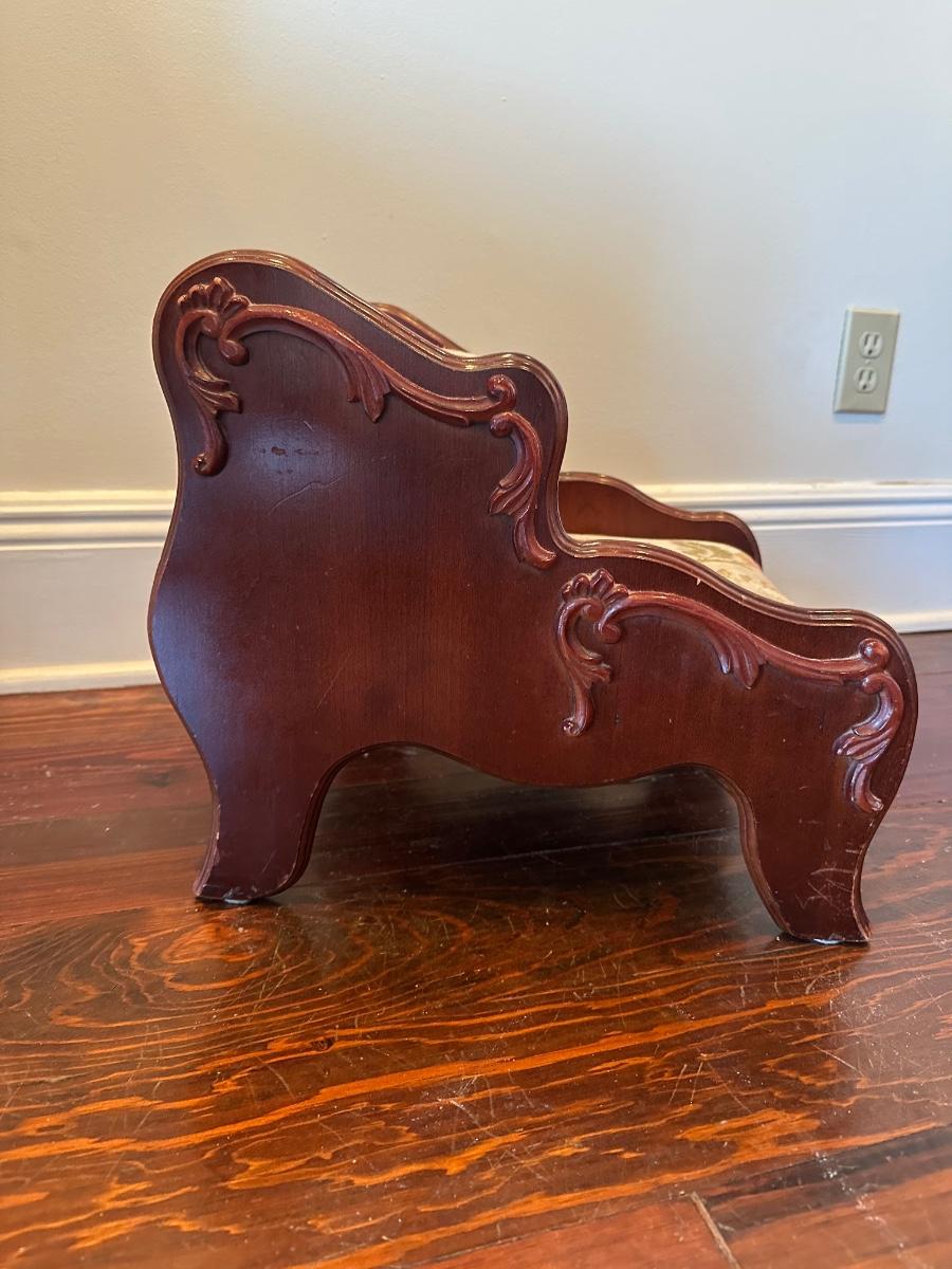 Pulaski two-step upholstered wooden stool with carved sides. Solid and decorative. Label on underside. Upholstery has wear, see photos.