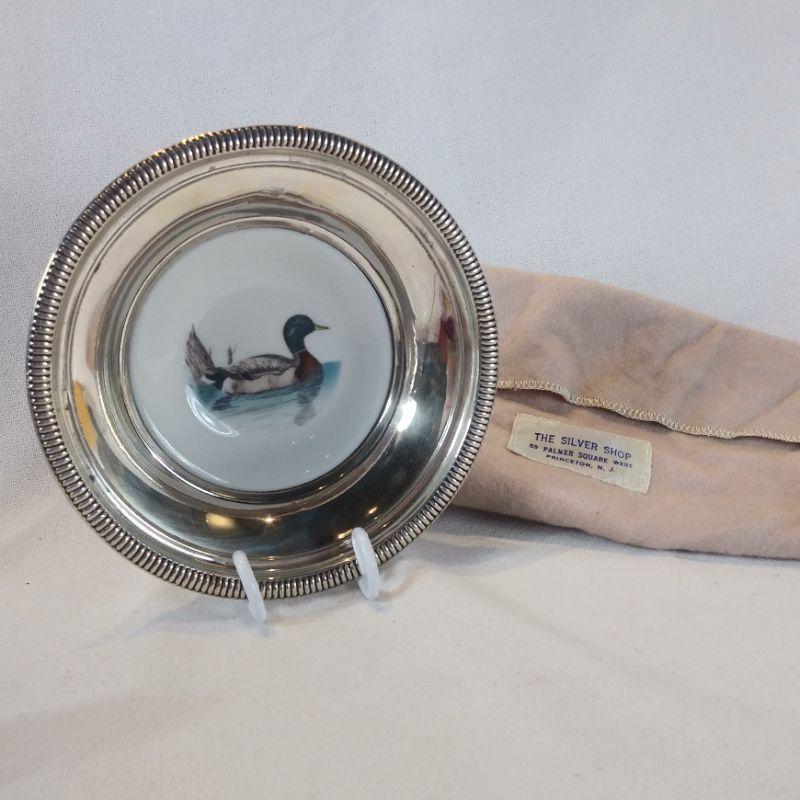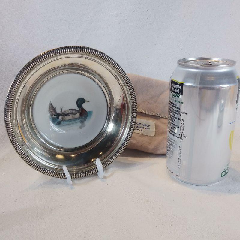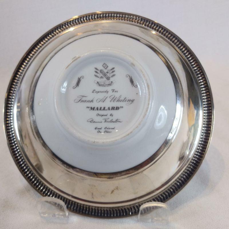 This is an antique Dennis Puleston Silver, Delano Studio's, Mallard Duck Dish by Frank M. Whiting. Center of dish is porcelain with the hand-painted Mallard. Long Island, NY. We are quite certain that this item is unmarked sterling silver. Bowl measures 5 1/2-inches in diameter. Very good condition, comes with the silver anti-tarnish bag.