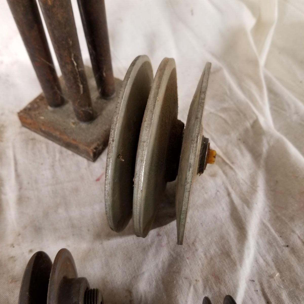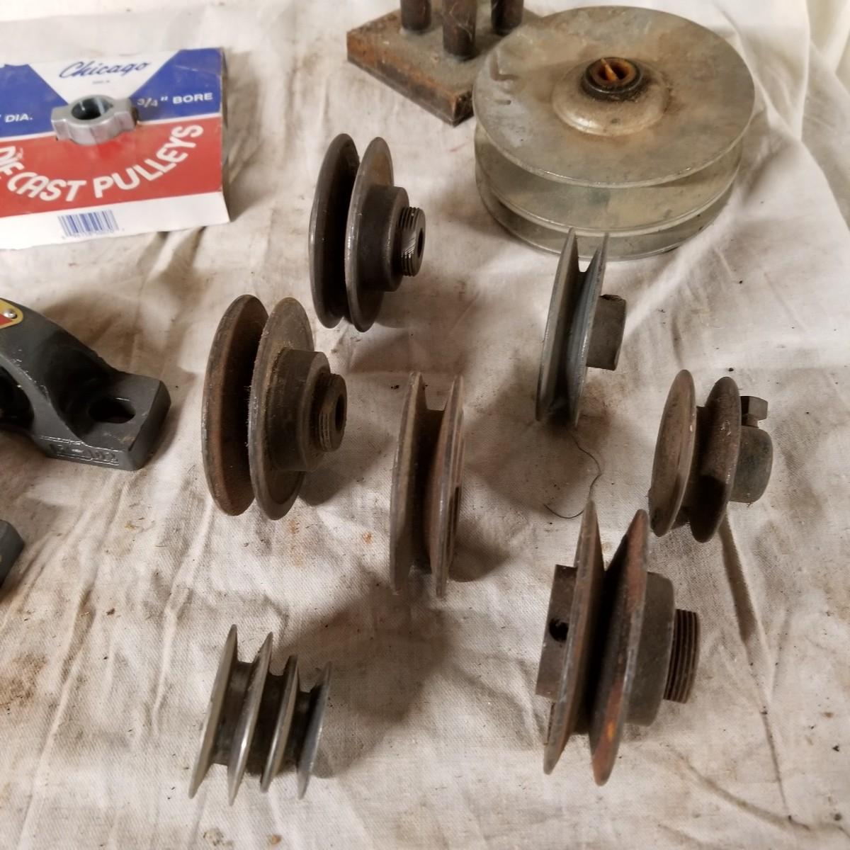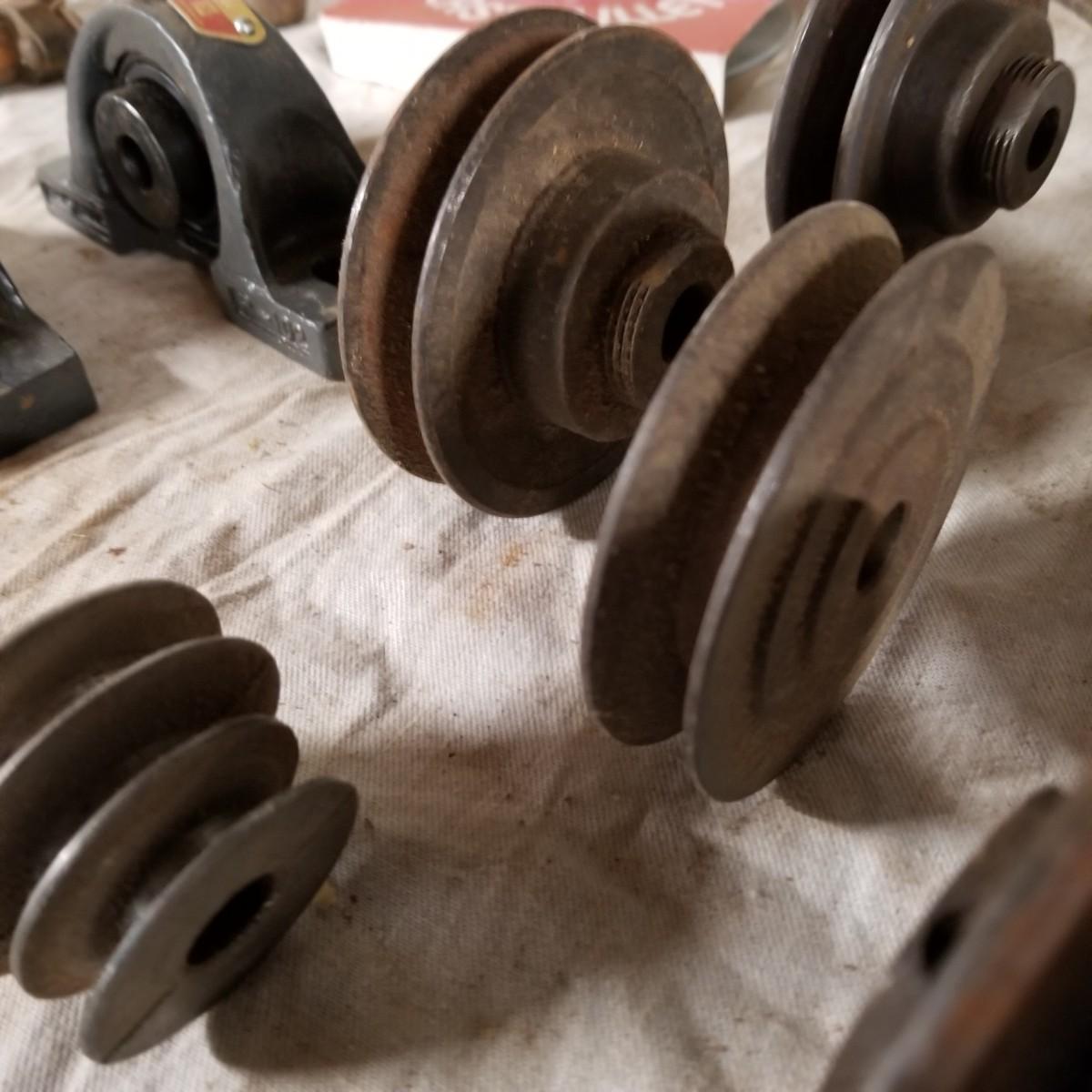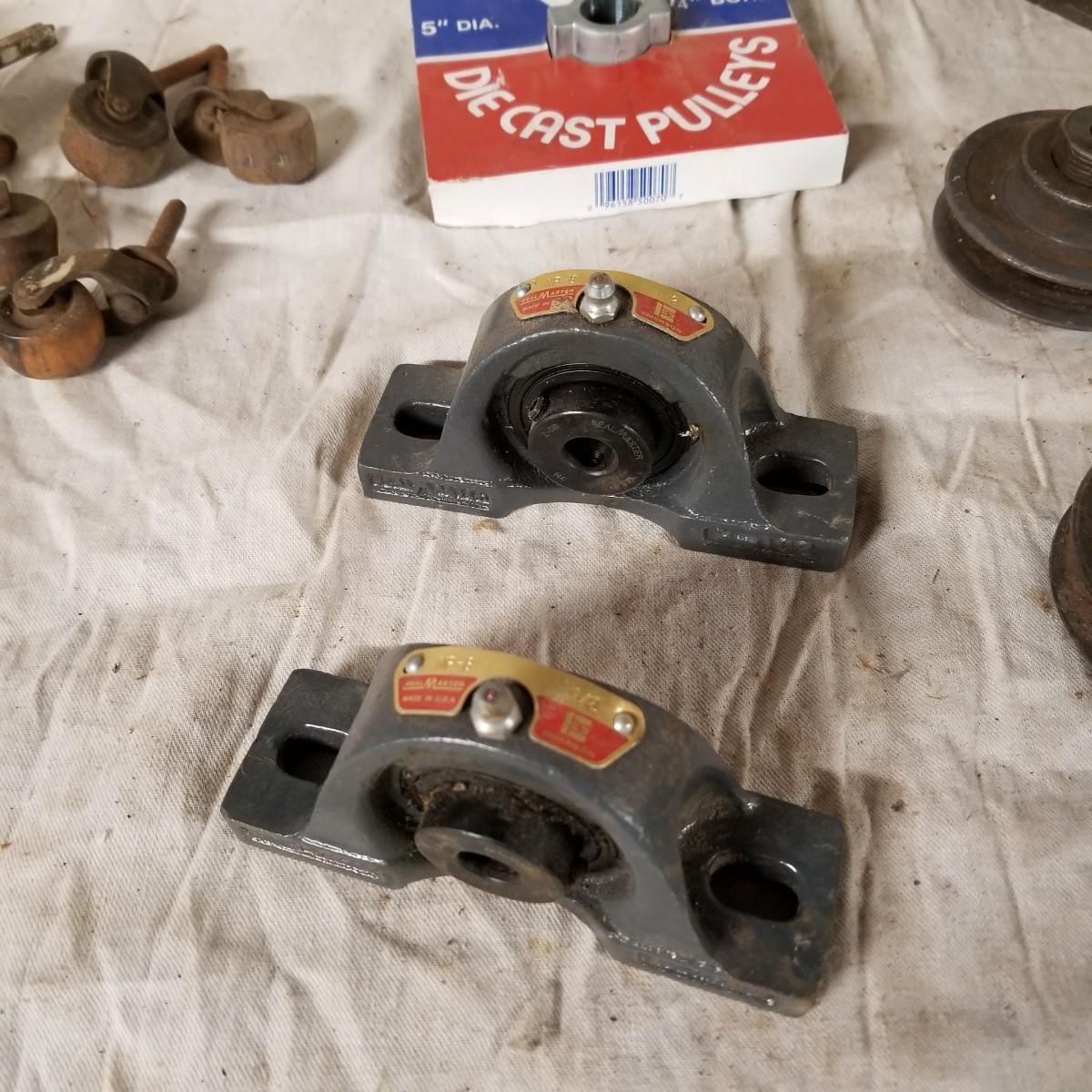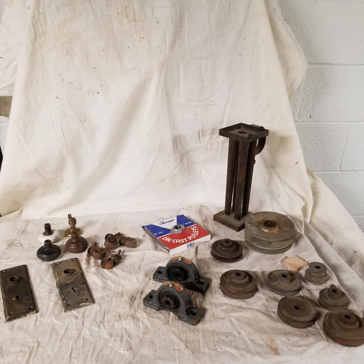 Assortment of pulleys, from 2" d up to 5" d.  Some singles, one double, one triple.  Most all are 1/2" shaft except for Chicago item which is 3/4".  Also old door hardware,  four knobs and two faceplates.  Four wood wheel casters, 1" d, and two Sealmaster ball bearing pillow blocks, 1/2" bore with grease fittings.  One vintage 9" tin candle mold to make four at a time.  Shipping  available.
