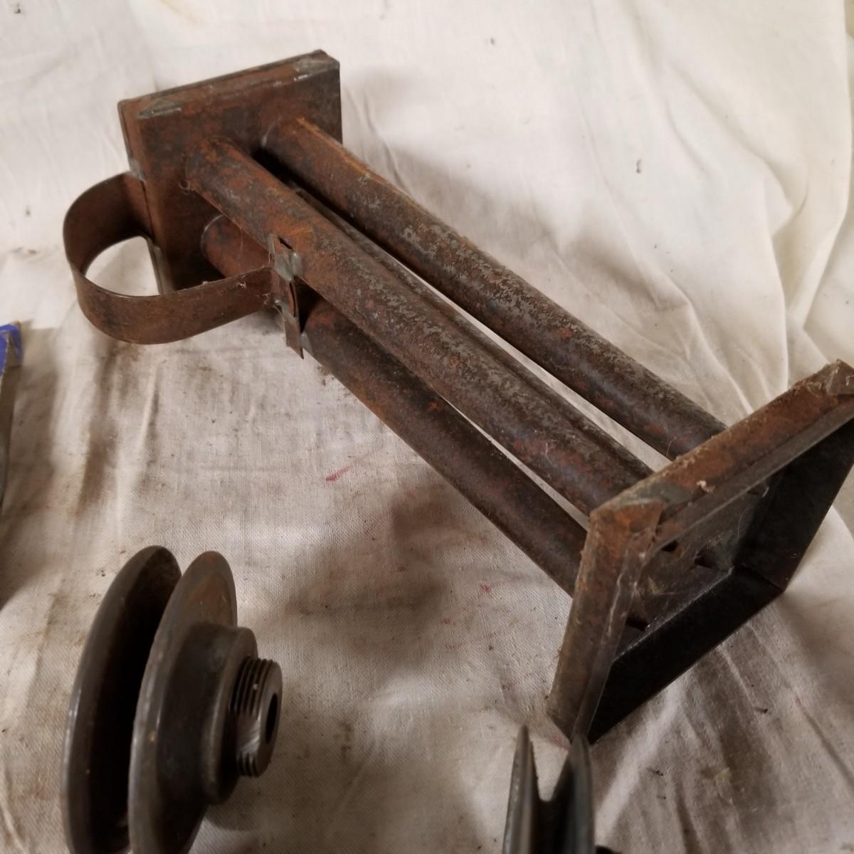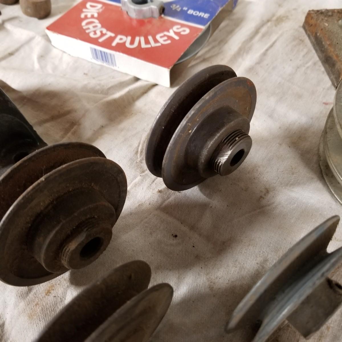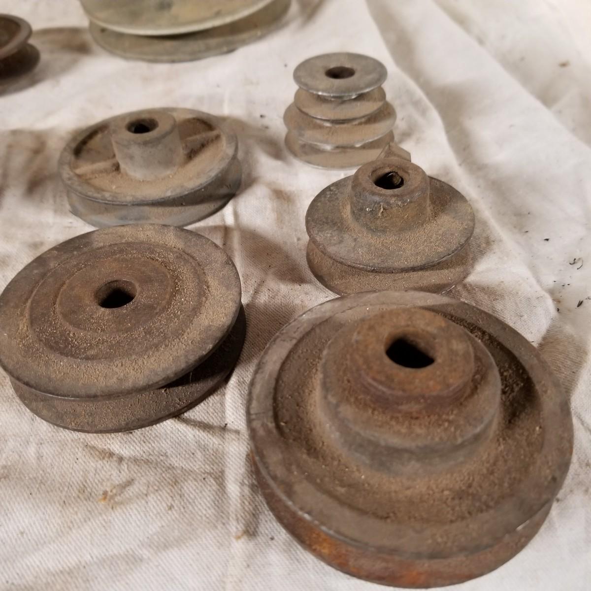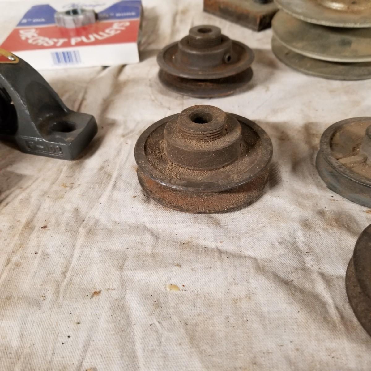 Assortment of pulleys, from 2" d up to 5" d.  Some singles, one double, one triple.  Most all are 1/2" shaft except for Chicago item which is 3/4".  Also old door hardware,  four knobs and two faceplates.  Four wood wheel casters, 1" d, and two Sealmaster ball bearing pillow blocks, 1/2" bore with grease fittings.  One vintage 9" tin candle mold to make four at a time.  Shipping  available.